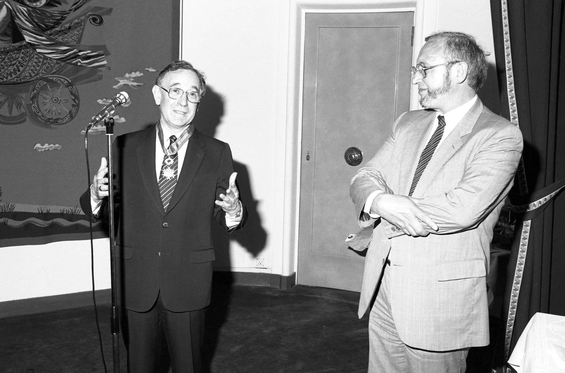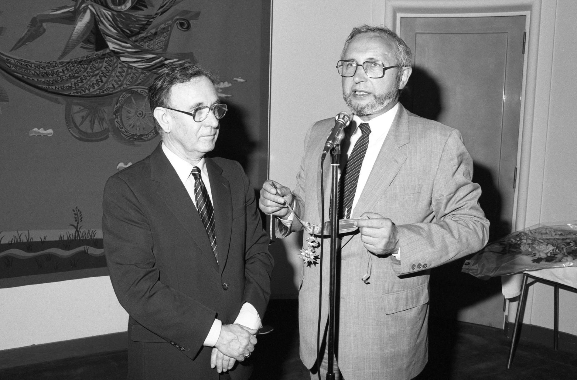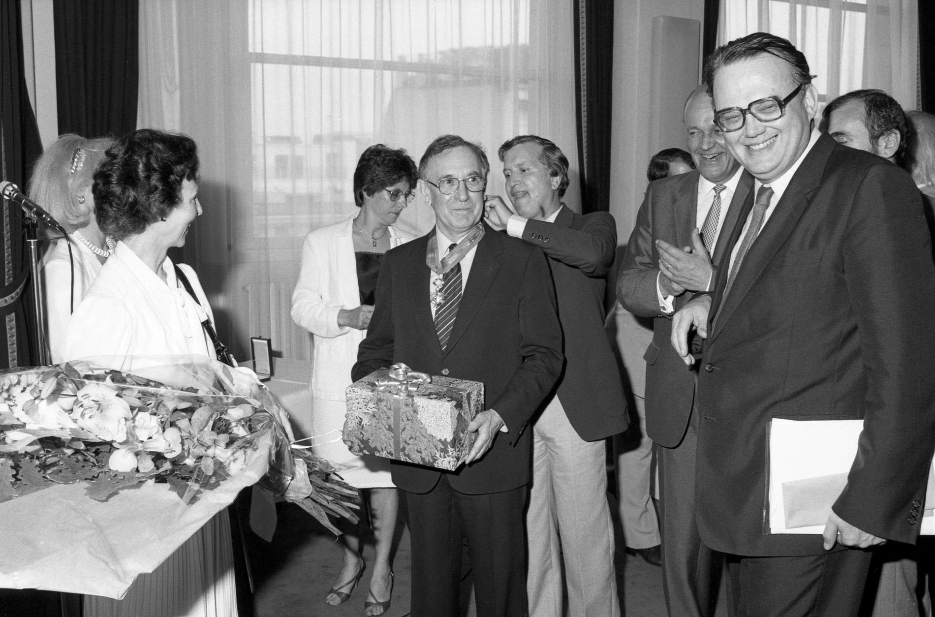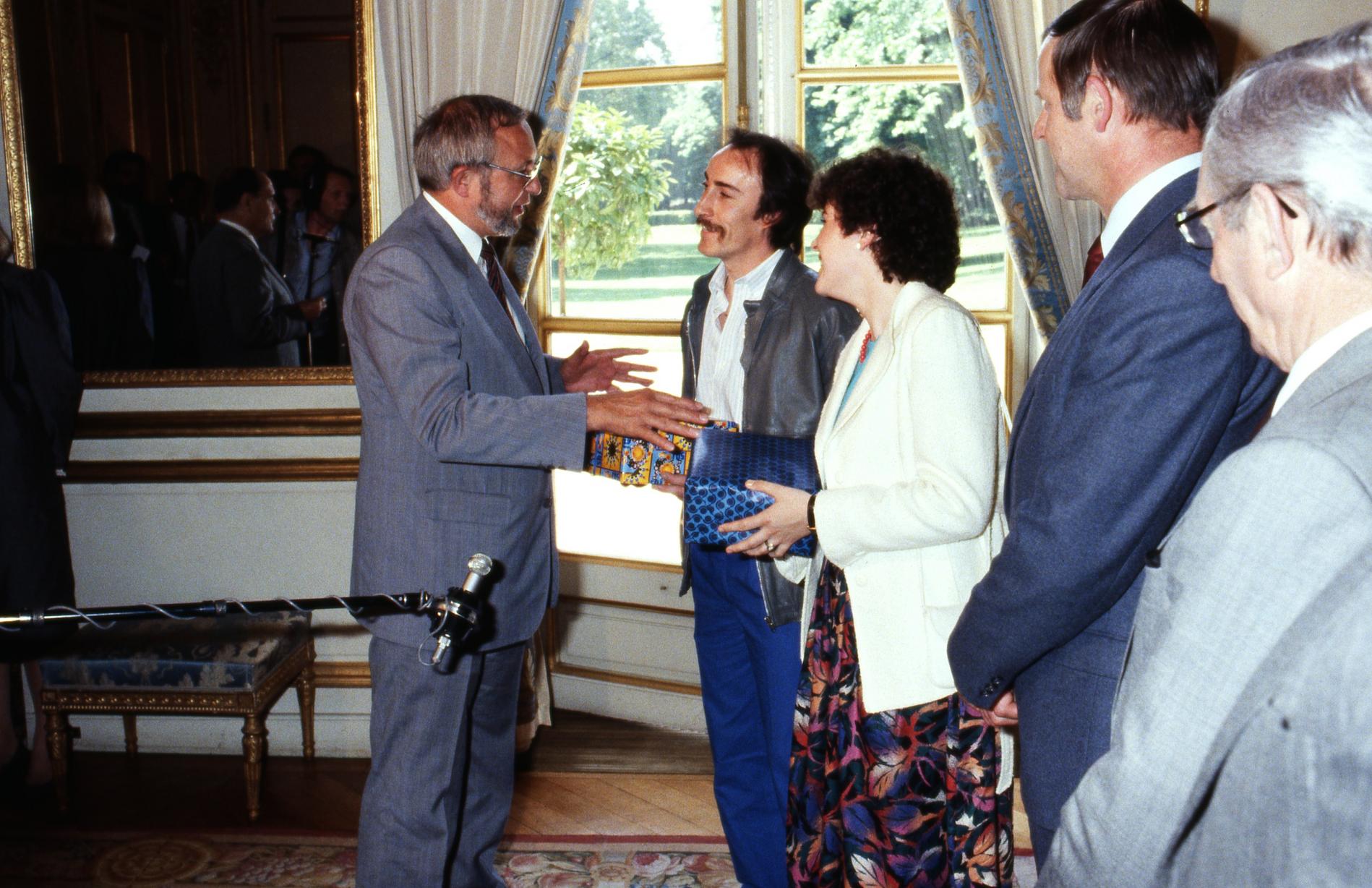 Ci-dessus : célébration du 20 millionième abonné au téléphone français, au Palais de l'Élysée, par M. le Président de la République - François Mitterrand.