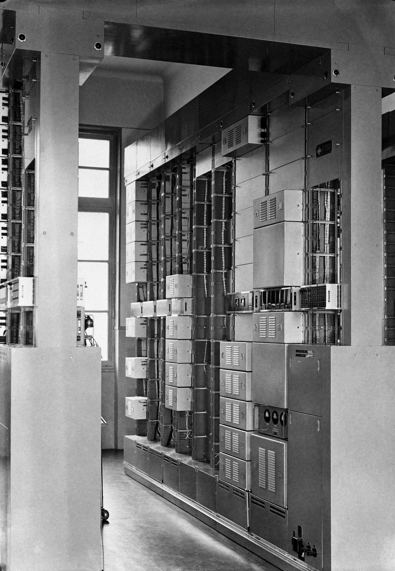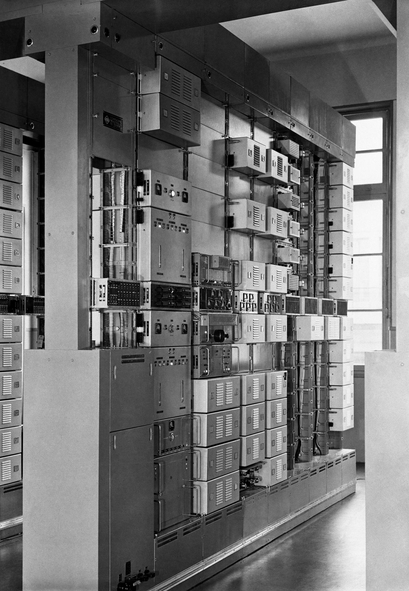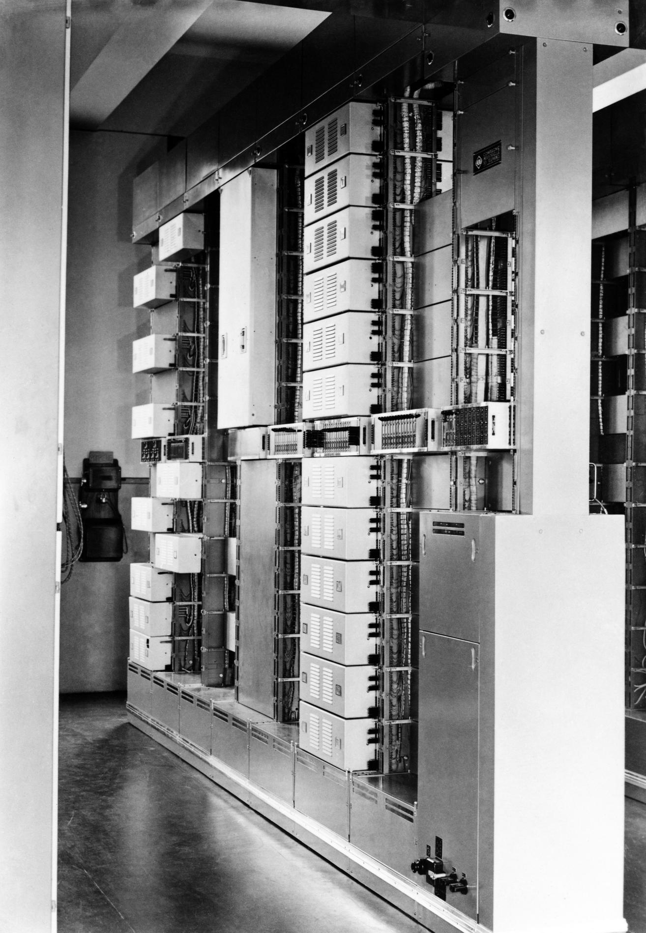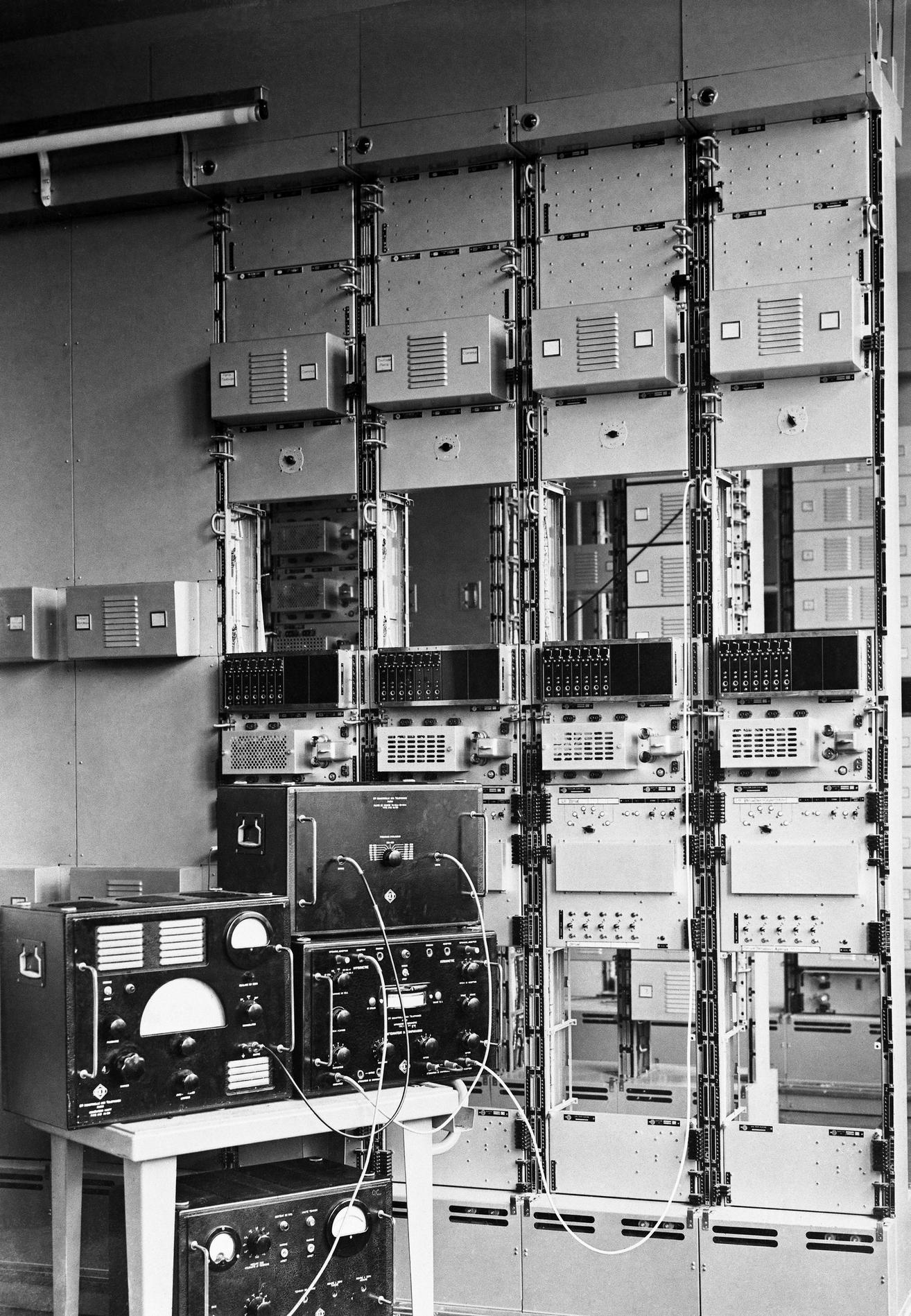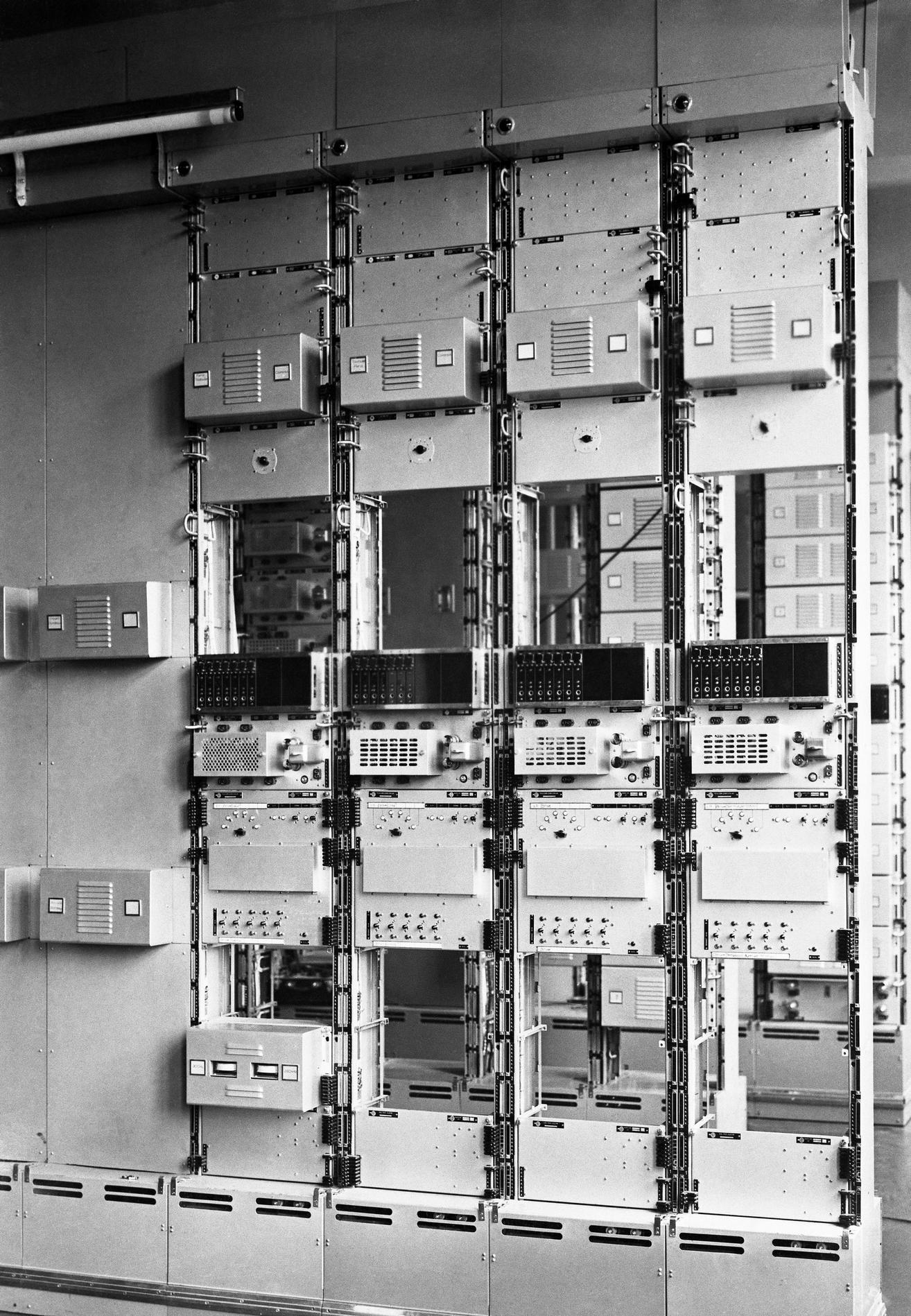 En haut, à droite sur la baie la plus à droite, nous distinguons 8 rangées de tubes électroniques à effet thermoïonique, utilisés pour l'amplification, la modulation et la démodulation des signaux téléphoniques transmis.