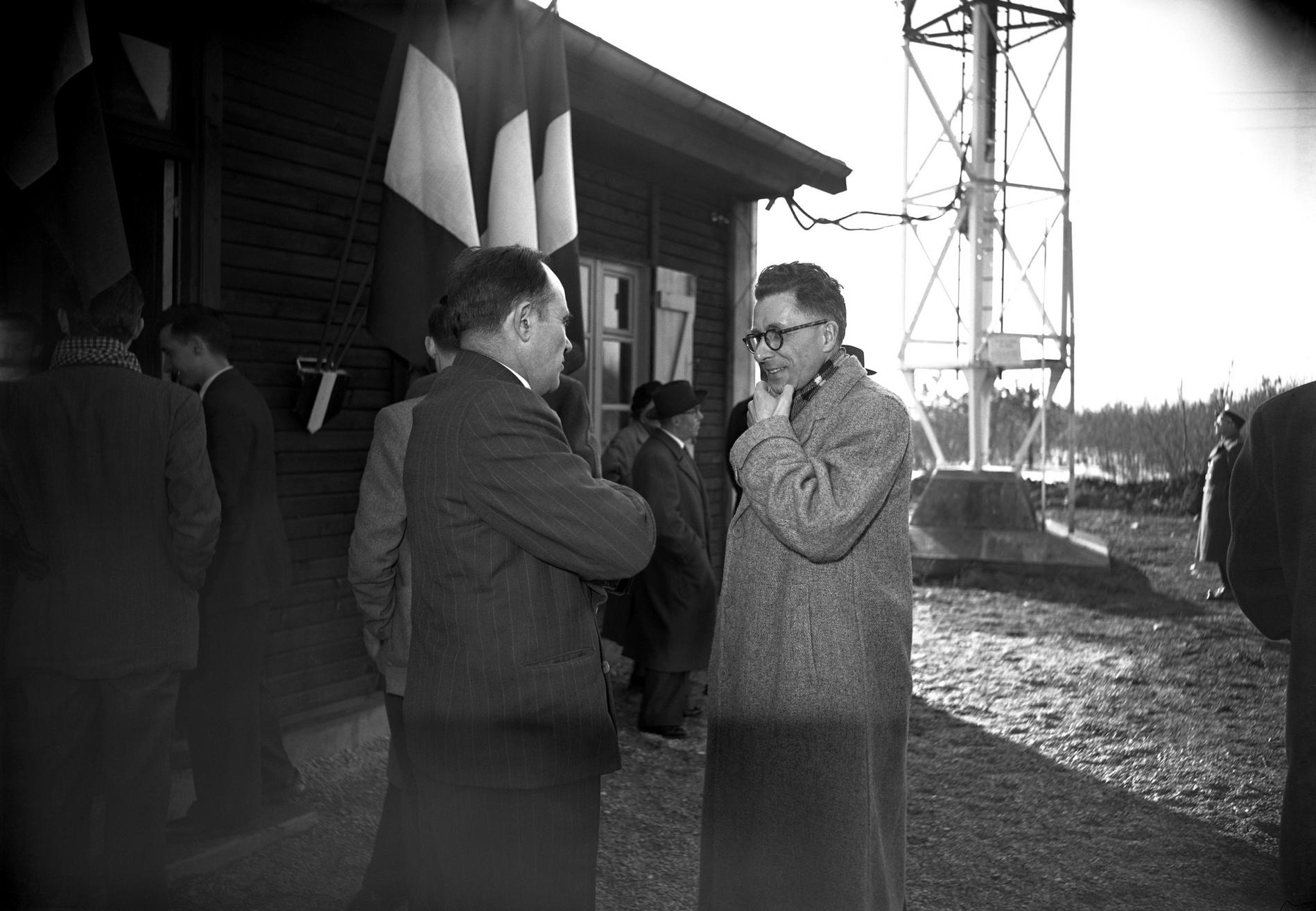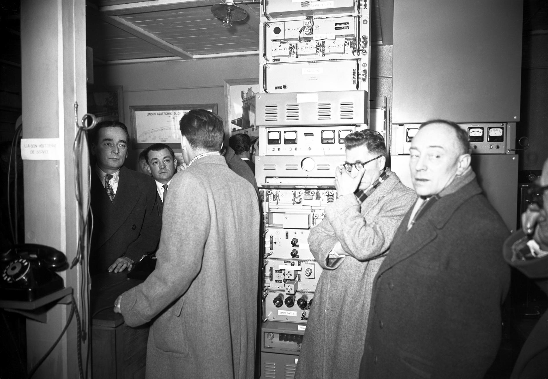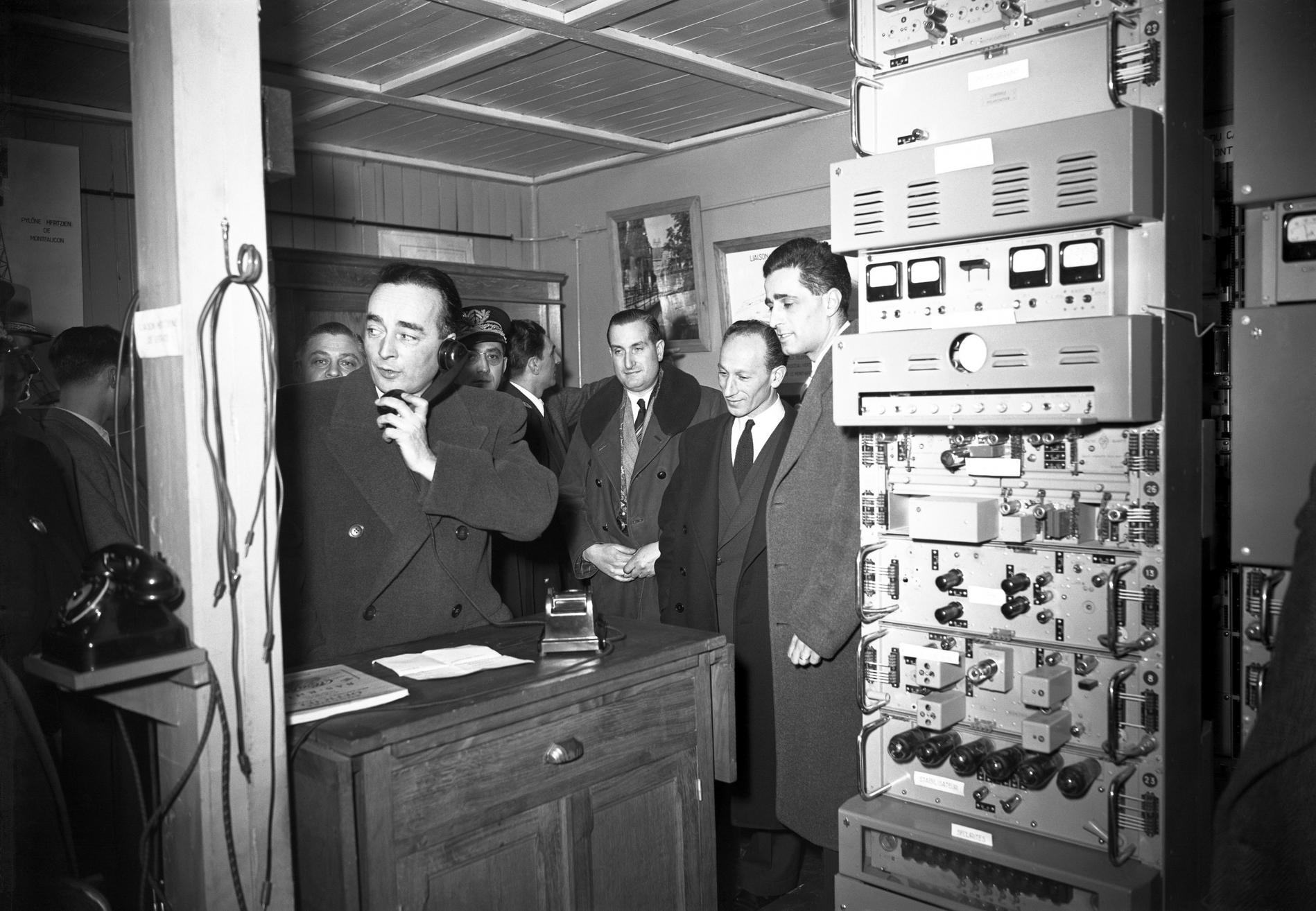 Ci-dessus : M. le Ministre des PTT - Jean Letourneau en train d'essayer le premier équipement expérimental de téléphonie à Faisceau Hertzien à Montmorency le 19 avril 1946.