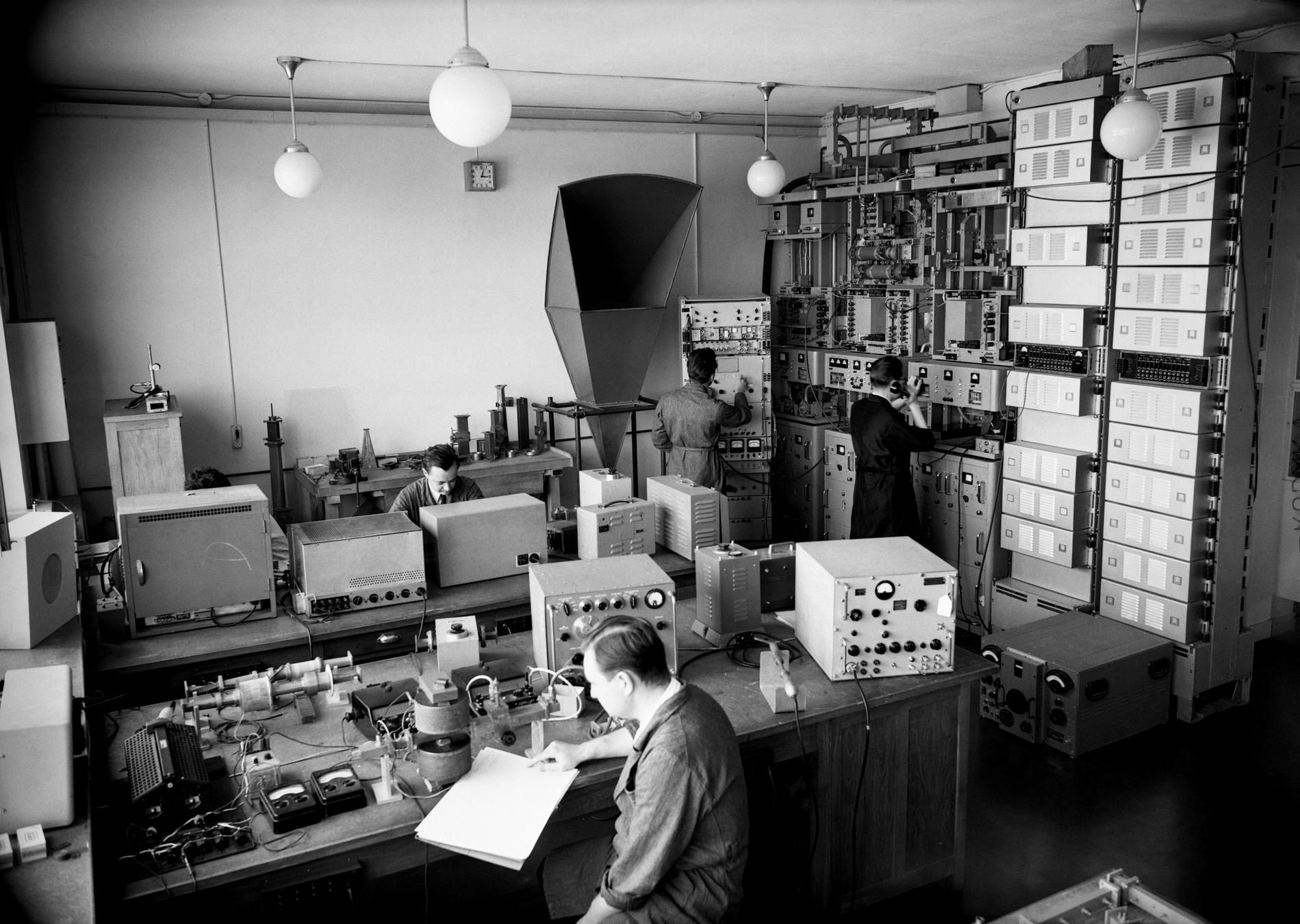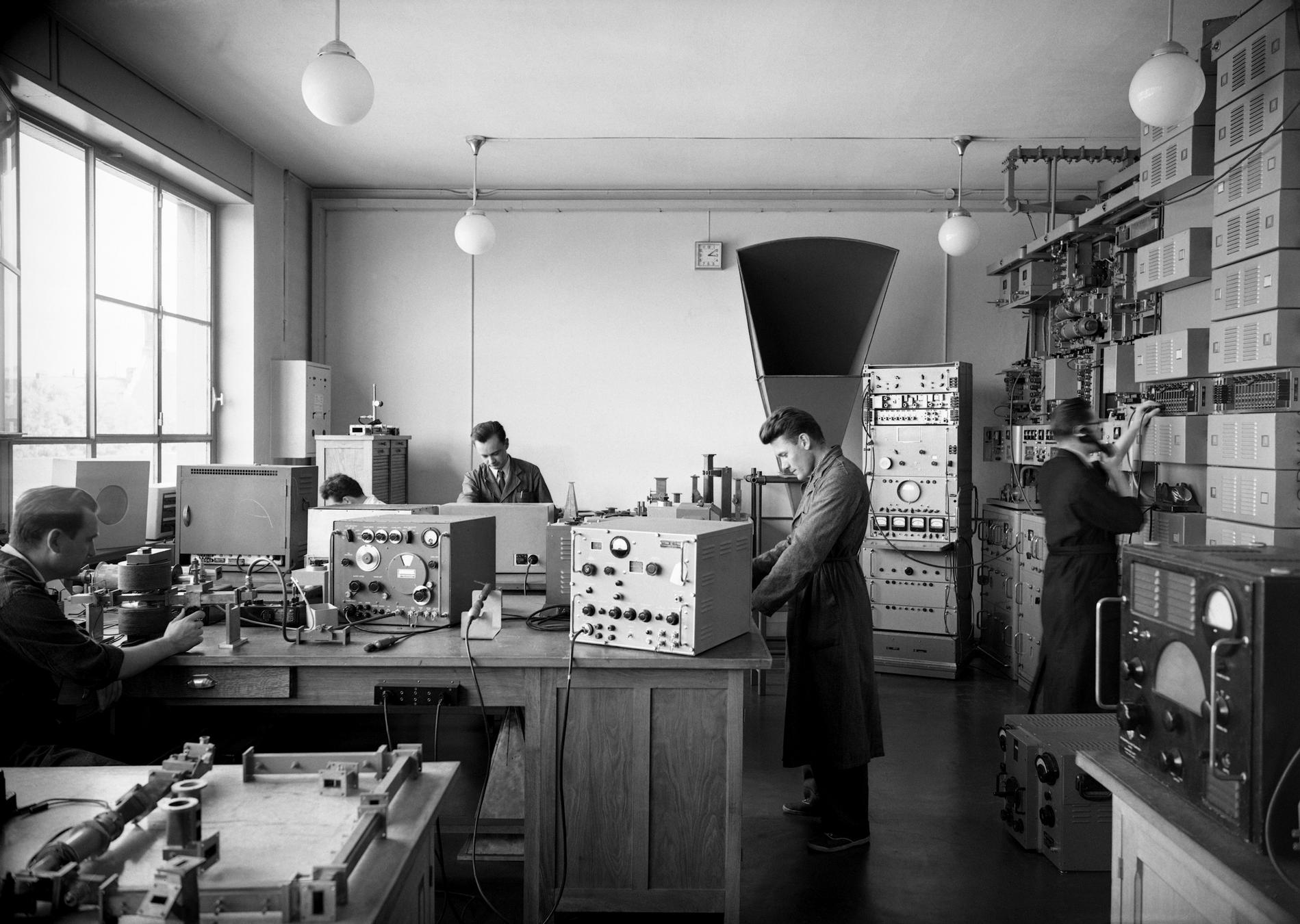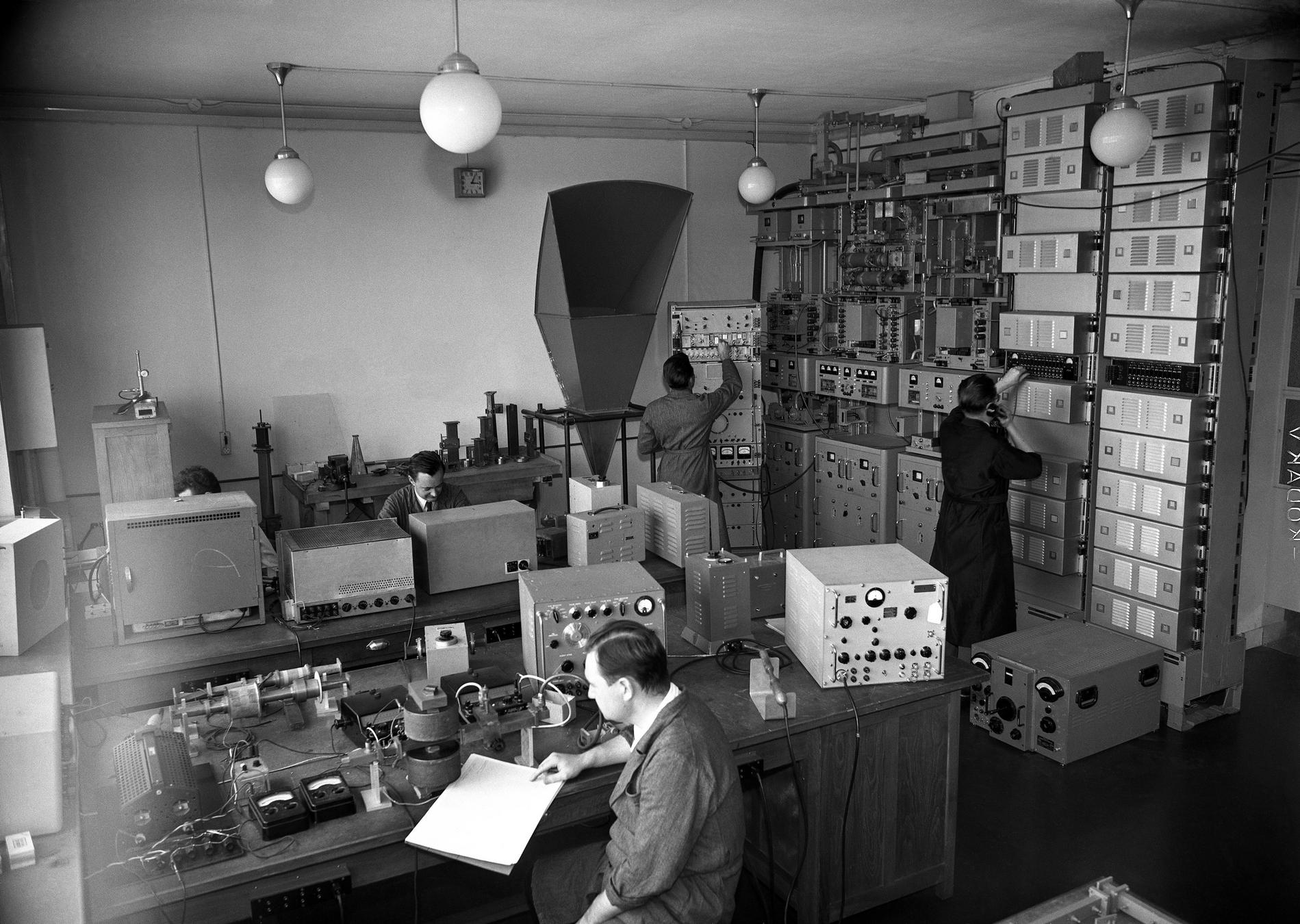 Ci-dessus : contrôle des bâtis hertziens réalisés en matériels GDH103 dans les locaux de la Compagnie Générale de T.S.F (CSF).