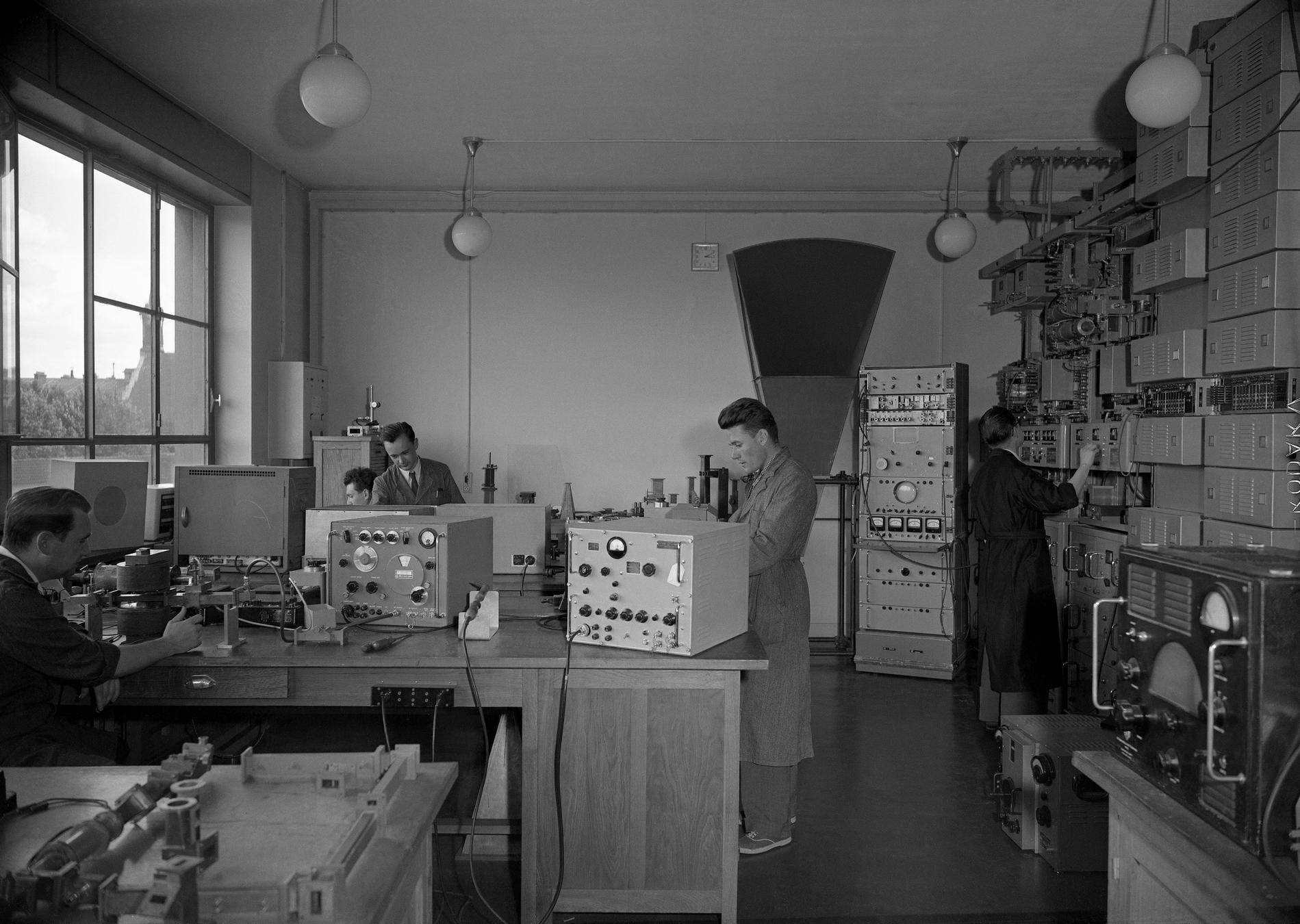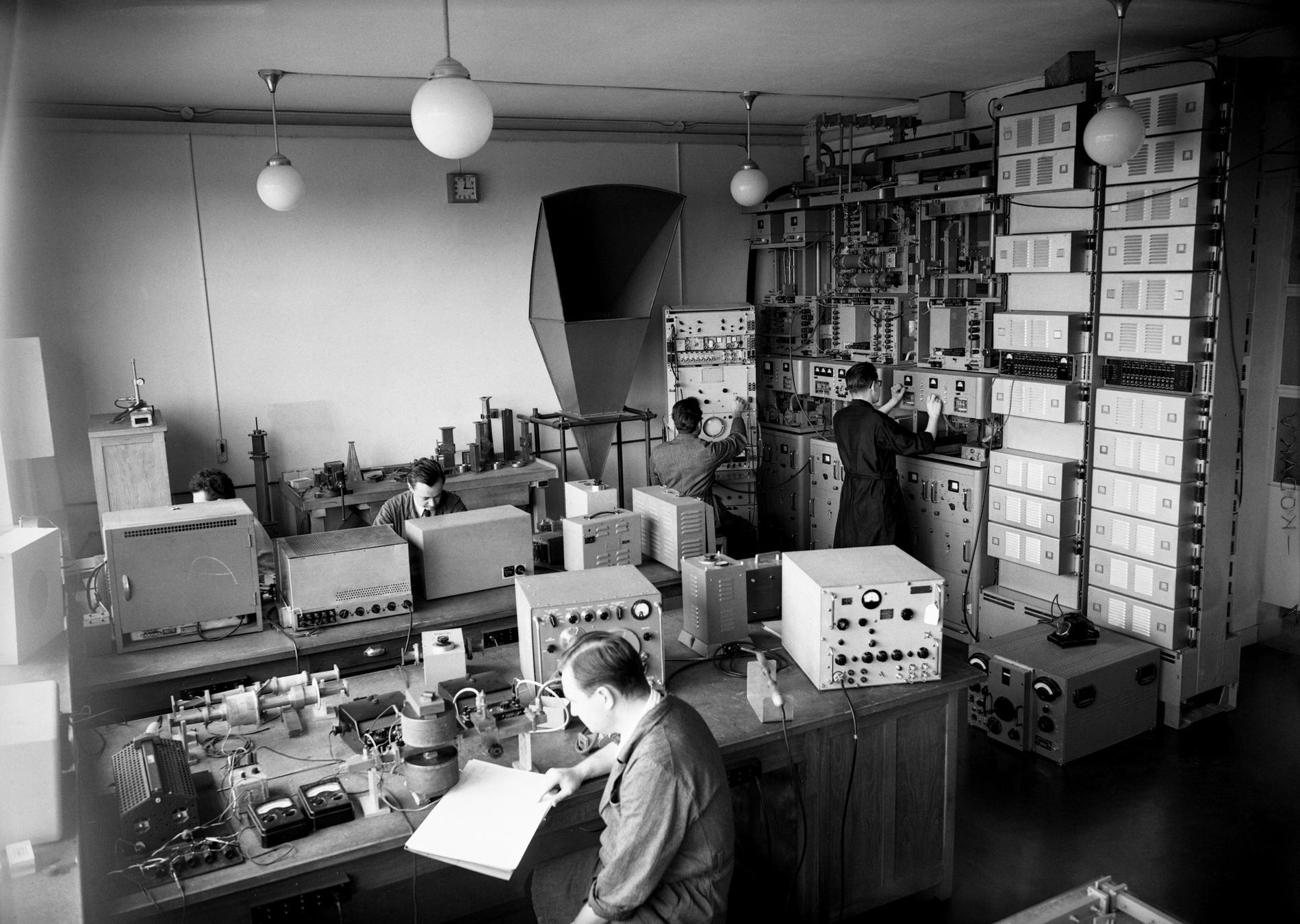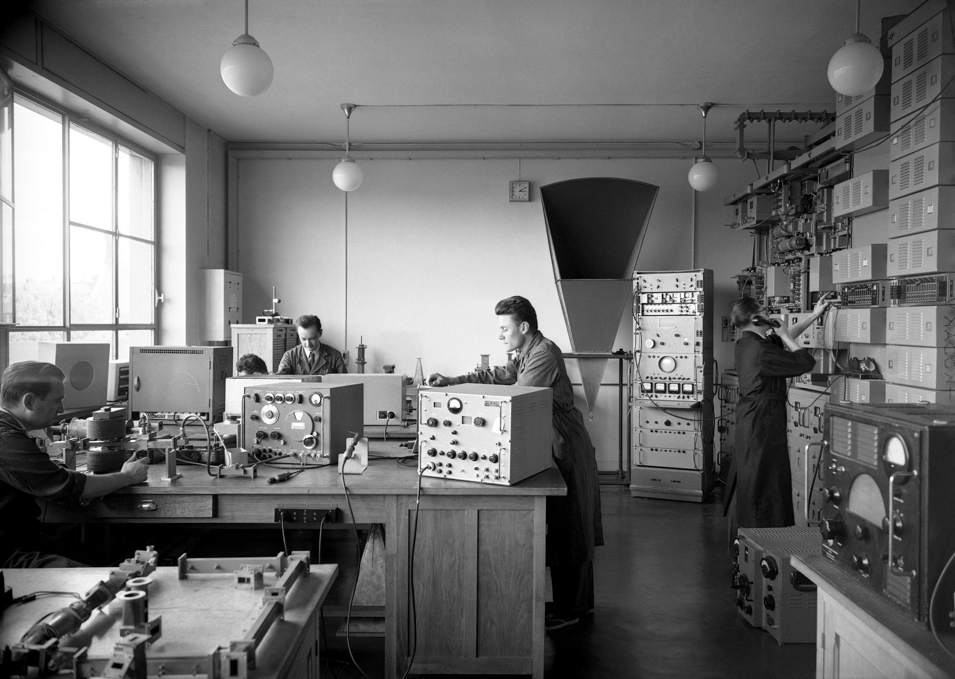 Ci-dessus : contrôle des bâtis hertziens réalisés en matériels GDH103 dans les locaux de la Compagnie Générale de T.S.F (CSF).