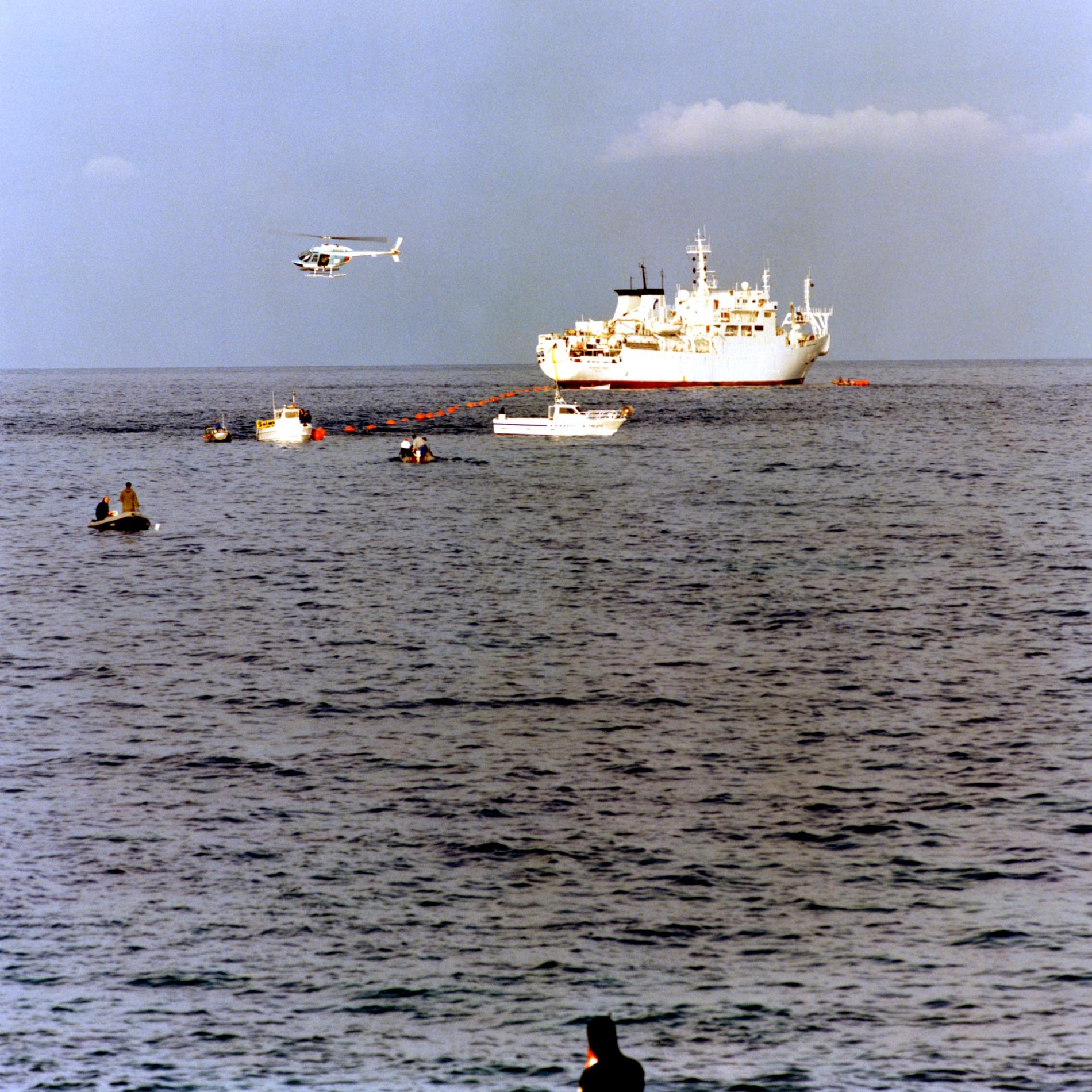 Ci-dessus : navire câblier Vercors et ses équipes pendant la pose du câble téléphonique sous-marin à fibre optique monomode entre Marseille et Ajaccio (câble CC3) -