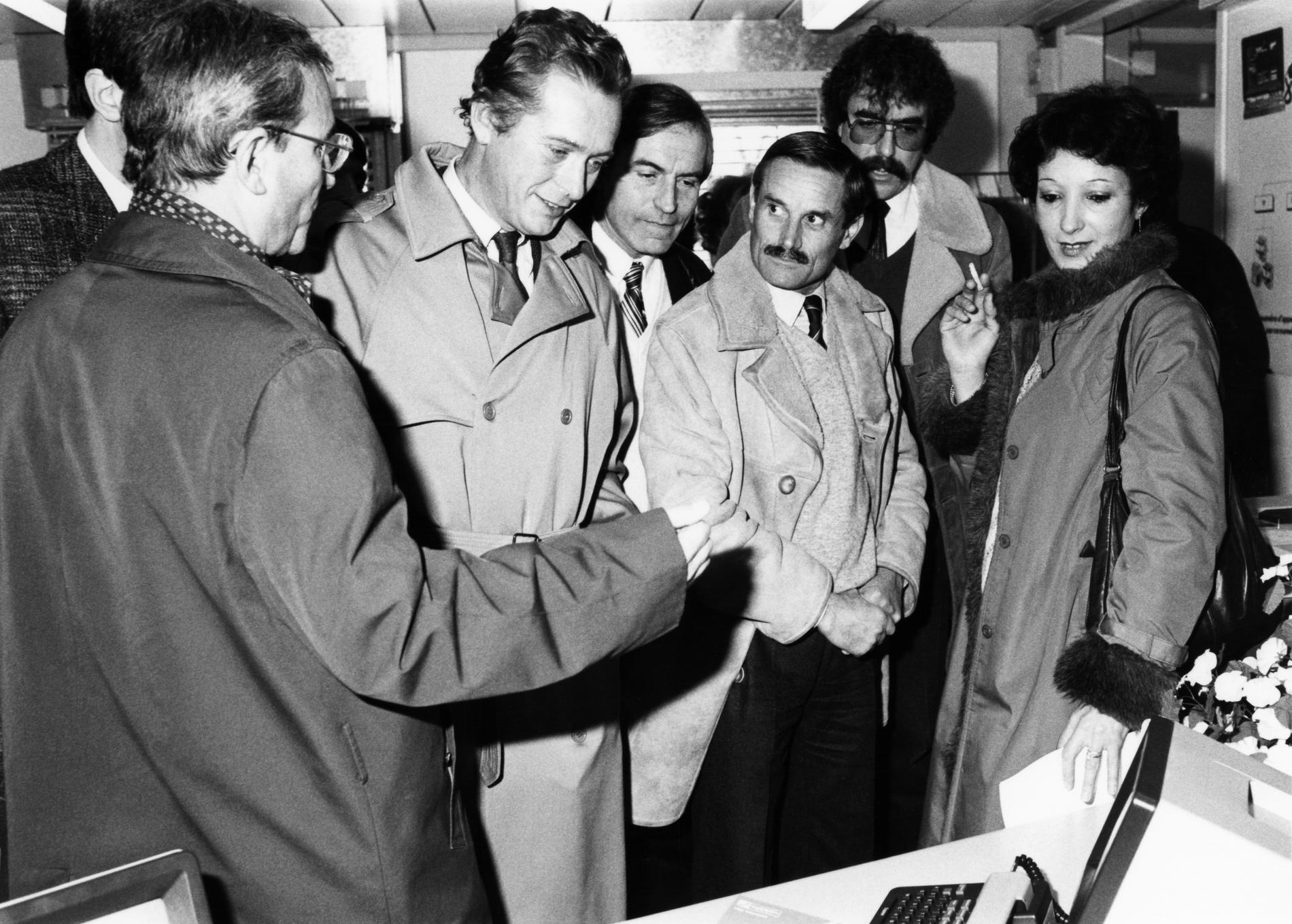 Ci-dessus : M. le Ministre des PTT - Louis Mexandeau pénètre dans les locaux du Centre Informatique Télétel-Vidéotex (CITV) de Vélizy et salue le personnel de ce point névralgique majeur.