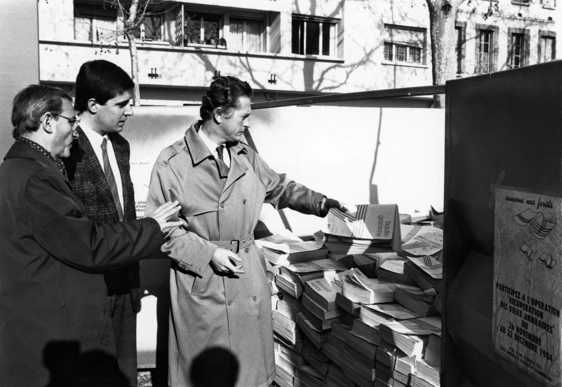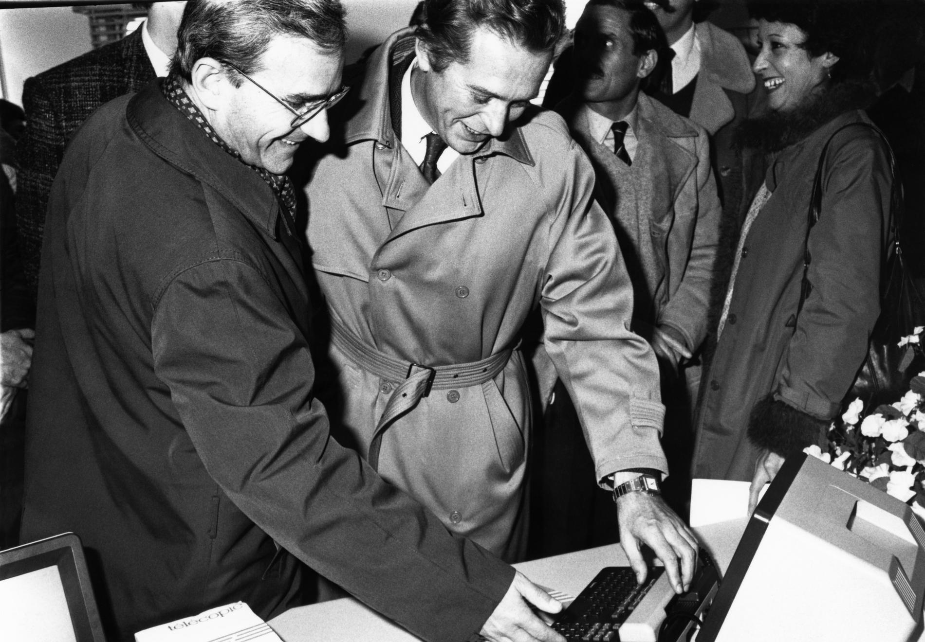 Ci-dessus : à l'occasion de l'ouverture récente de l'Annuaire Électronique dans la Région des Télécommunications de Toulouse, M. le Maire de Toulouse - Dauminique Baudis remet son vieil annuaire papier à l'Administration, puis, après avoir essayé lui-même l'Annuaire Électronique, repart avec le Minitel 1 qui lui est attribué.