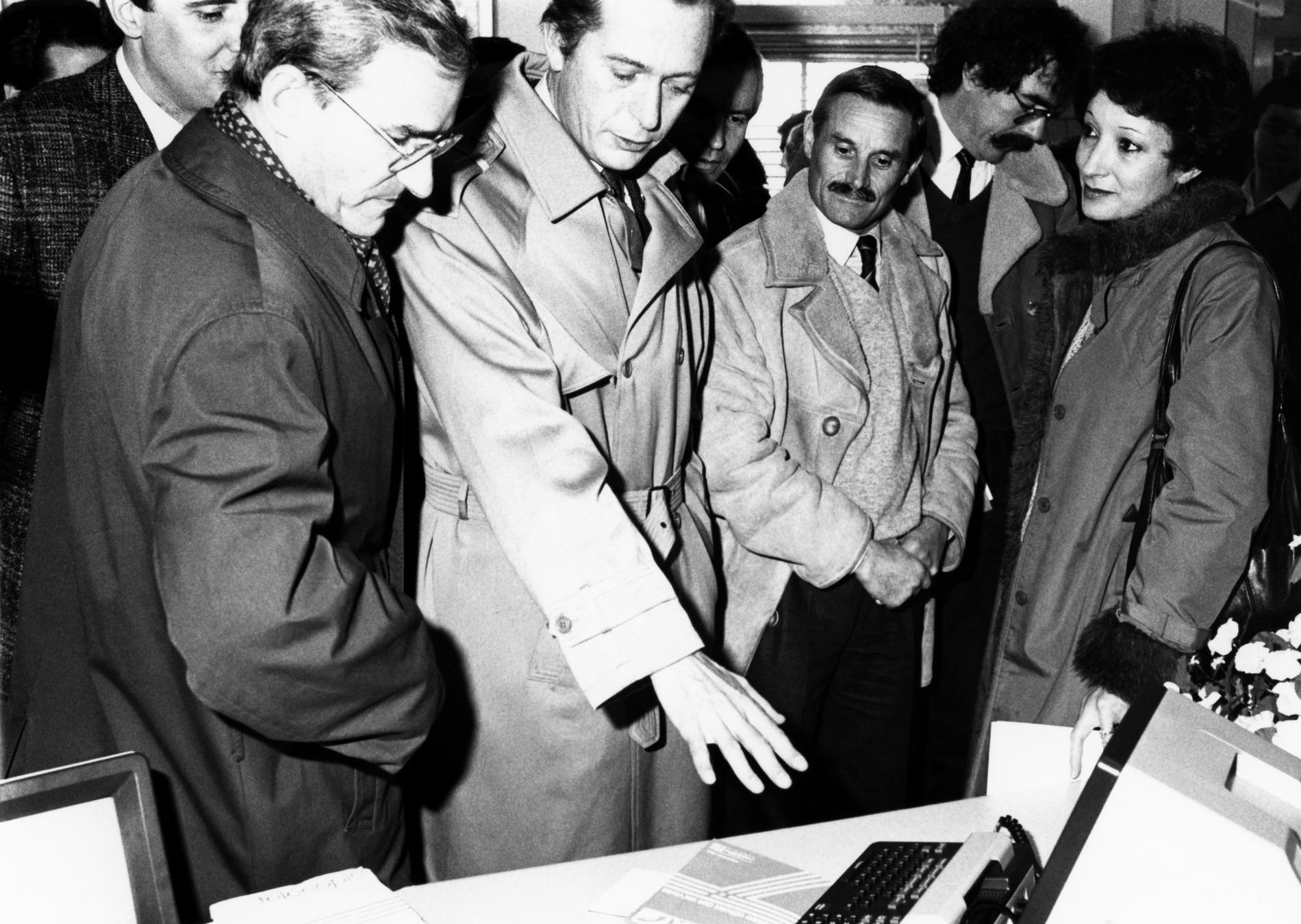 Ci-dessus : visite au CCETT de M. le Ministre des PTT - Louis Mexandeau, le 4 février 1983, qui découvre les dernières nouveautés télématiques françaises. À droite, M. le Maire de Rennes et Ministre - Edmond Hervé (costume rayé marine).