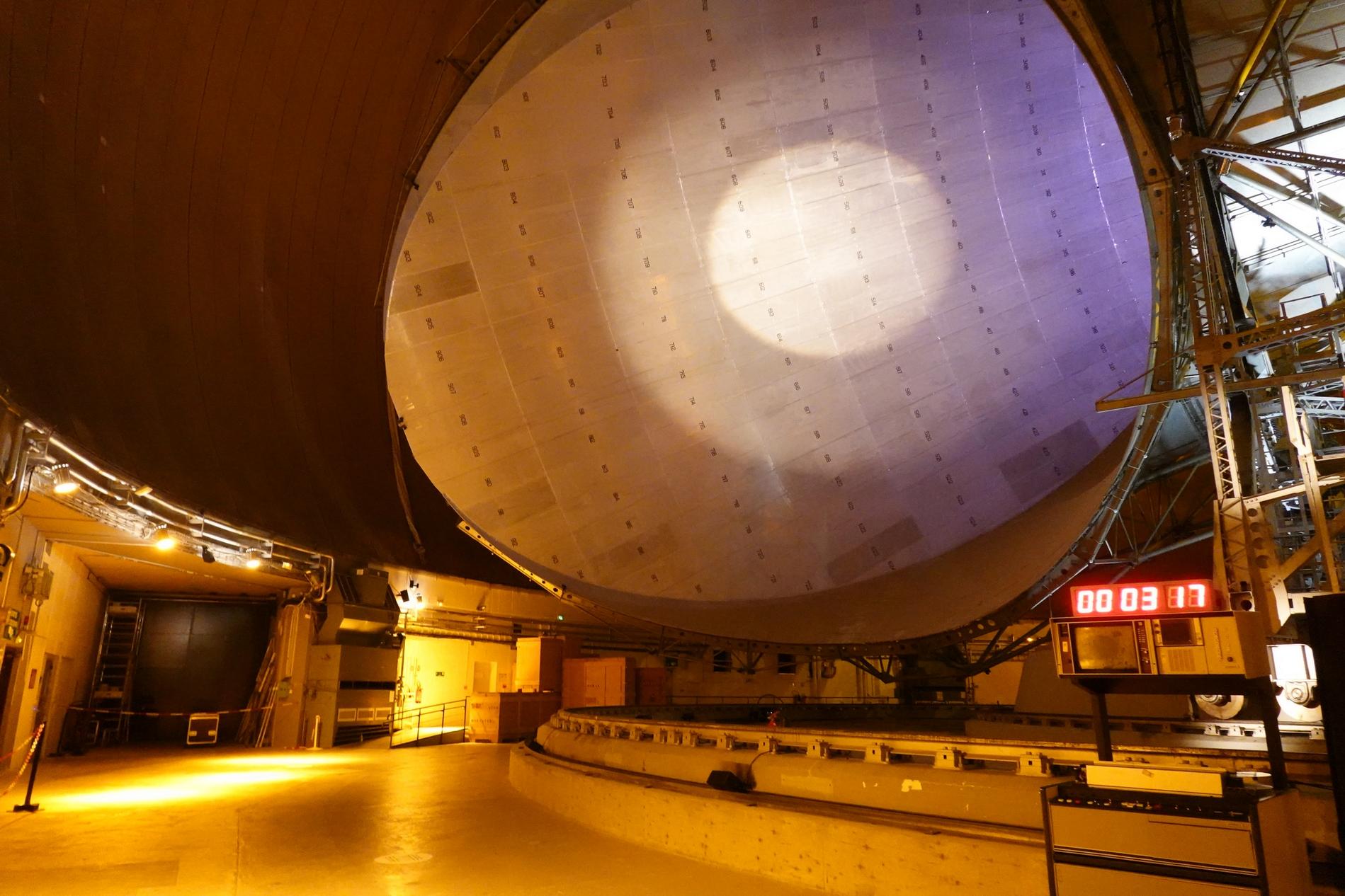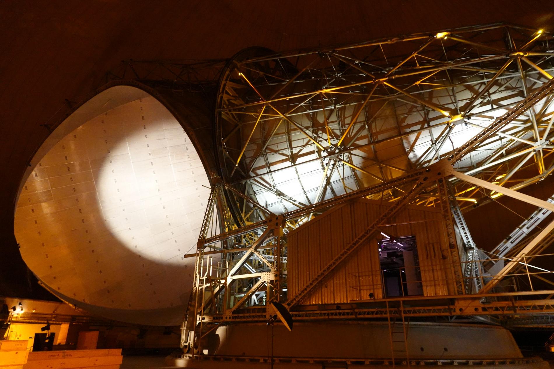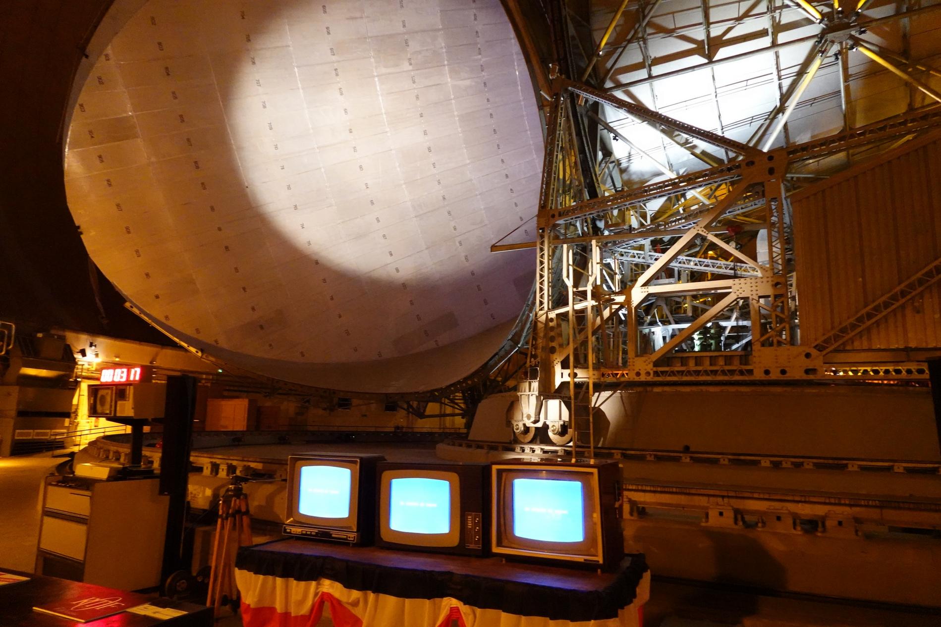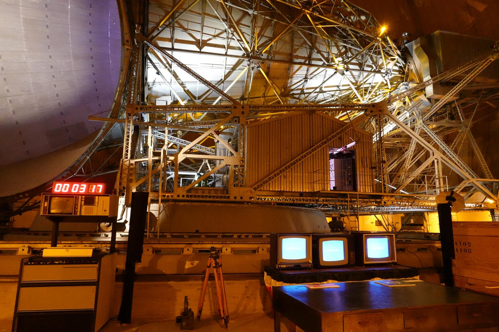 Ci-dessus : vue, endéans du Radôme de Pleumeur-Bodou, de l'Antenne PB1 à l'écoute du Satellite Telstar 1.