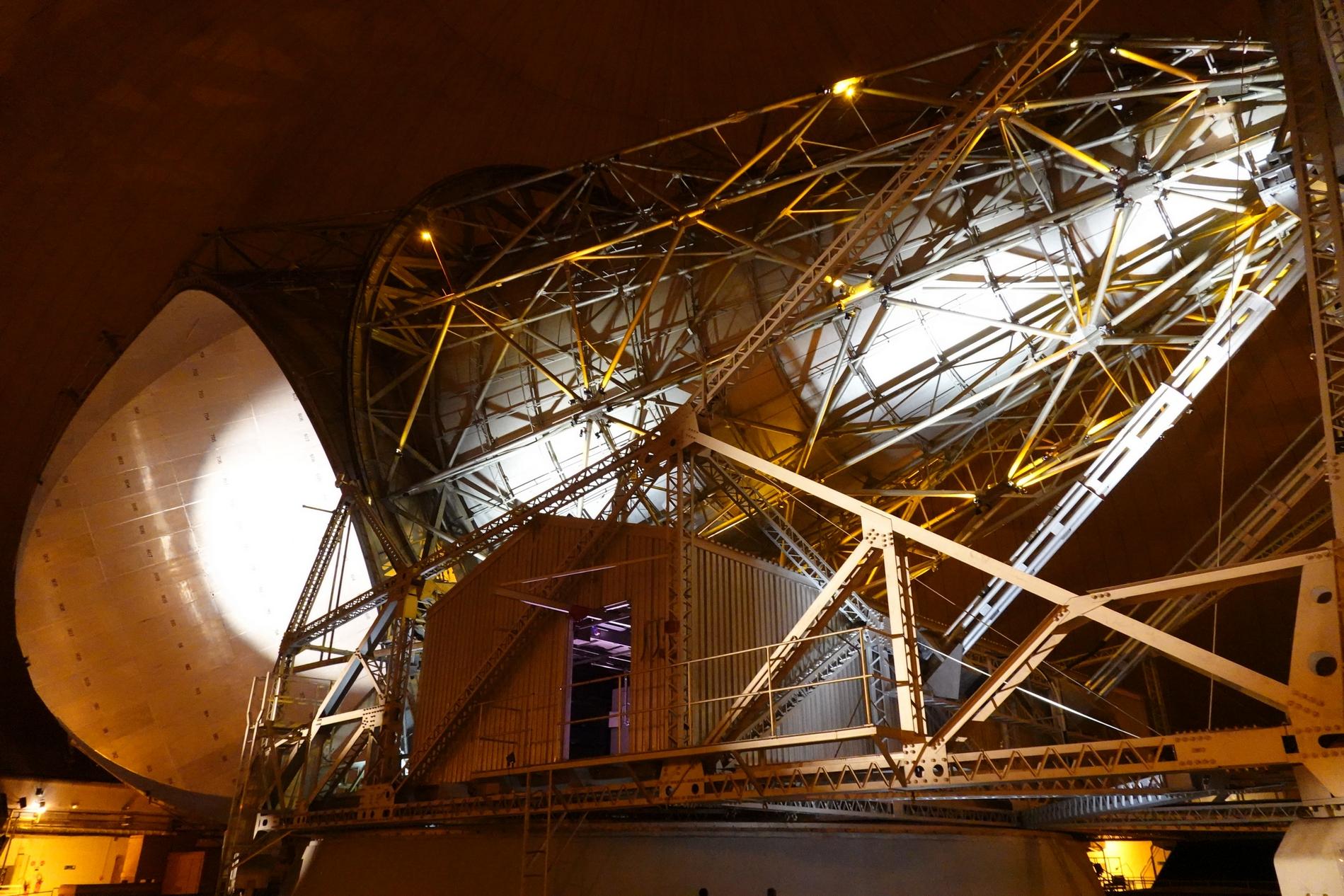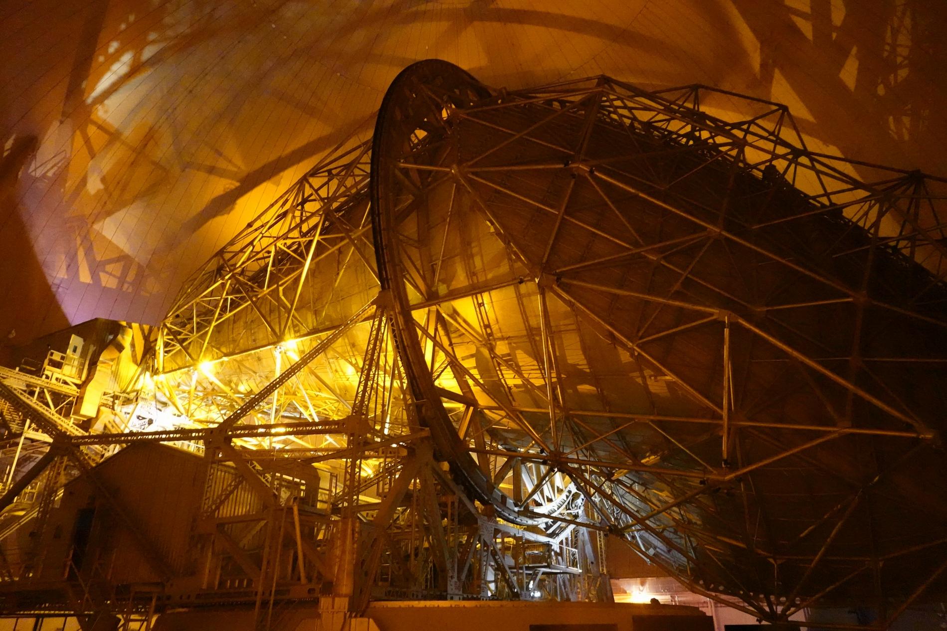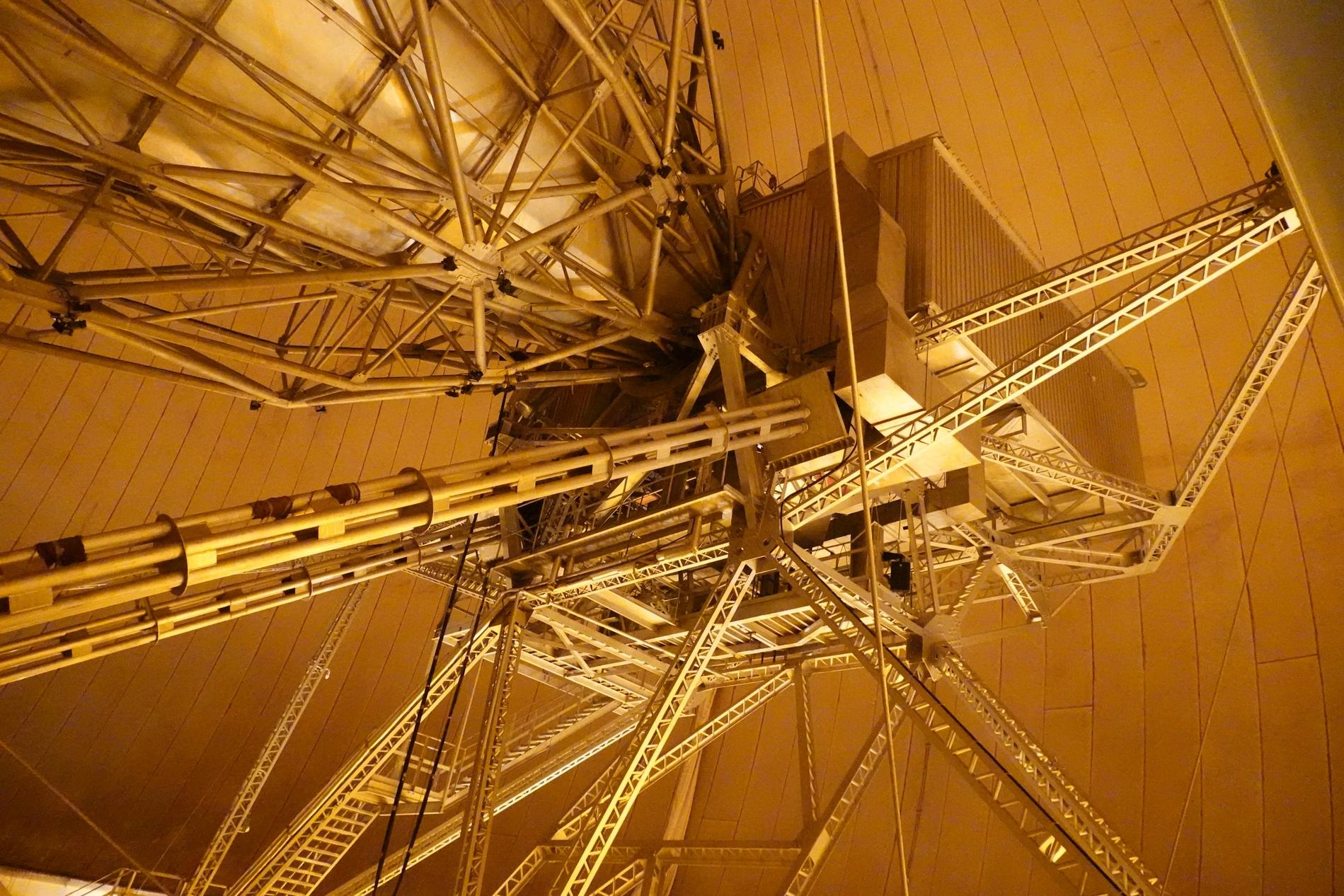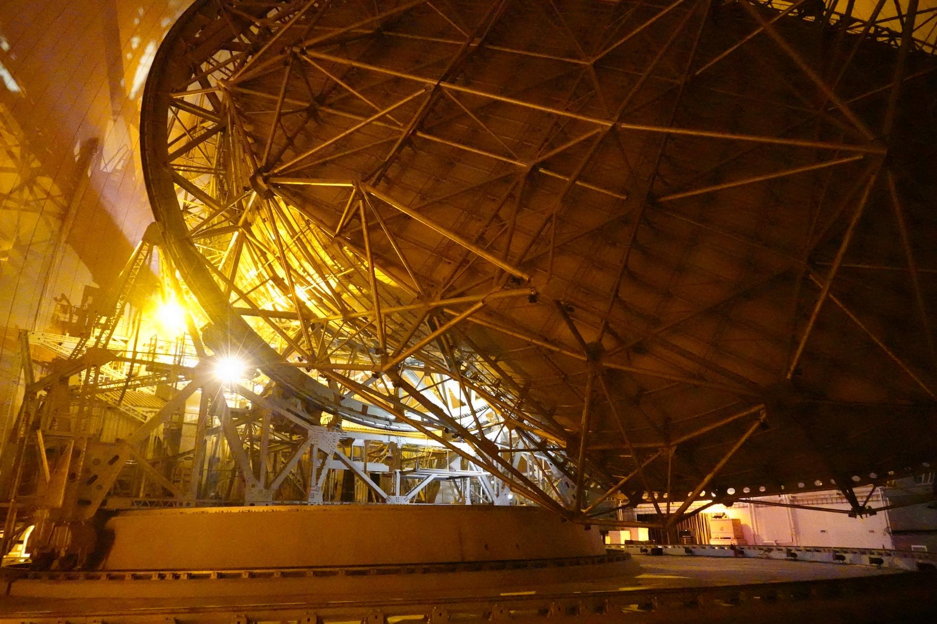 Ci-dessus : vue, endéans du Radôme de Pleumeur-Bodou, de l'Antenne PB1 à l'écoute du Satellite Telstar 1.