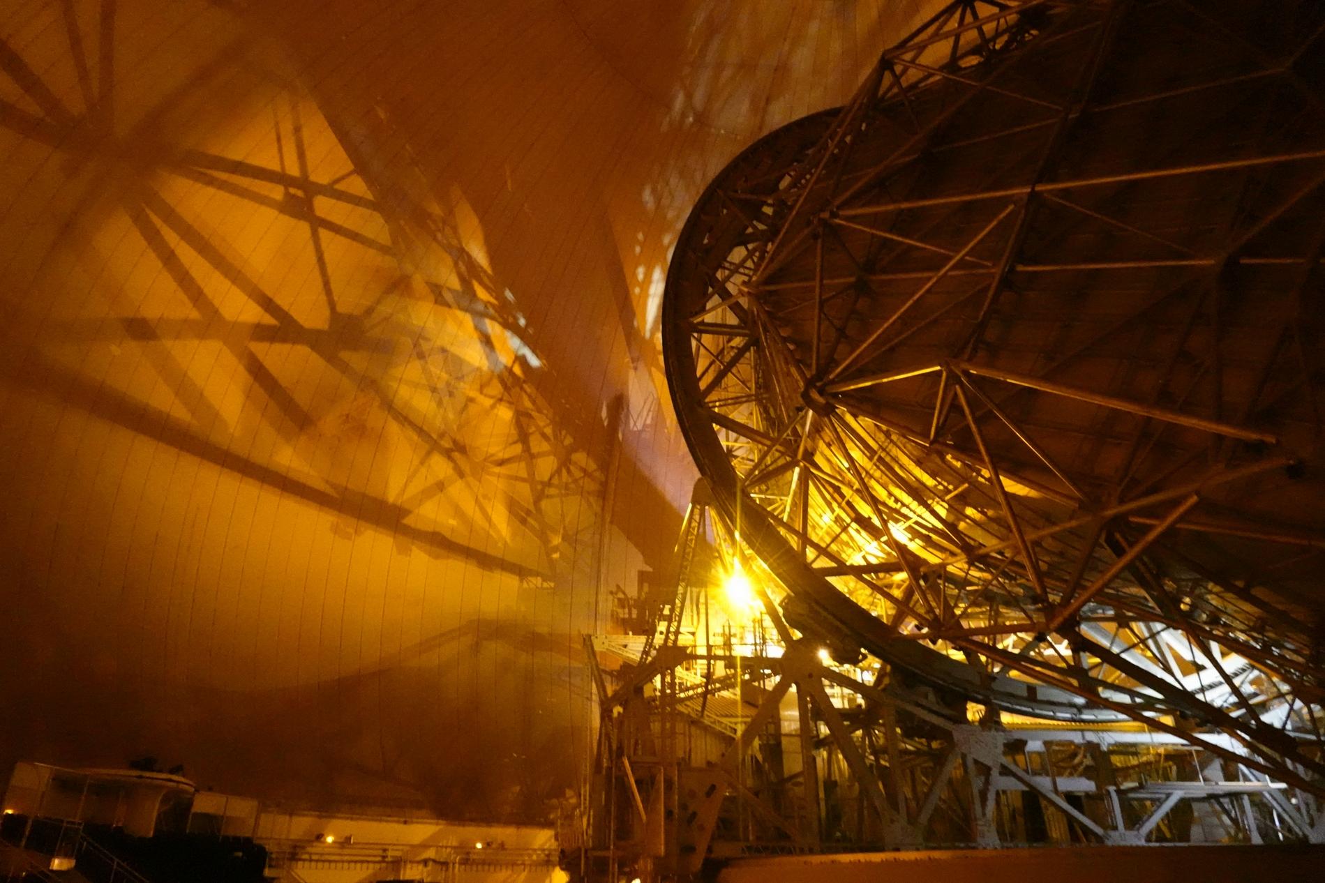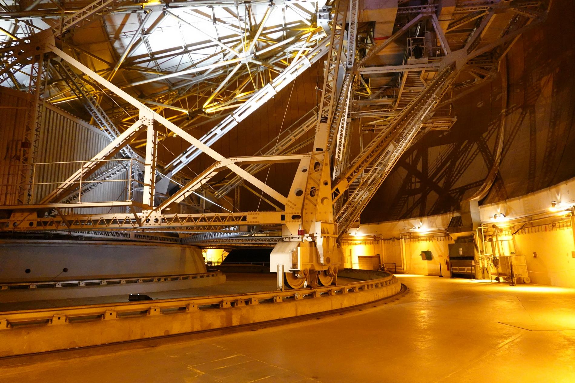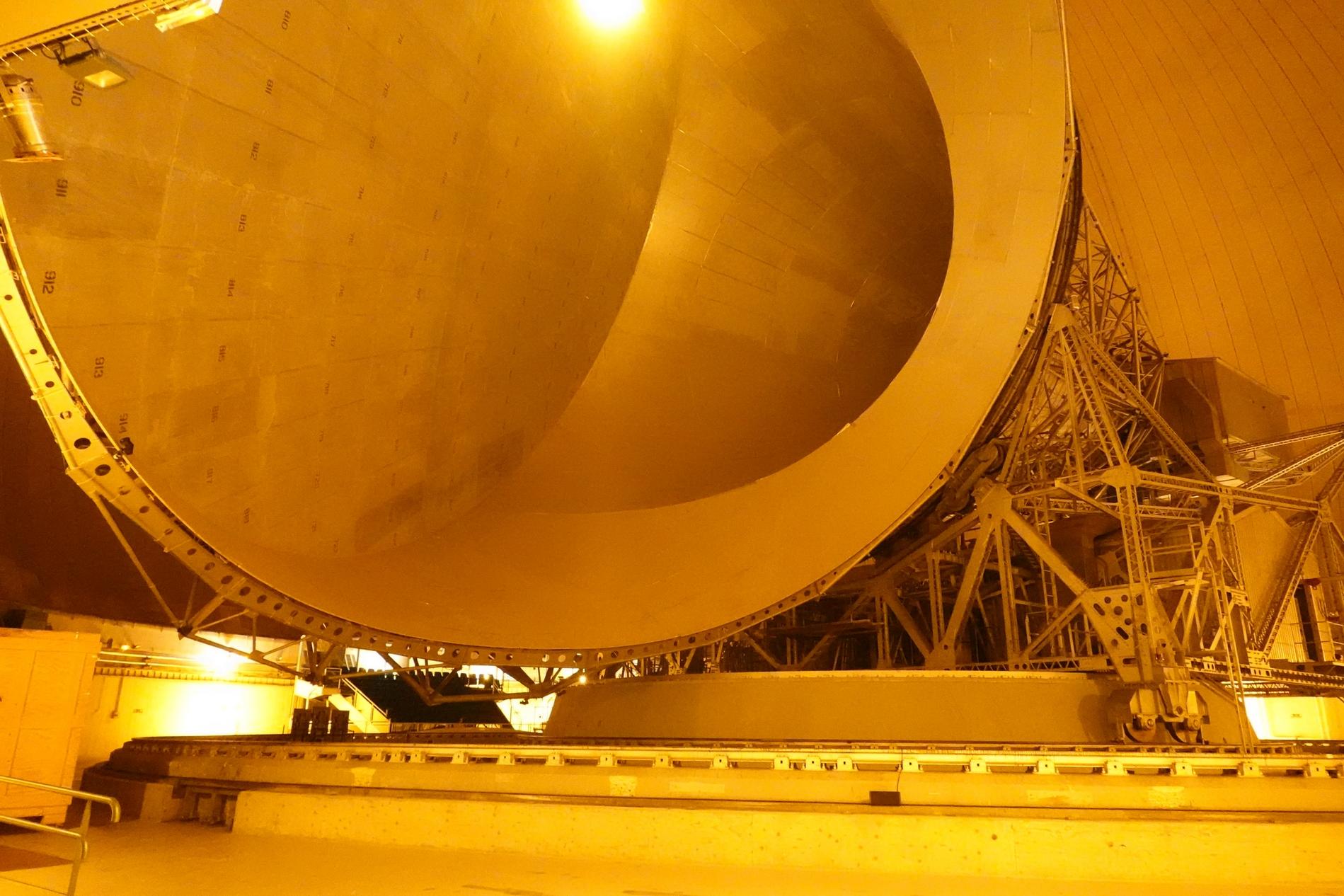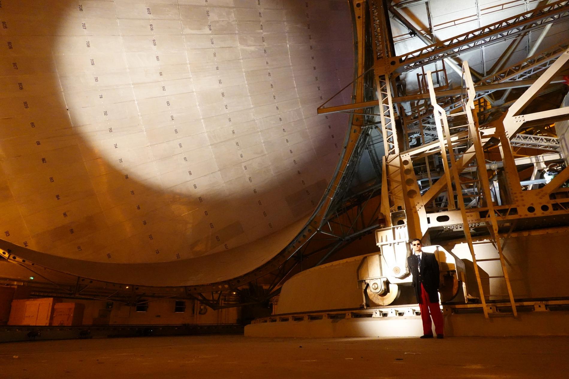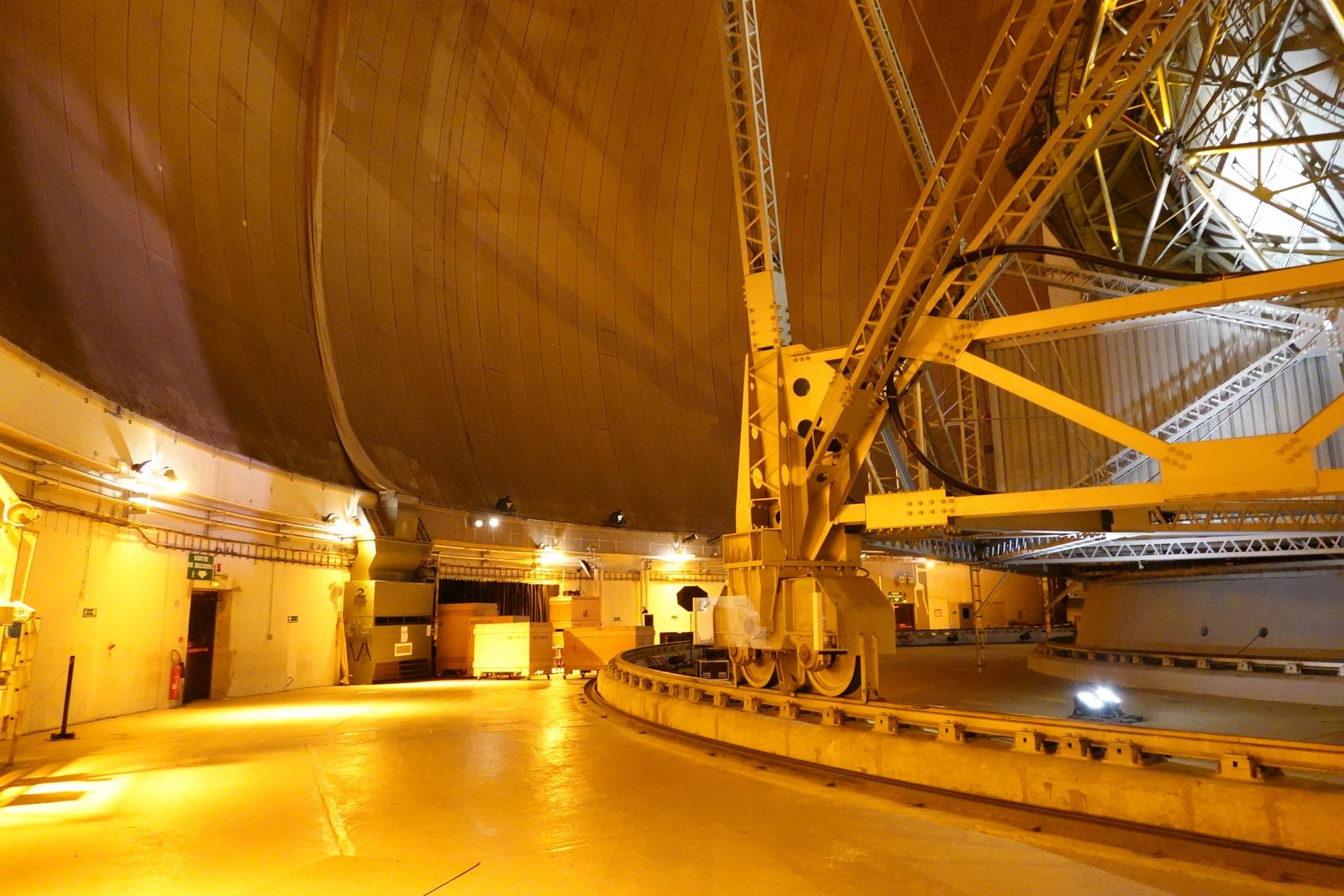 Ci-dessus : vue, endéans du Radôme de Pleumeur-Bodou, de l'Antenne PB1 à l'écoute du Satellite Telstar 1.