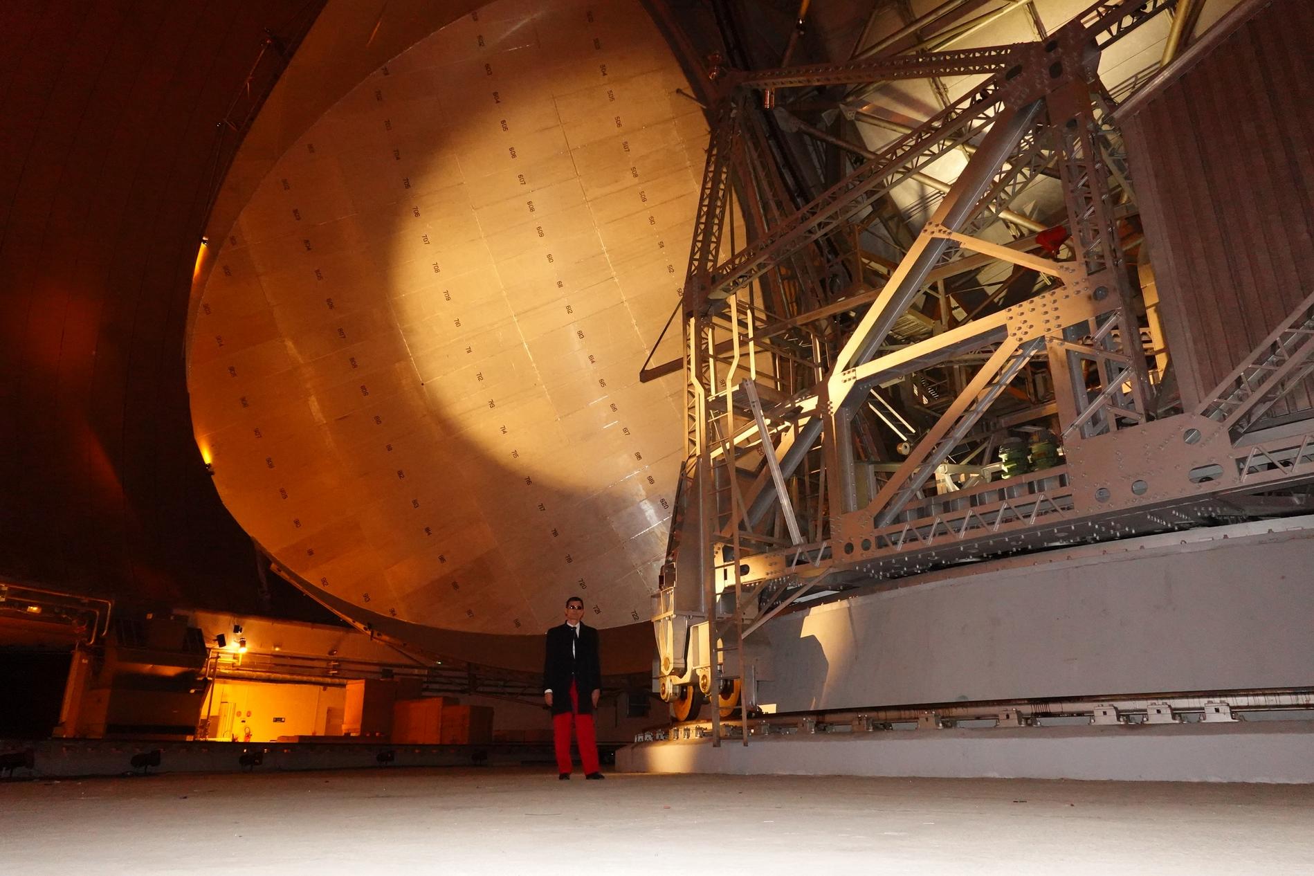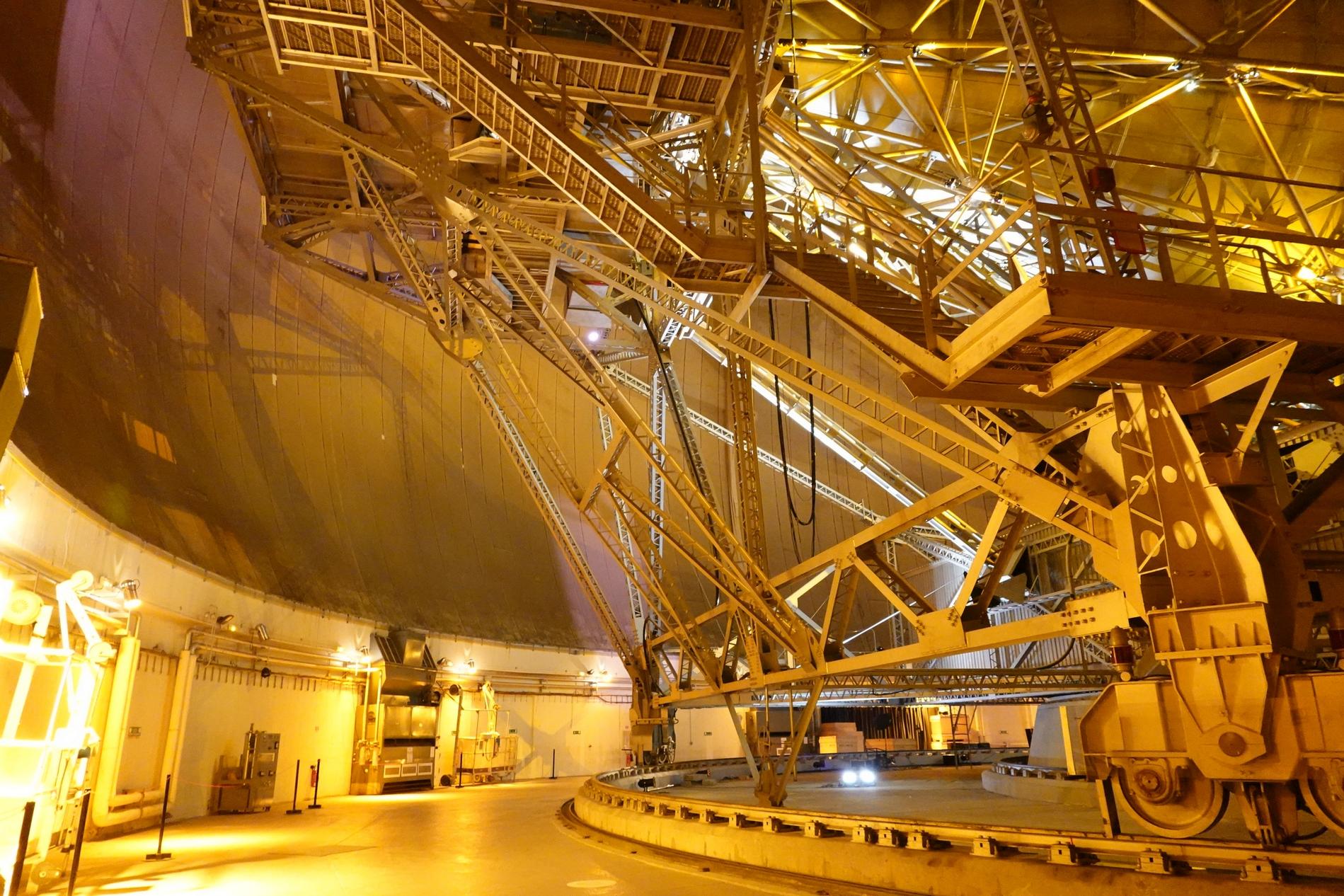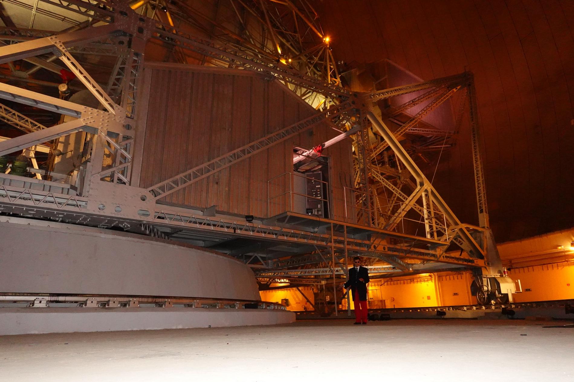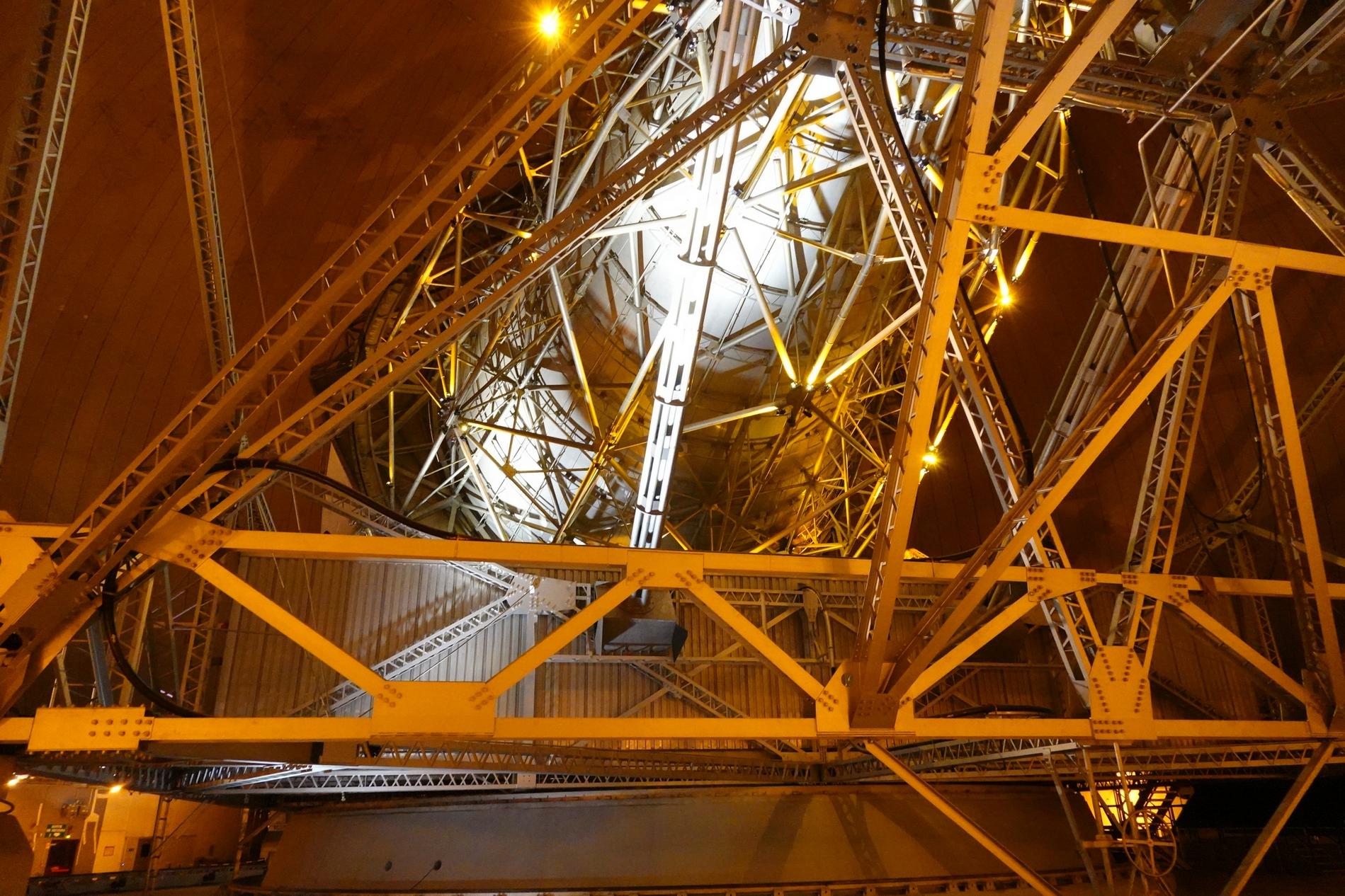 Ci-dessus : vue, endéans du Radôme de Pleumeur-Bodou, de l'Antenne PB1 à l'écoute du Satellite Telstar 1.