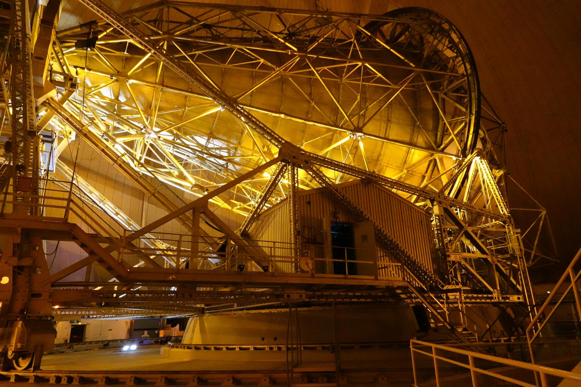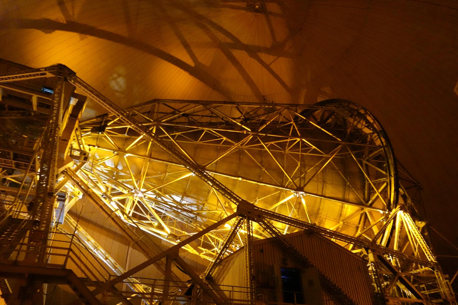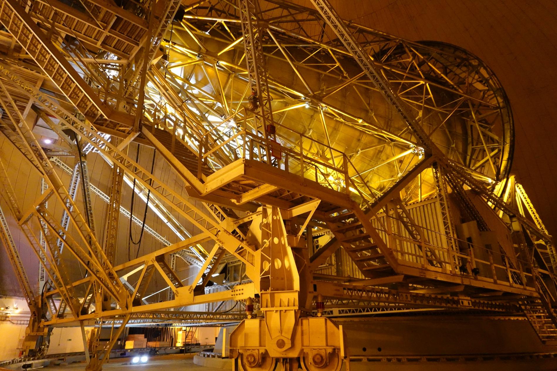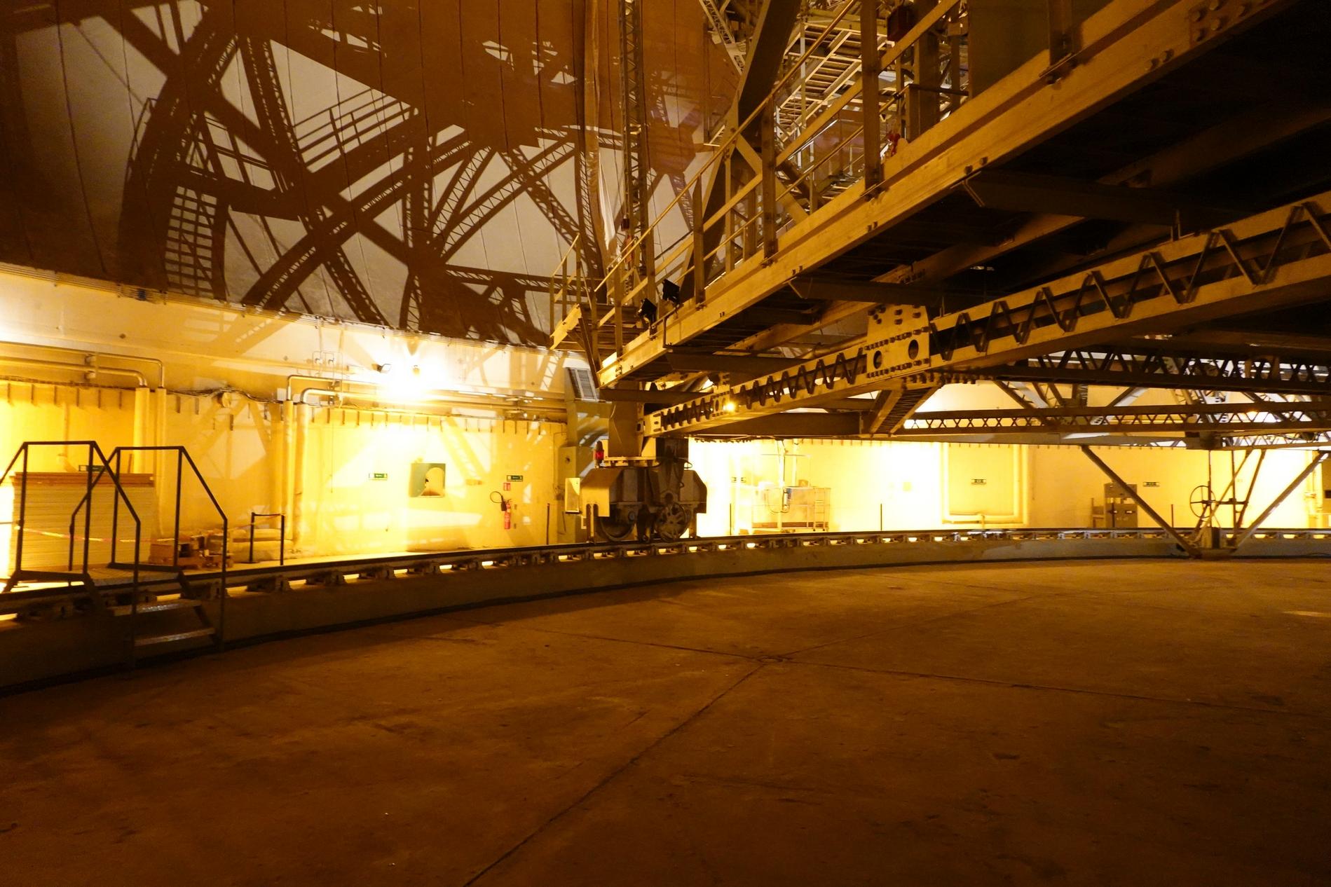 Ci-dessus : vue, endéans du Radôme de Pleumeur-Bodou, de l'Antenne PB1 à l'écoute du Satellite Telstar 1.