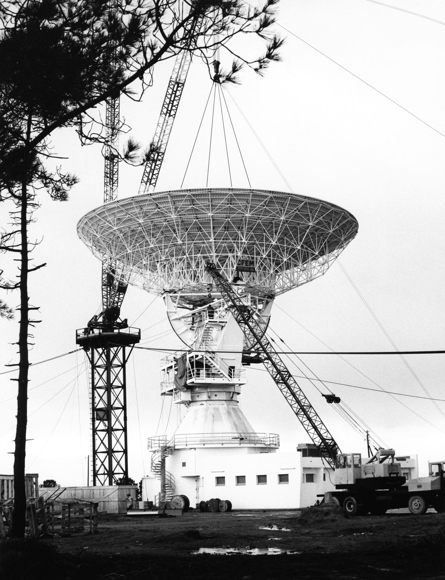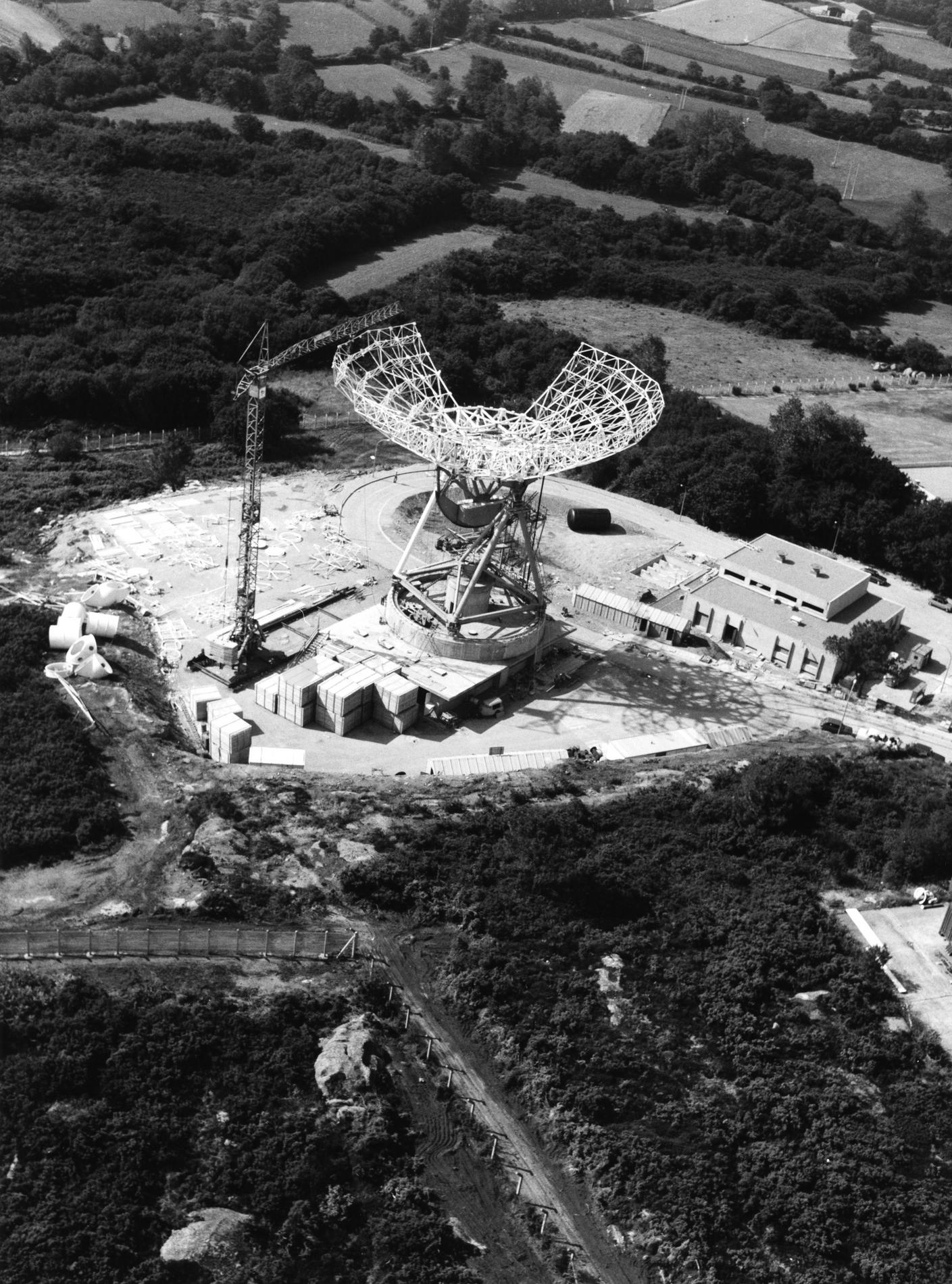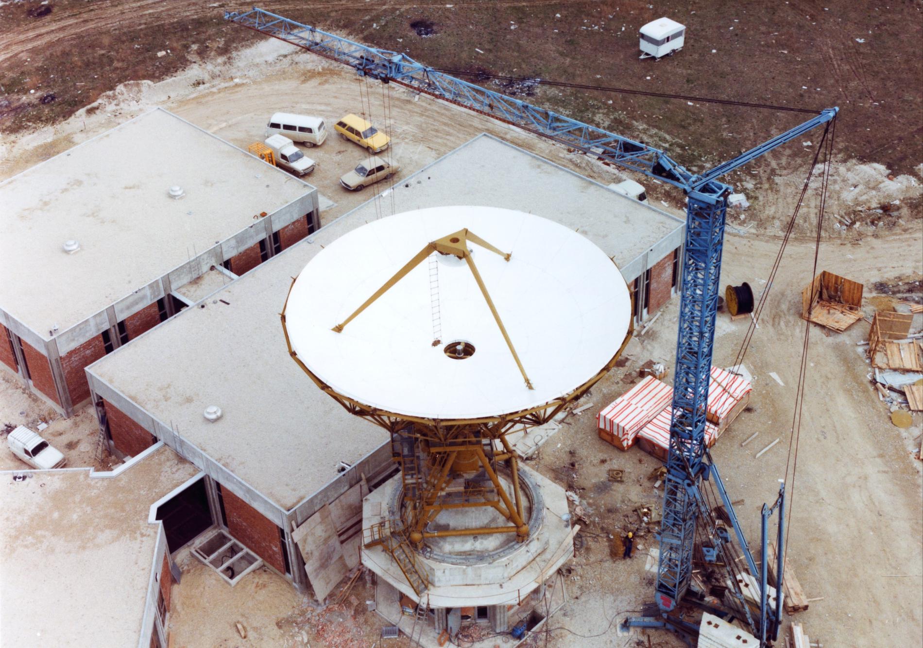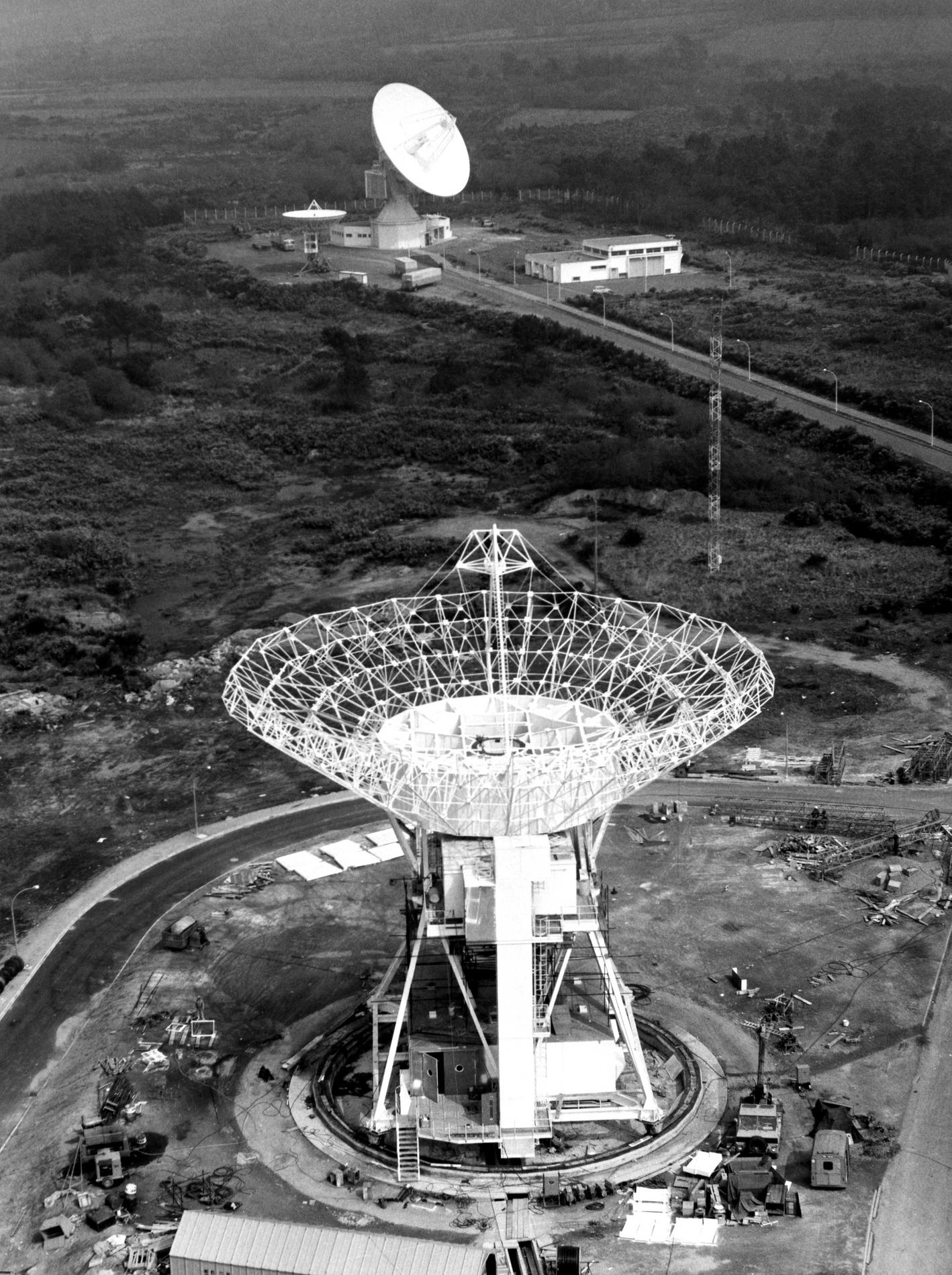 Ci-dessus : vue d'ensemble du Centre de Télécommunications Spatiales de Bercenay-en-Othe en Septembre/Octobre 1977, peu avant sa mise en service, avec à gauche l'antenne BY1 déjà prête, et les bâtiments techniques et d'exploitation presque achevés.
