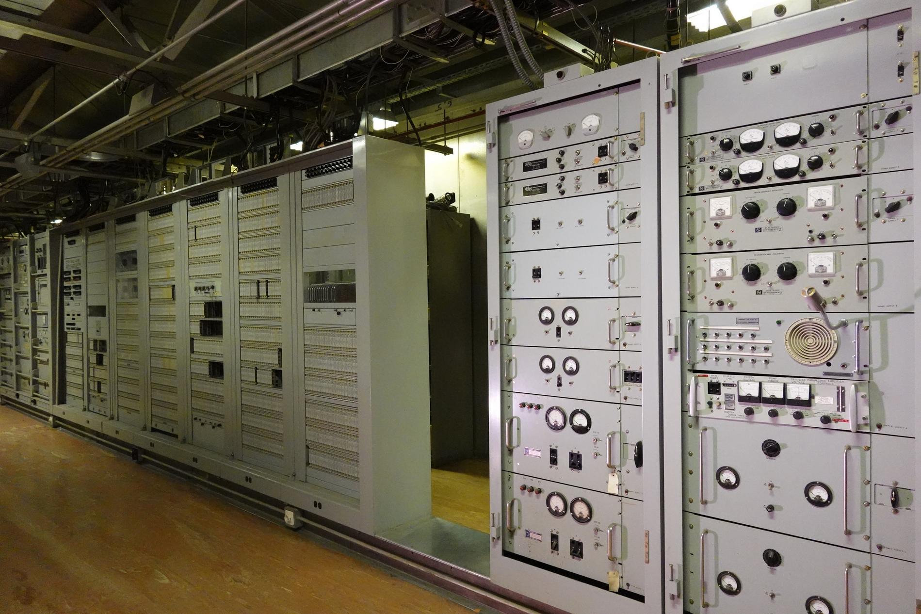 Ci-dessus : vue générale de la salle d'exploitation du CTS de Pleumeur-Bodou en 1977, avec le pupitre de commandes des diverses antennes satellites alors en service.