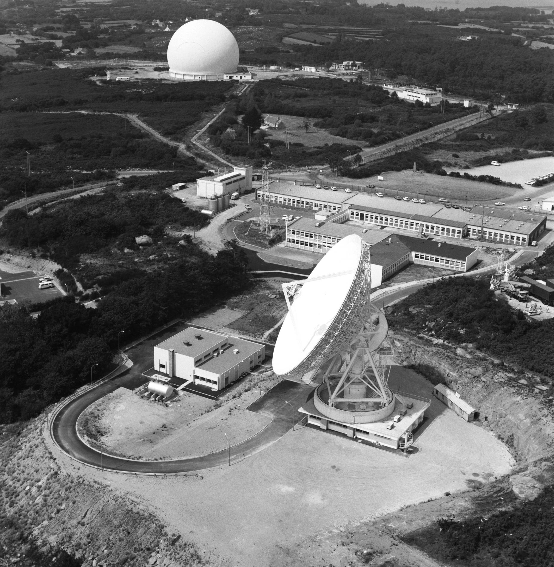 Ci-dessus : vue du Radôme de Pleumeur-Bodou (Radôme définitif) abritant l'antenne PB1, à l'été 1962.