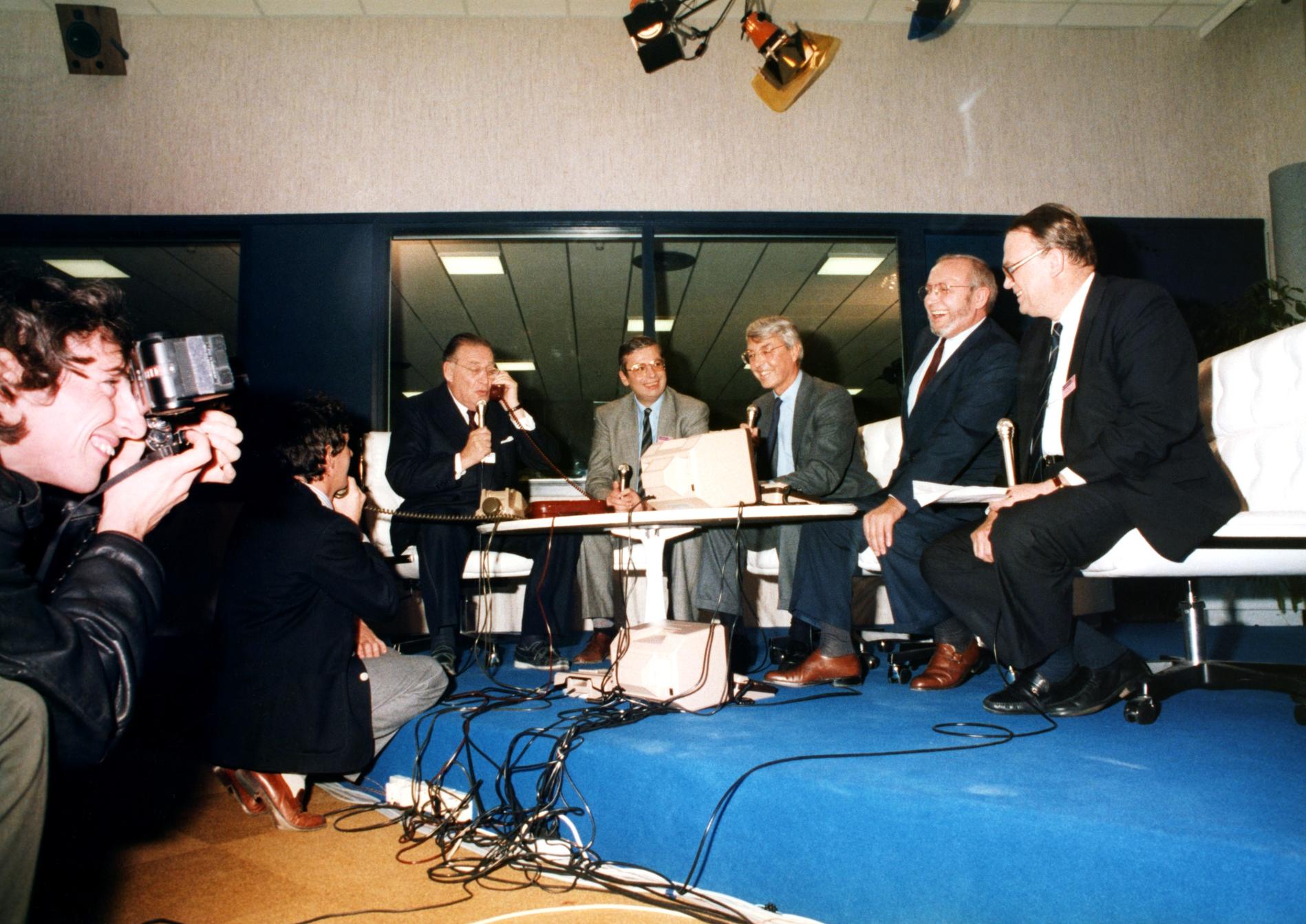 Ci-dessus : Plateau TV-Direct au Centre National de Coordination de Murat, pendant la soirée du passage à 8 chiffres, le 25 octobre 1985 juste à 23H05, dans l'attente des premières informations sur la réussite du basculage dans le pays.