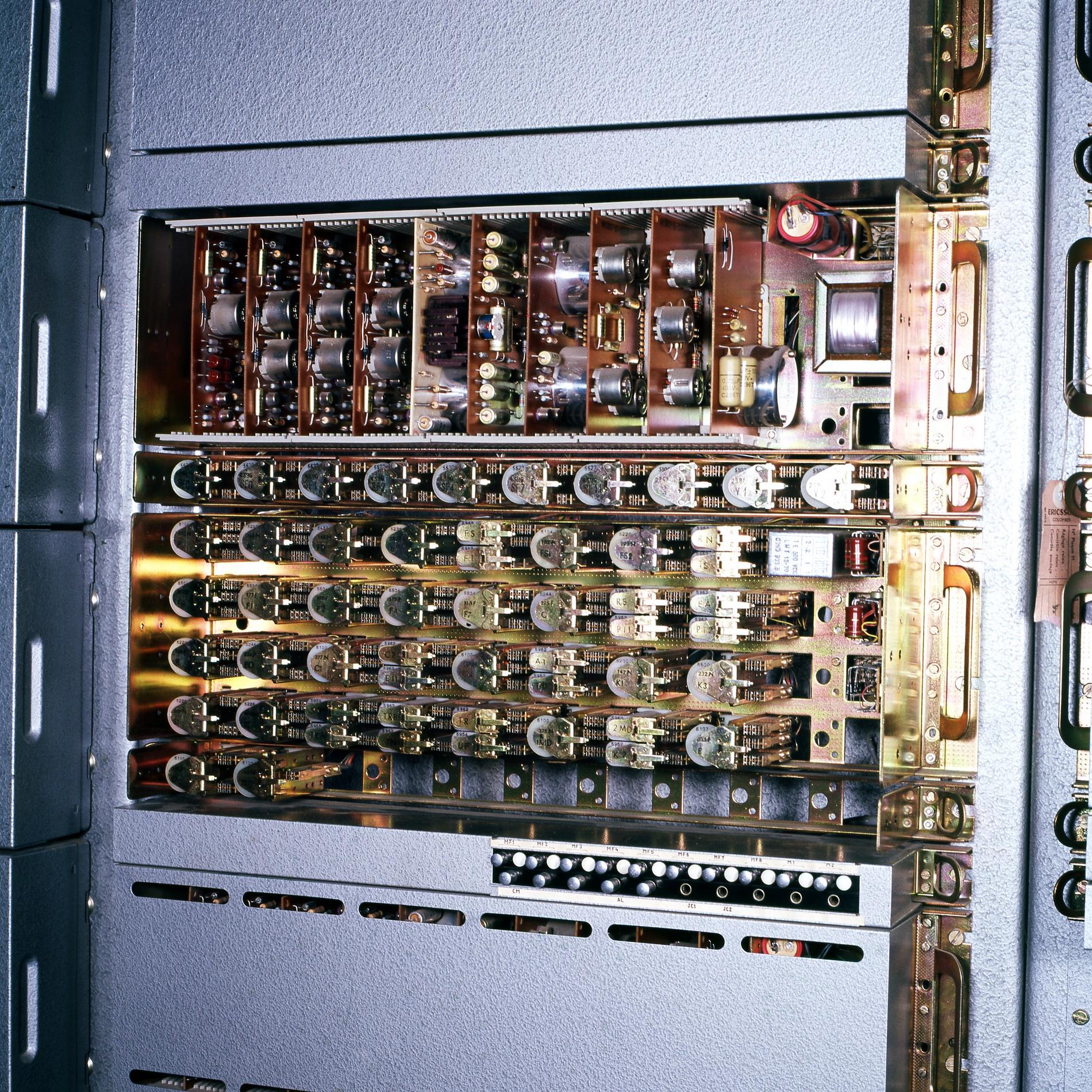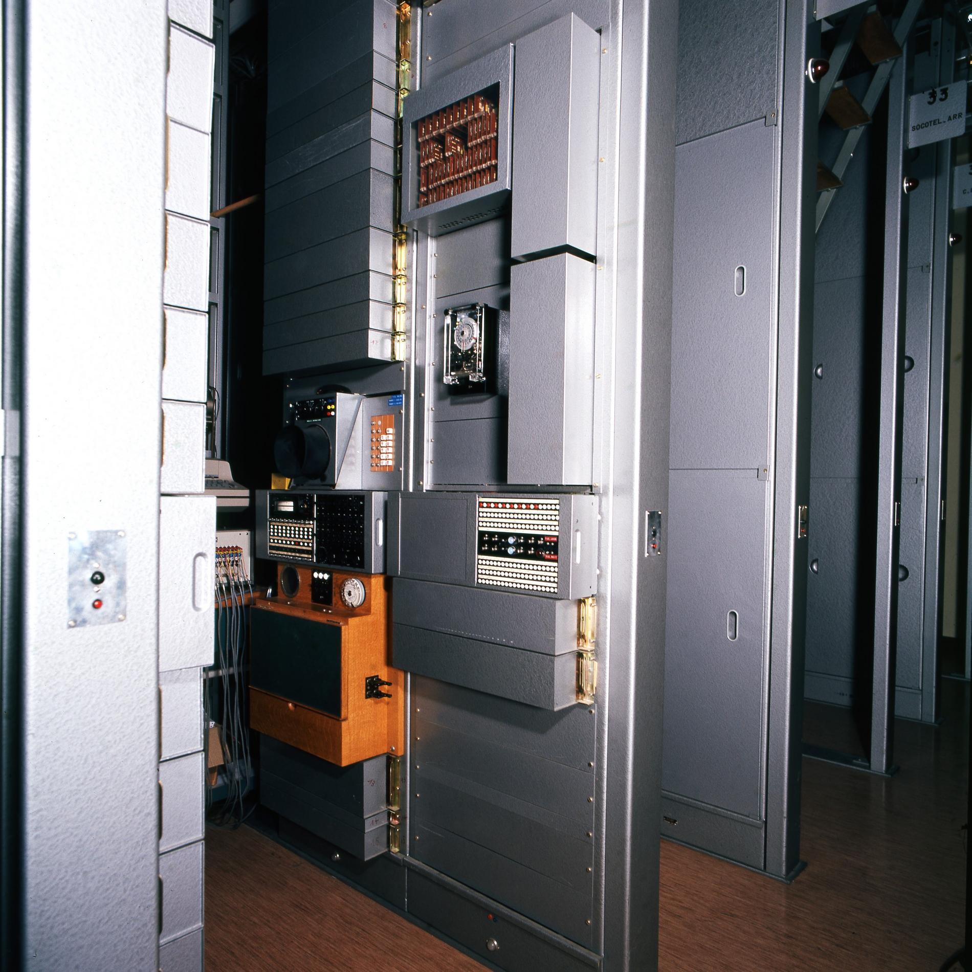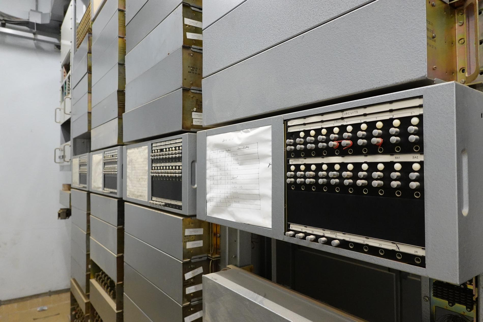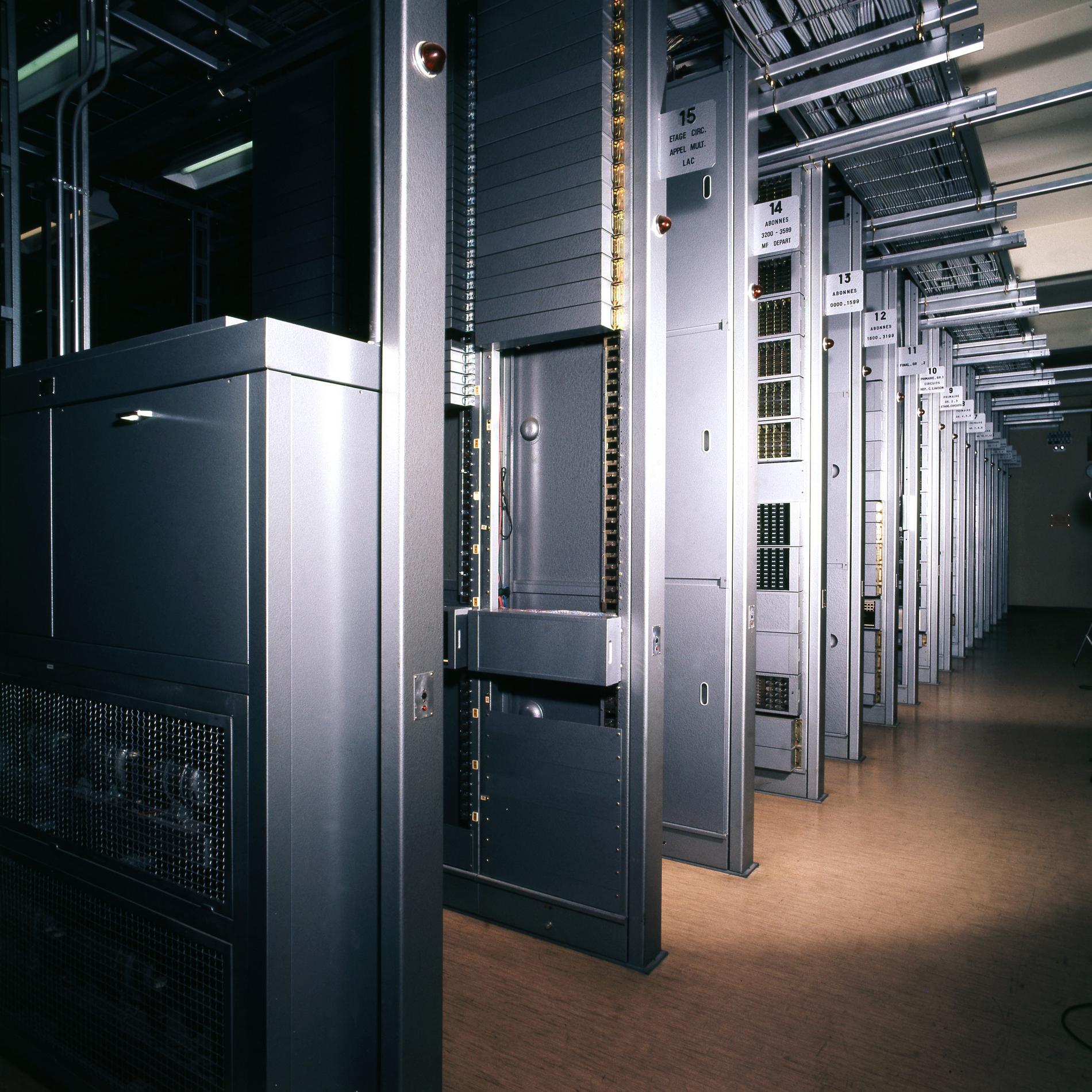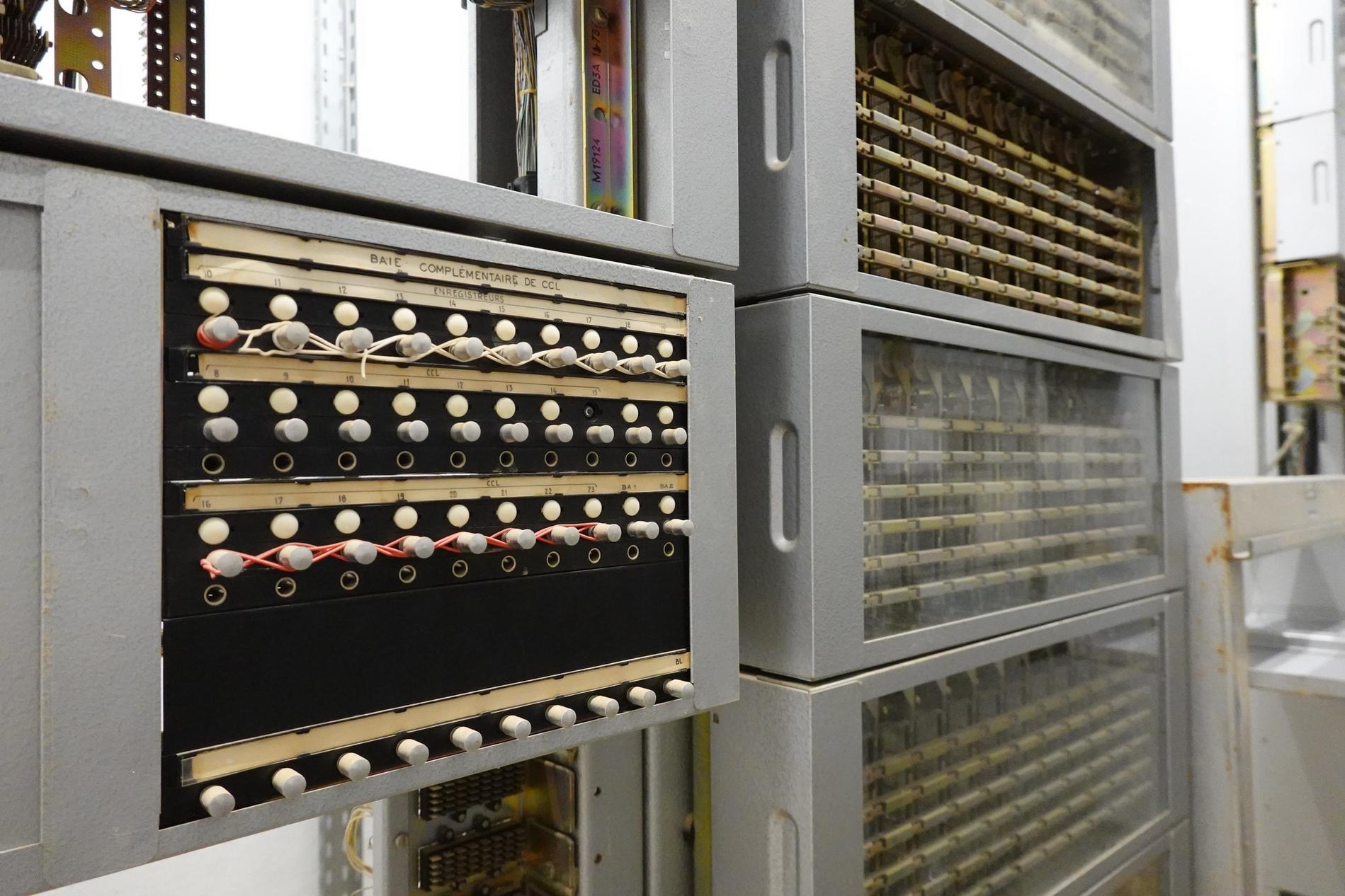 Ci-dessus : baies d'une Unité de Commande Électronique à microprocesseurs venant en remplacement d'une Unité de Commande Électromécanique, dans un Commutateur Crossbar CP400.