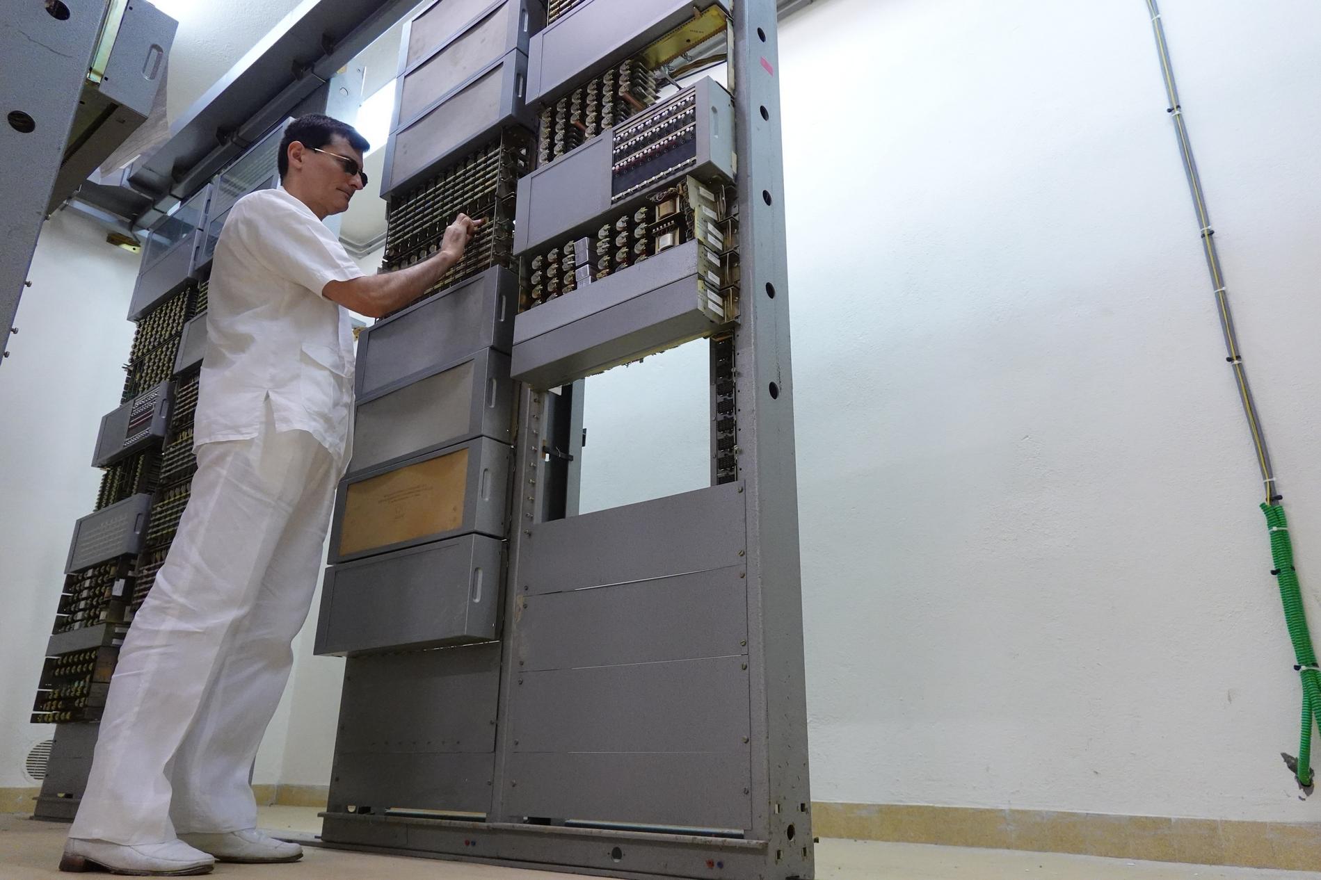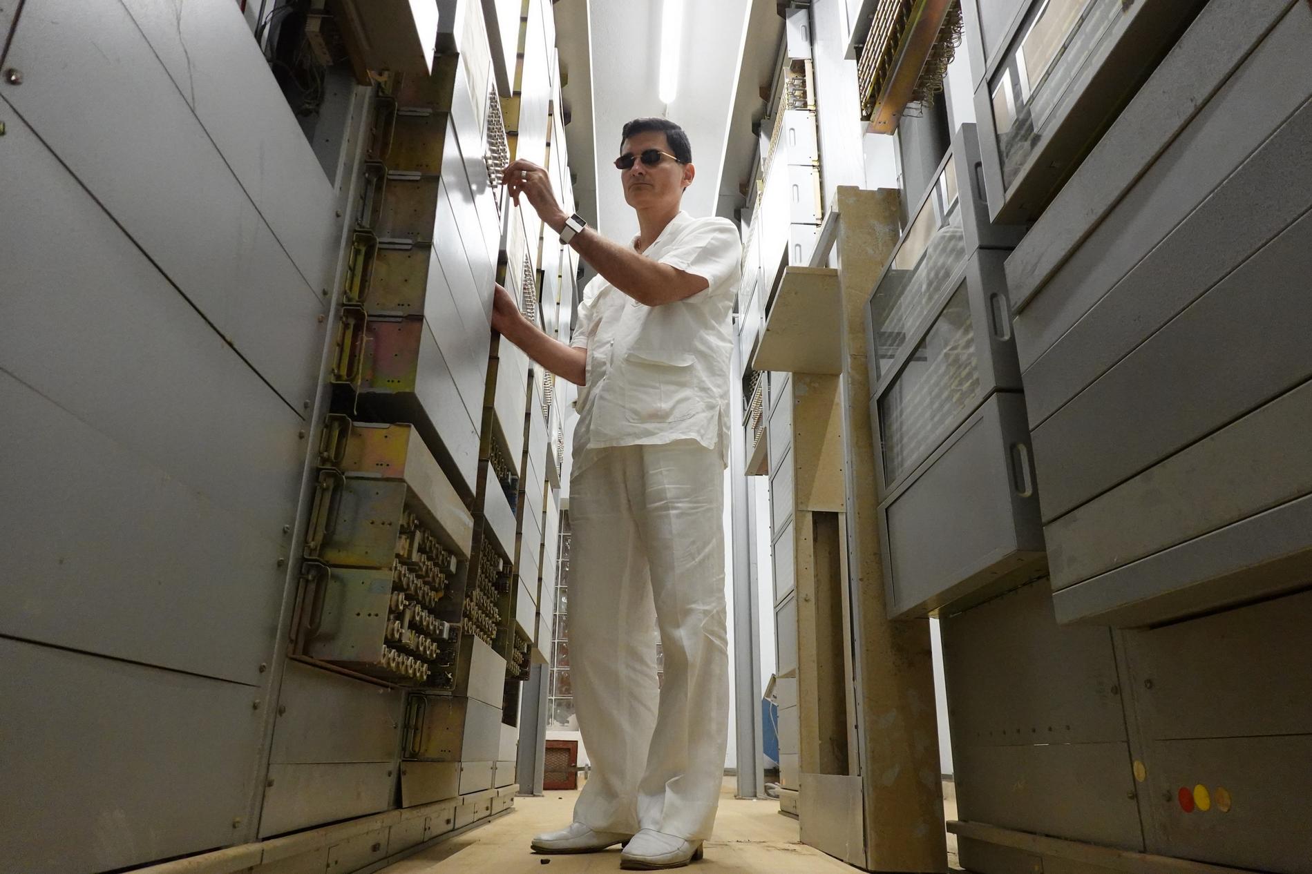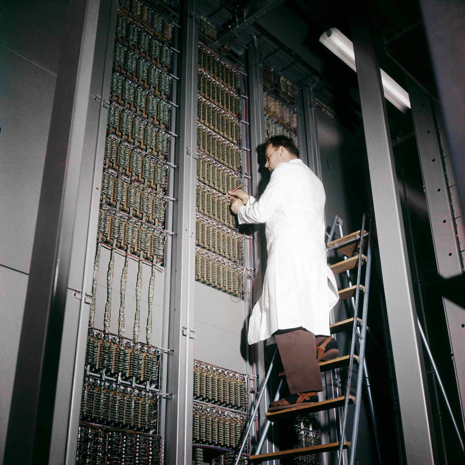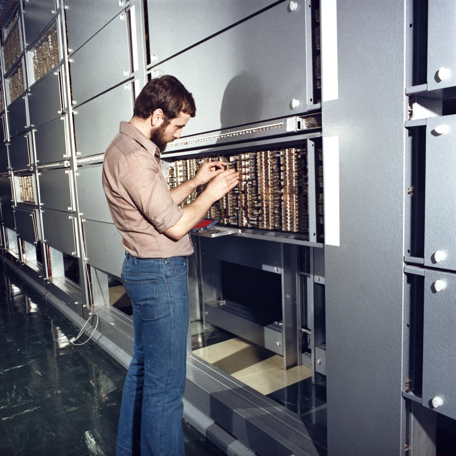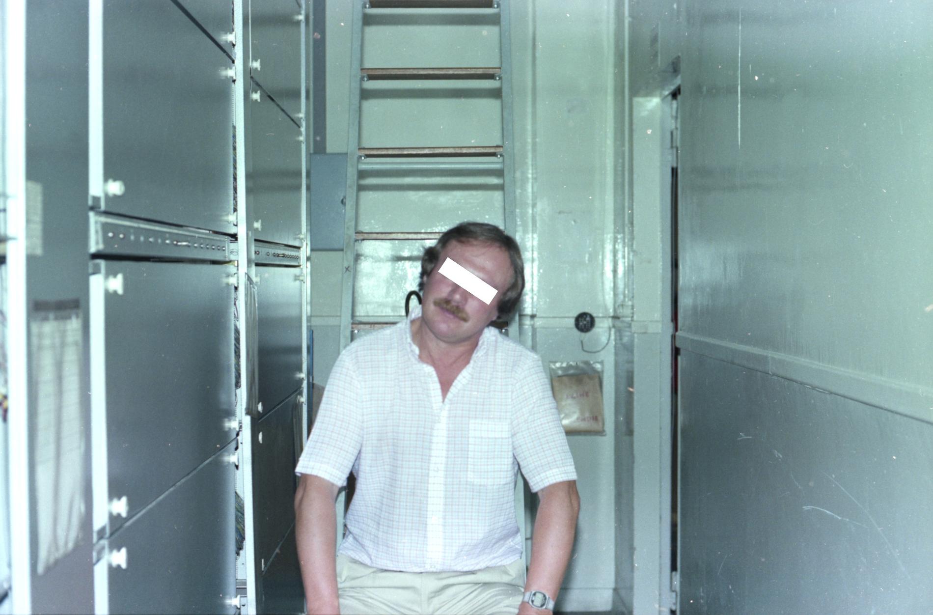 Ci-dessus : Contrôleur des Installations Électro-Mécaniques en intervention au cours du passage à la Nouvelle Numérotation Téléphonique à 8 chiffres sur une baie d'Enregistreurs du Commutateur PENTACONTA 1040 de Paris Auteuil 1 PC1 (AB14).