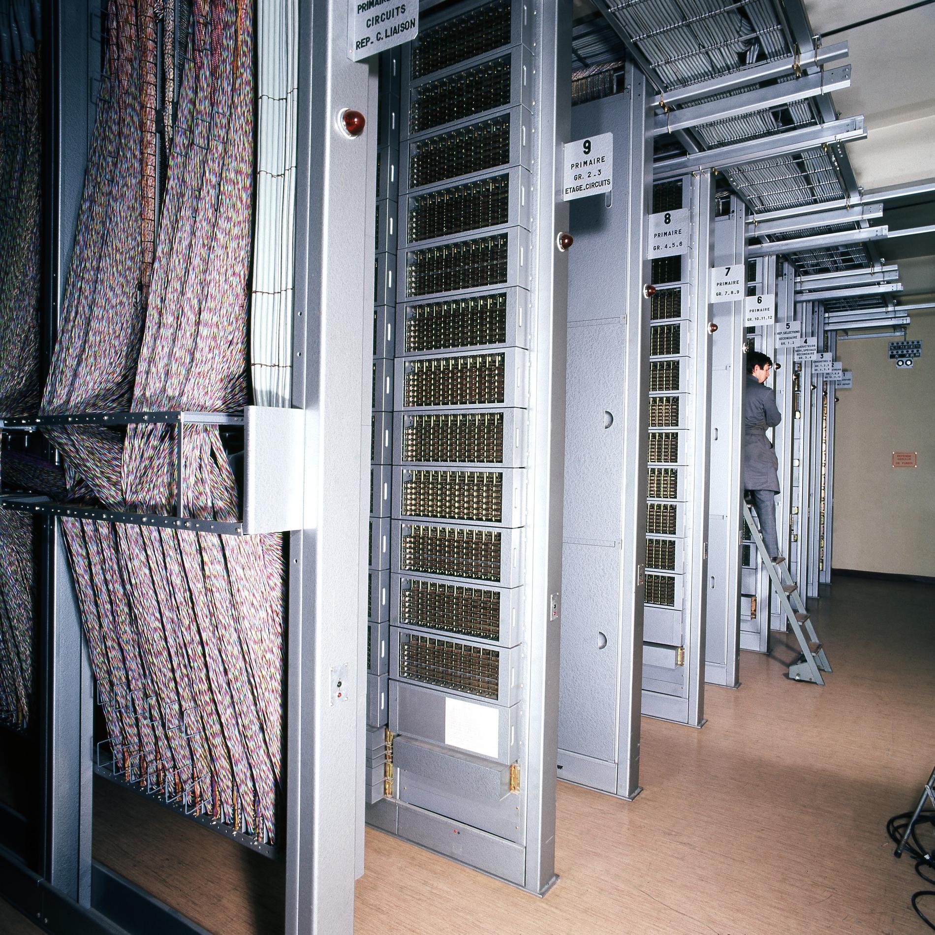 Ci-dessus : vue typique des salles d'énergie mises en service dans les années septante, en plein boom des Commutateurs téléphoniques crossbar pour les gros Commutateurs PENTACONTA ou CP400 d'abonnés.