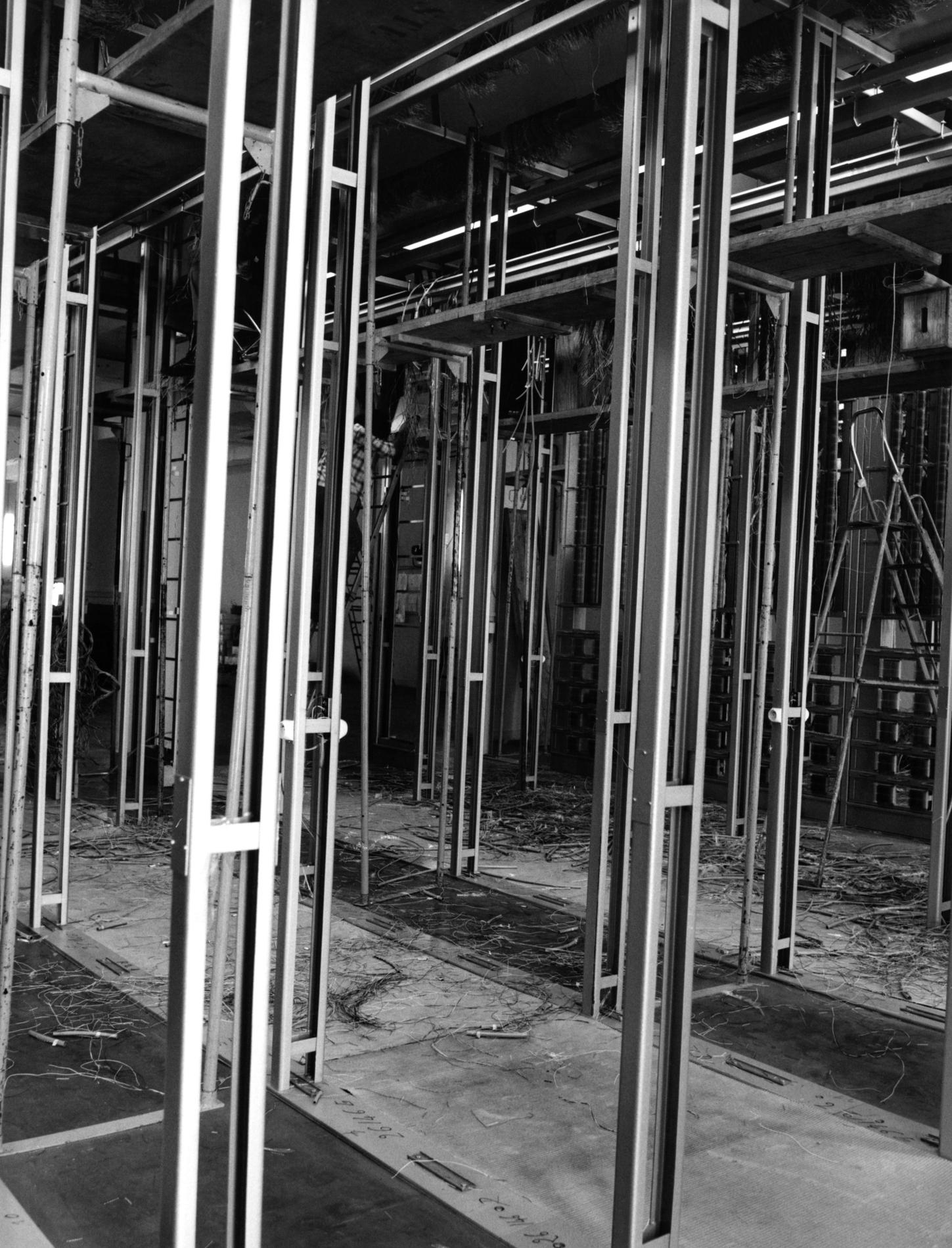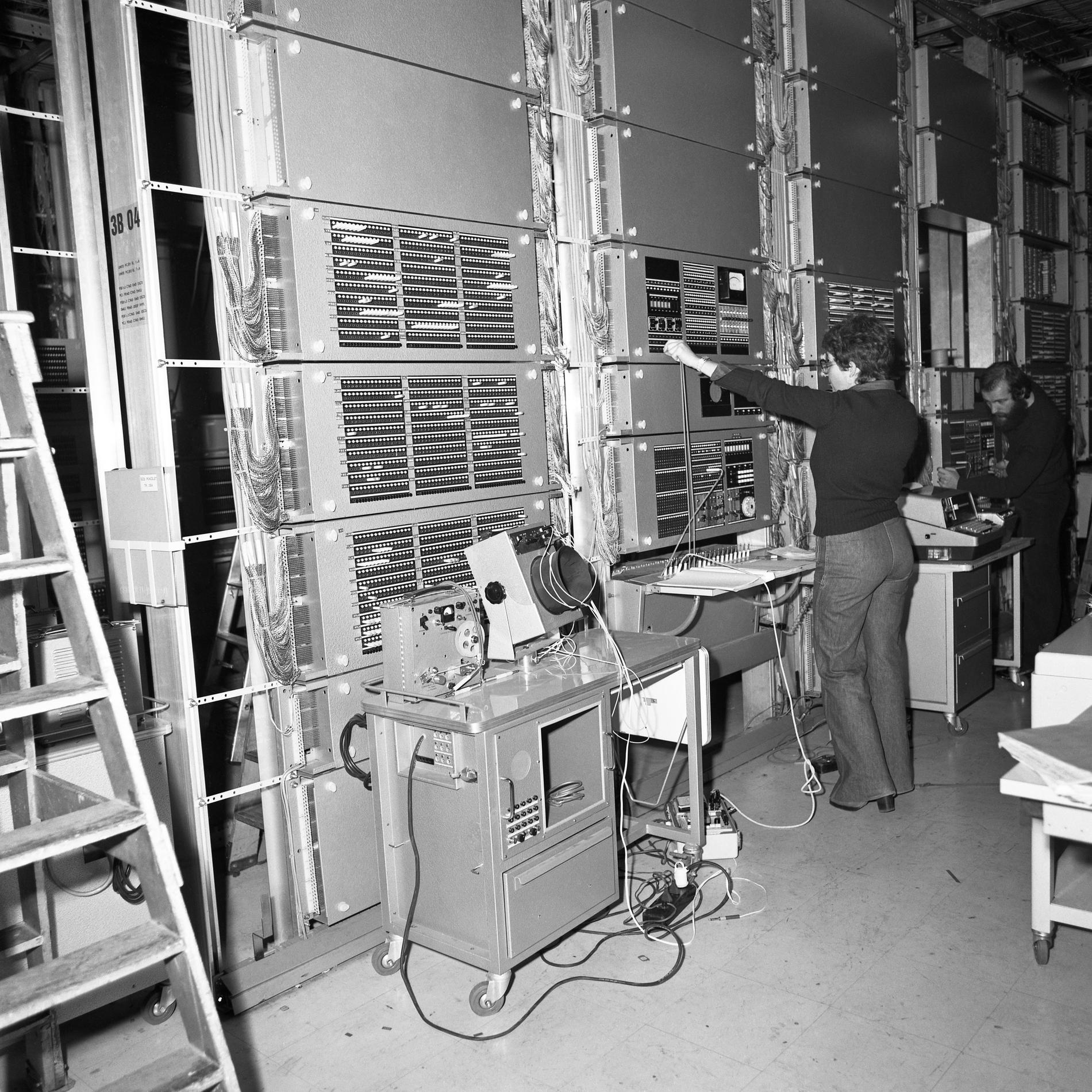 Ci-dessus : agents de la Société des Téléphones Ericsson (STE) assemblant les bâtis et passant les câbles du futur Commutateur CP400-POISSY à Taxation Centralisée - Cergy A1 (NE71).