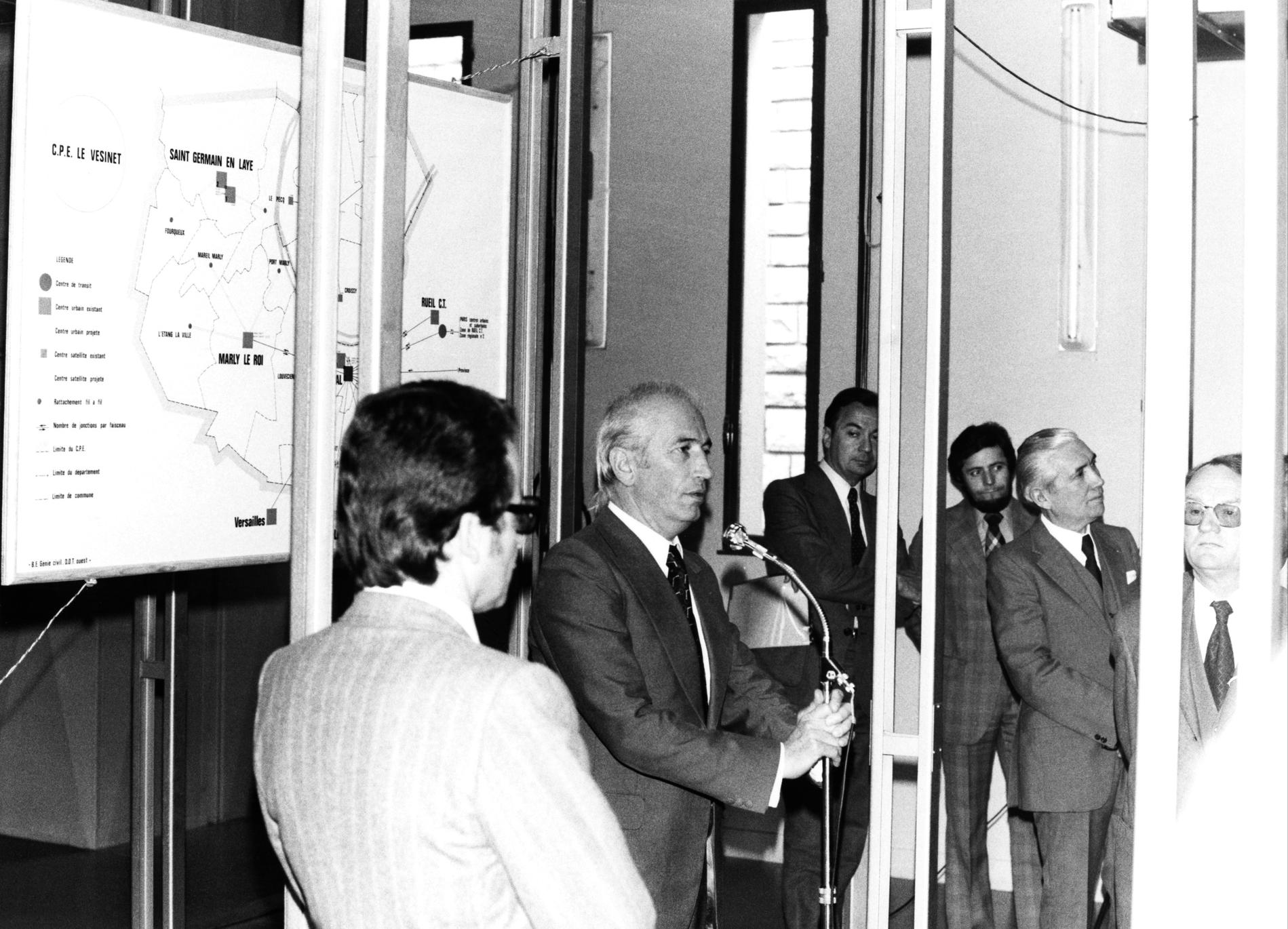 Ci-dessus : après sa mise en service le 12 décembre 1978, visite d'inauguration du 18 décembre 1978 du Commutateur CP400 TÉLEX de Villabé, organisée pour M. le Préfet de l'Essonne sur le territoire de la Direction des Télécommunications d’Évry (91).