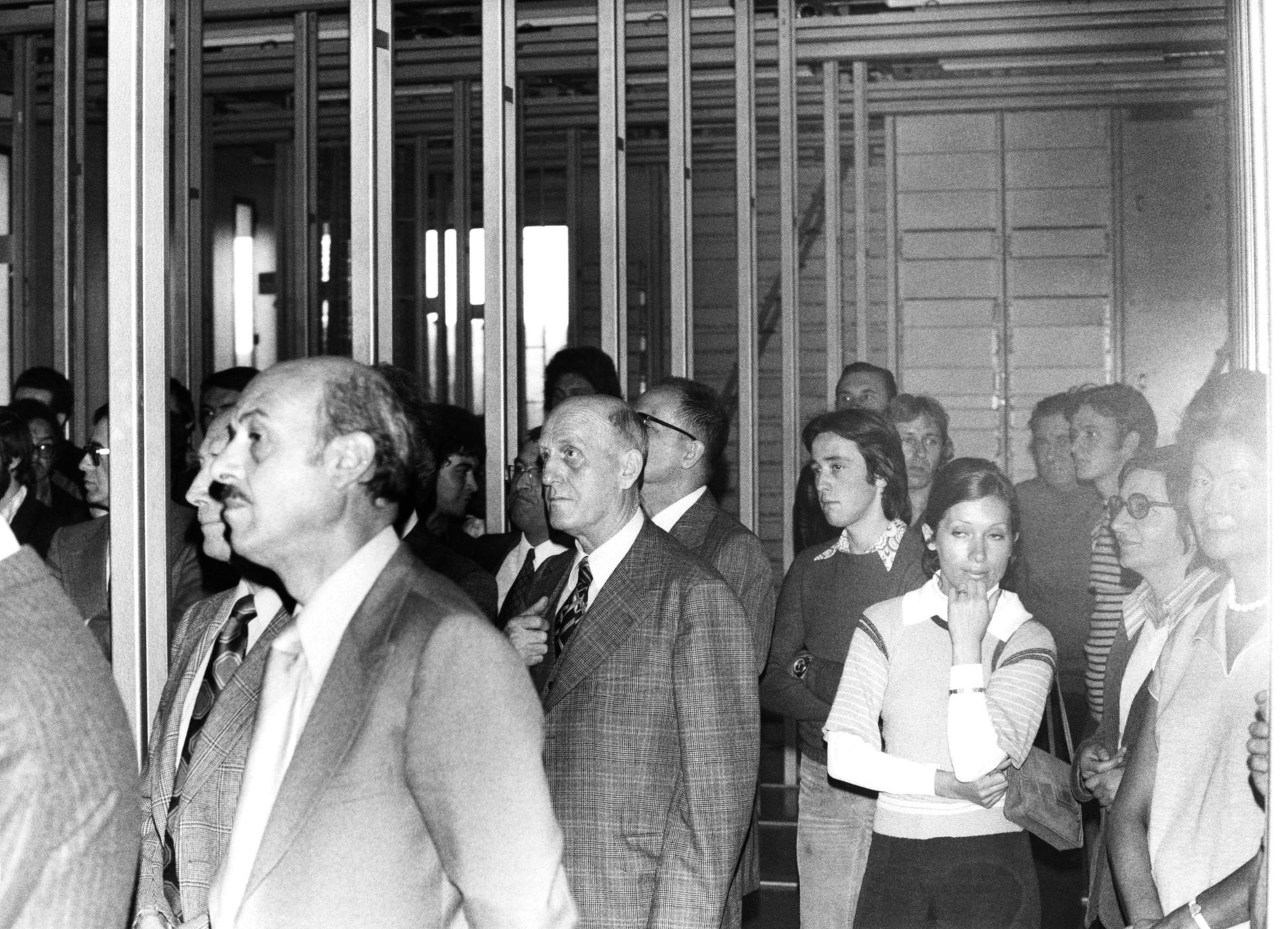 Ci-dessus : M. le Secrétaire d'État aux Postes et Télécommunications - Pierre Lelong le 21 janvier 1975 dans le Répartiteur, participant au basculage des abonnés, jour de la mise en service du Commutateur CP400-POISSY à Taxation Centralisée de Chanteloup-les-Vignes (WD16).