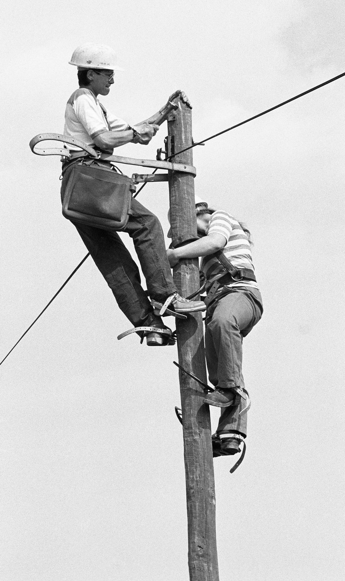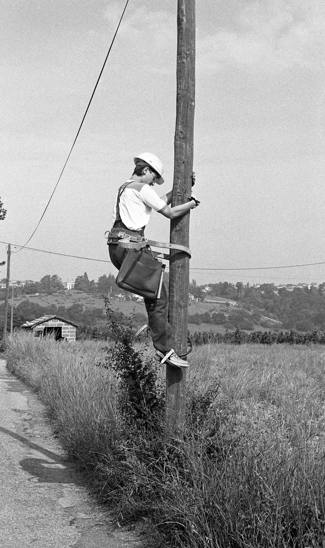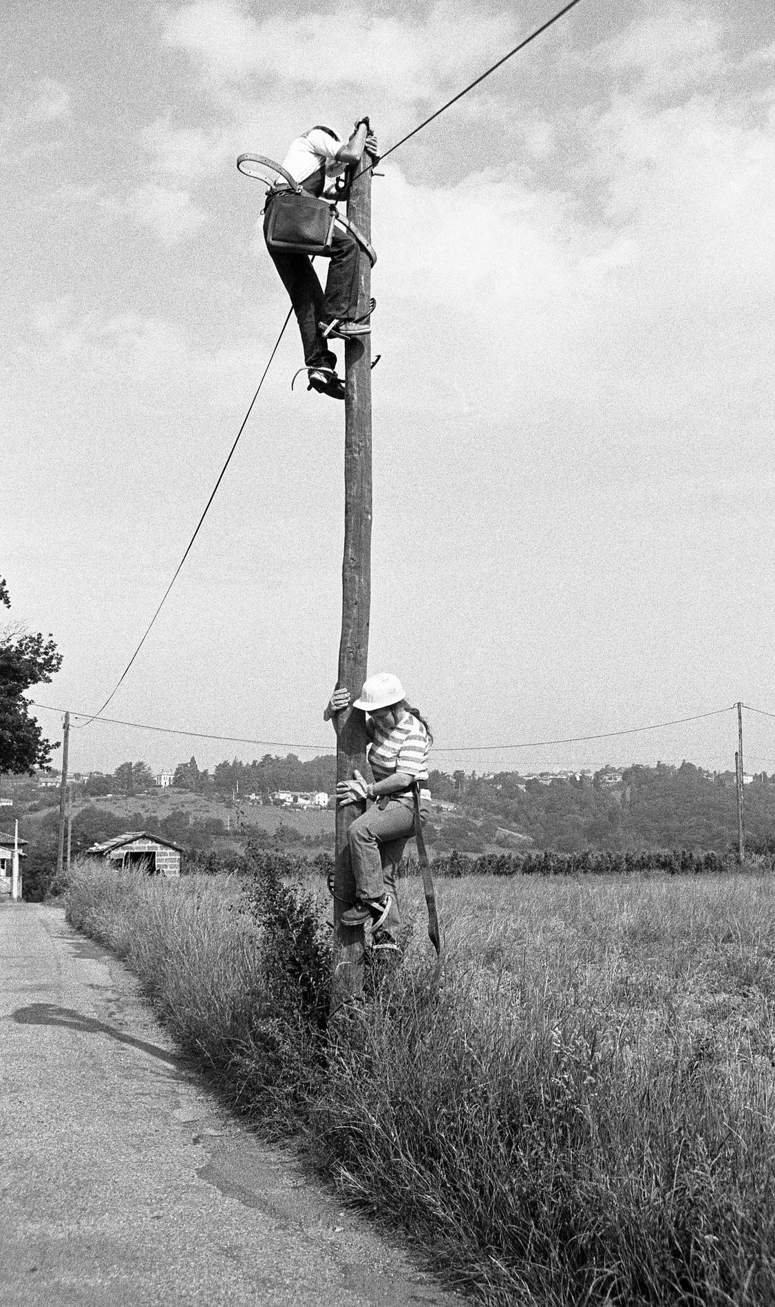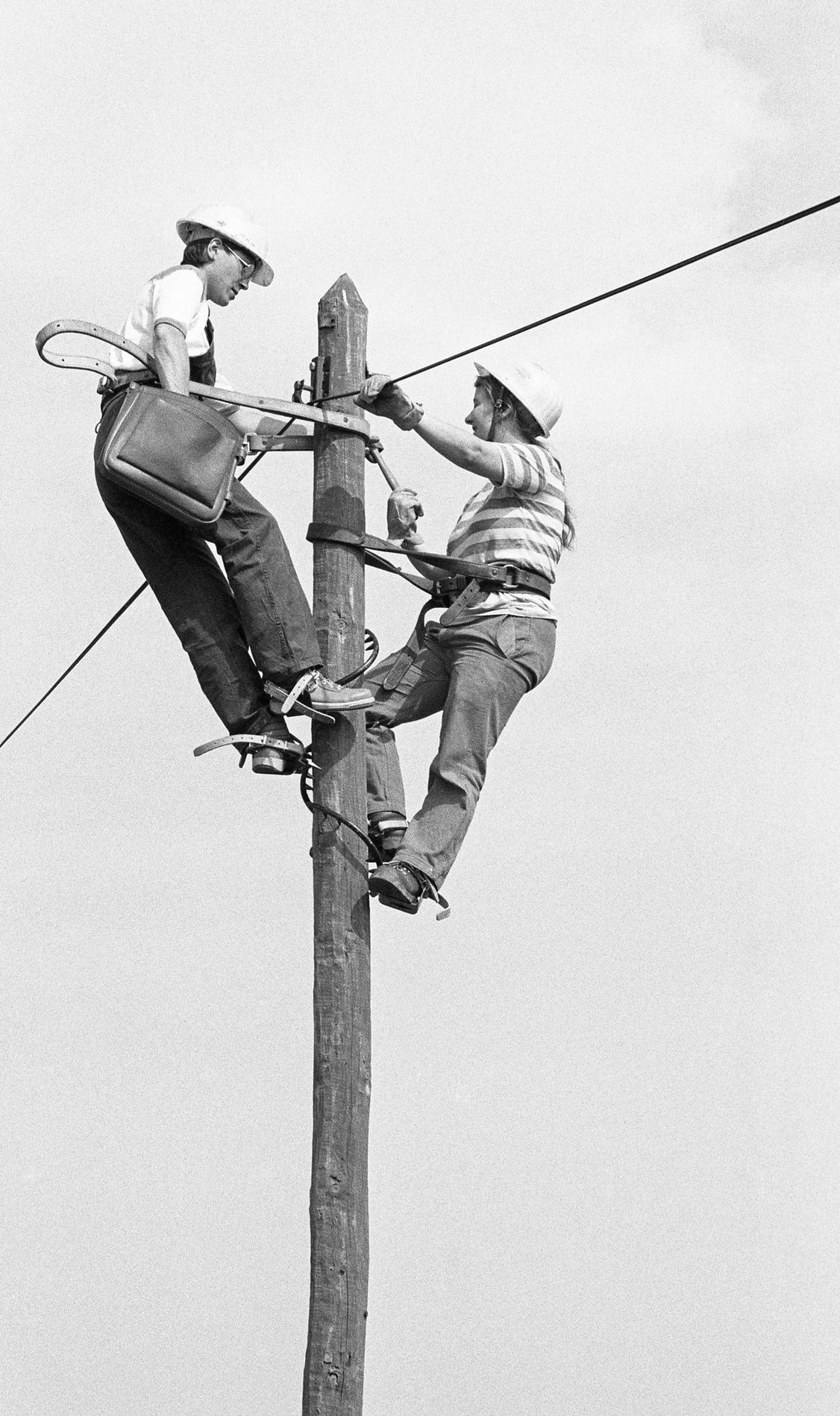 Ci-dessus : deux agents des lignes en intervention sur un poteau téléphonique en bois pour réparer le téléphone.