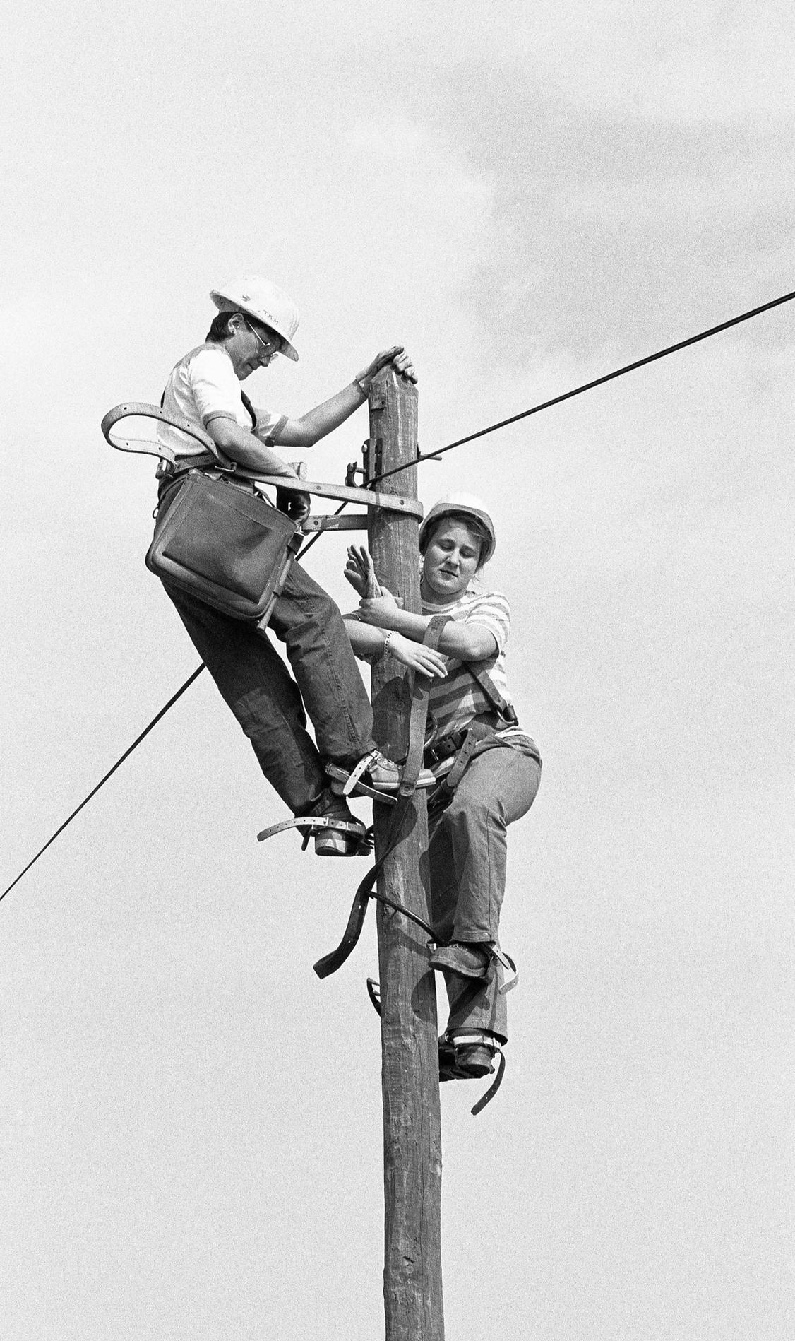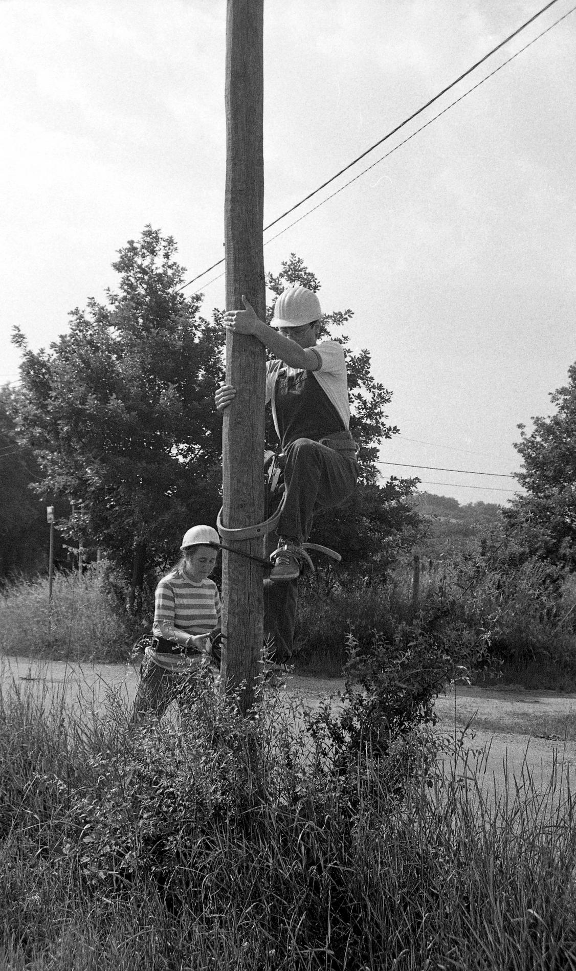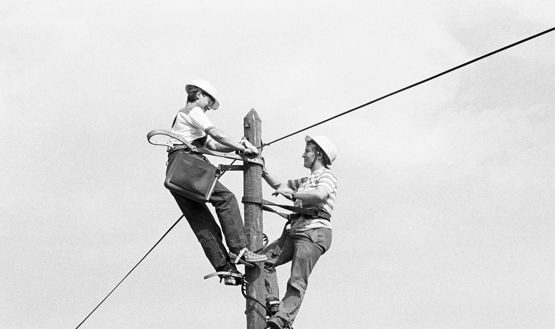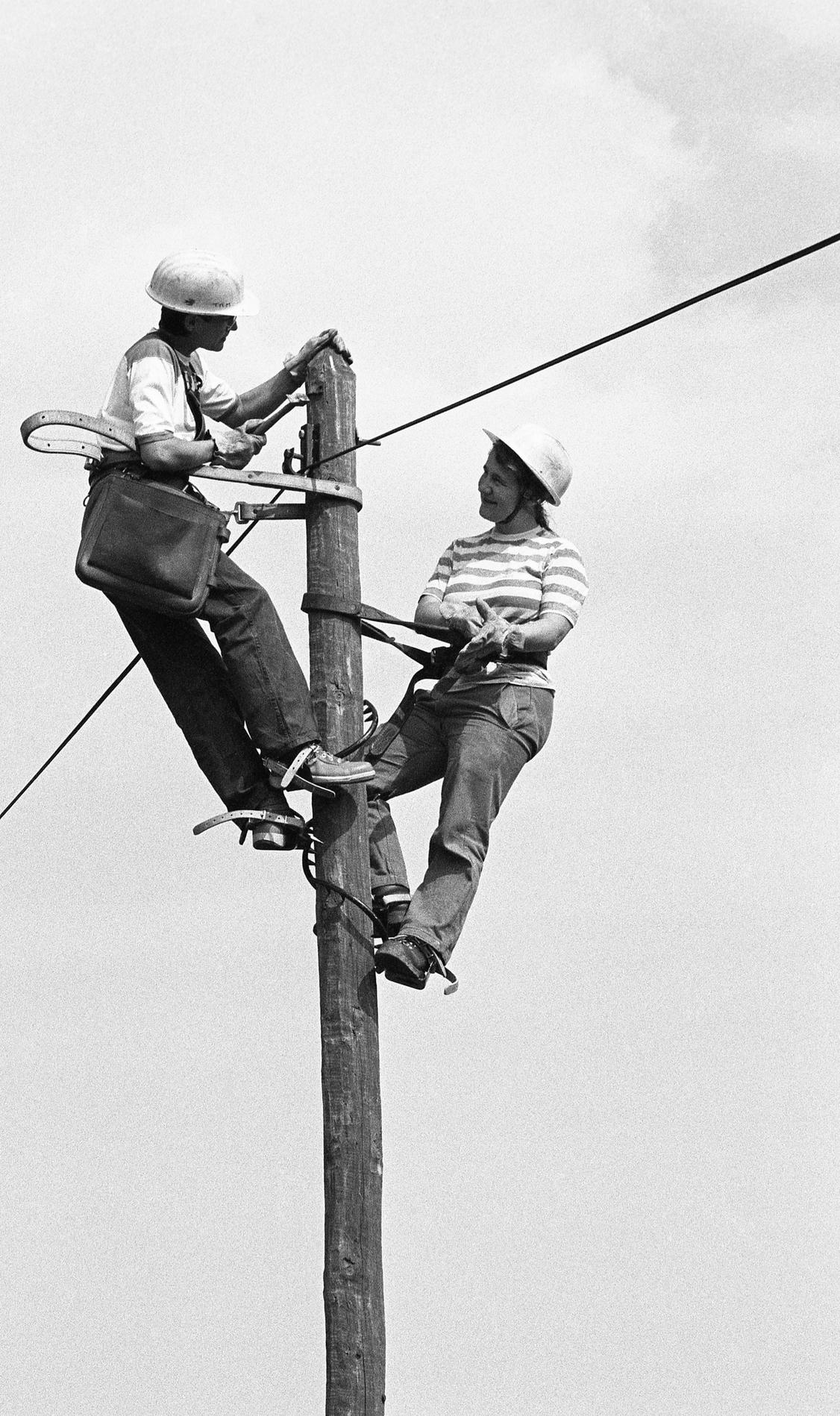 Ci-dessus : deux agents des lignes en intervention sur un poteau téléphonique en bois pour réparer le téléphone.