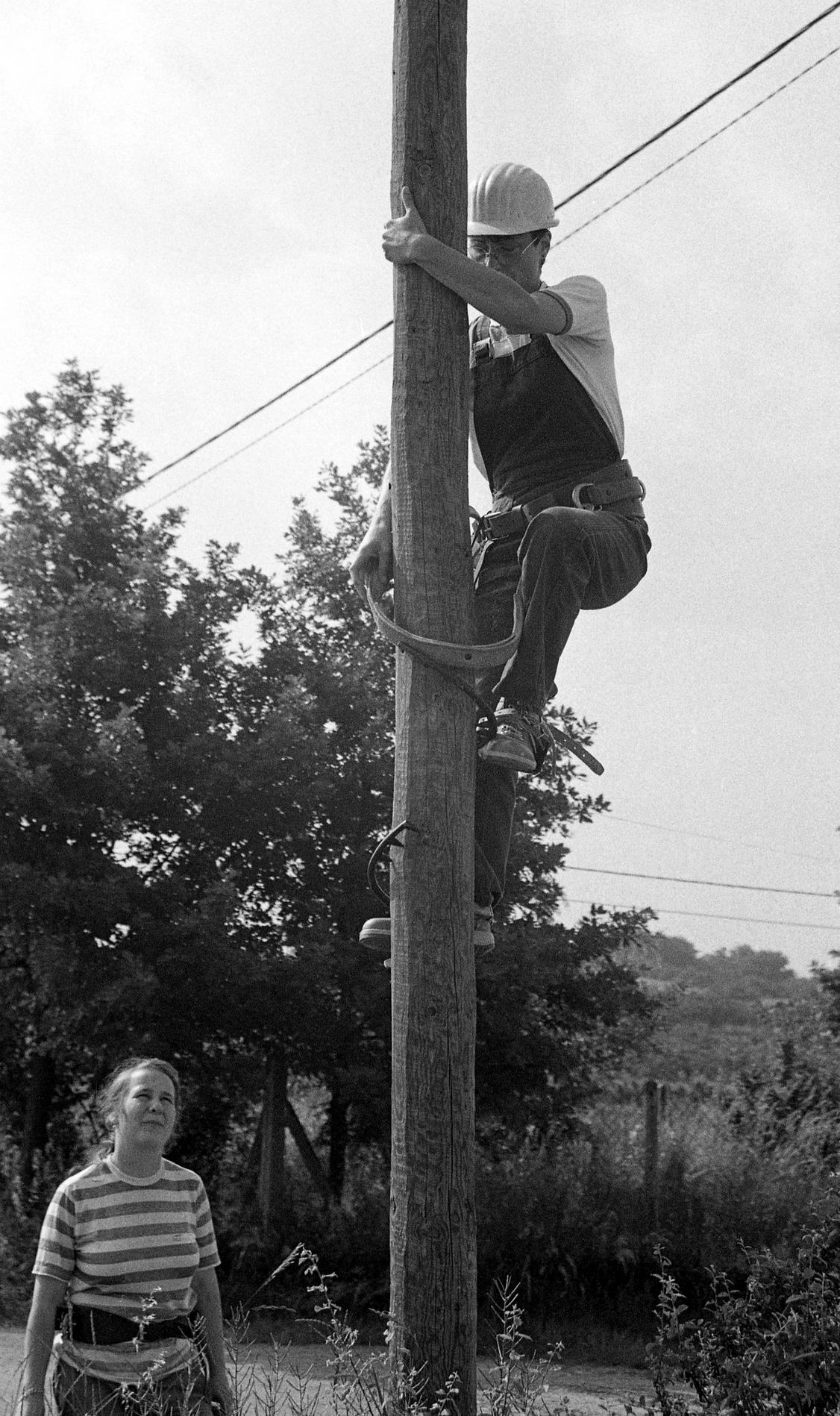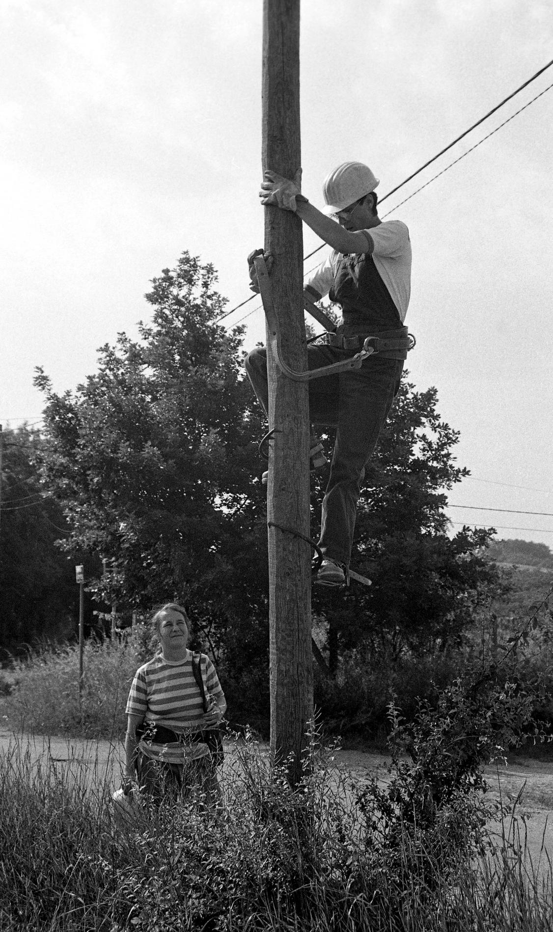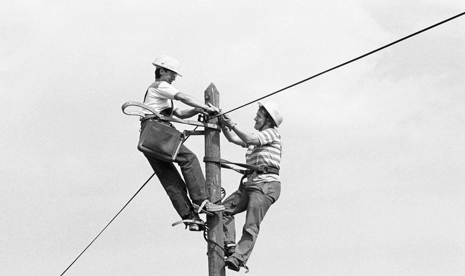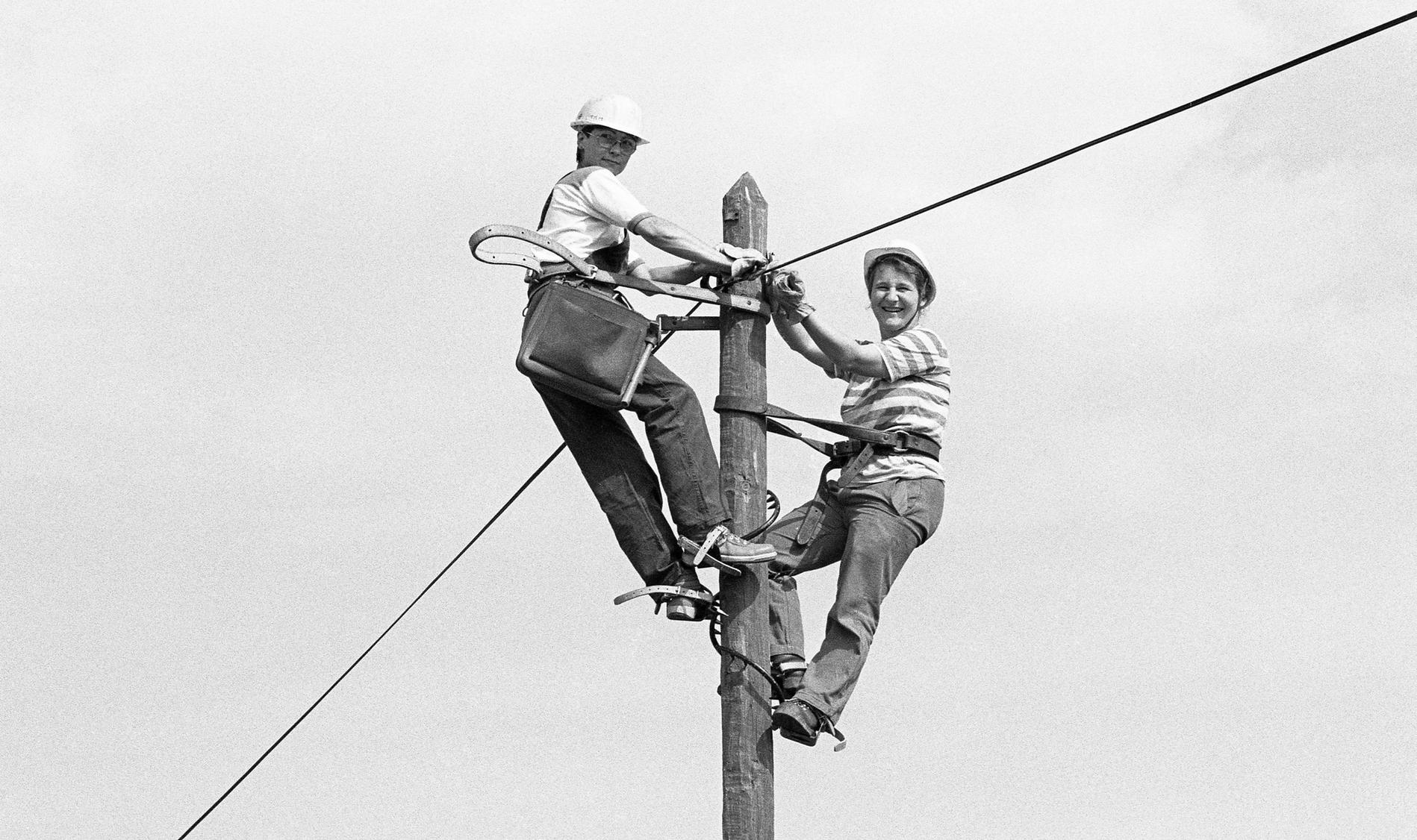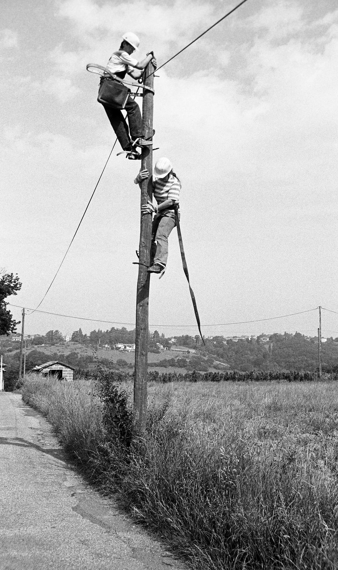 Ci-dessus : deux agents des lignes en intervention sur un poteau téléphonique en bois pour réparer le téléphone.