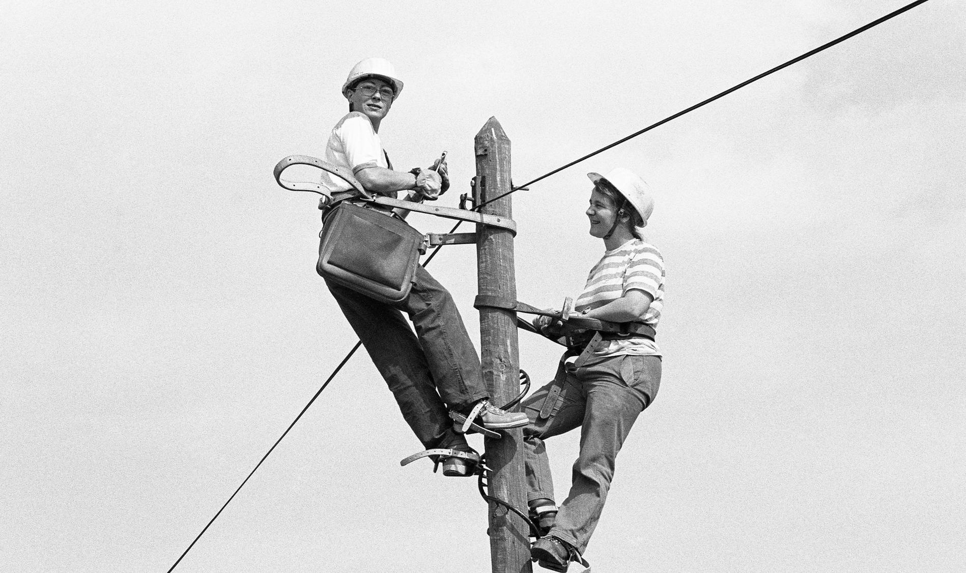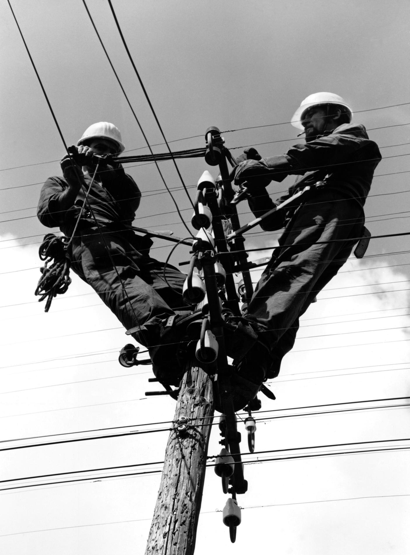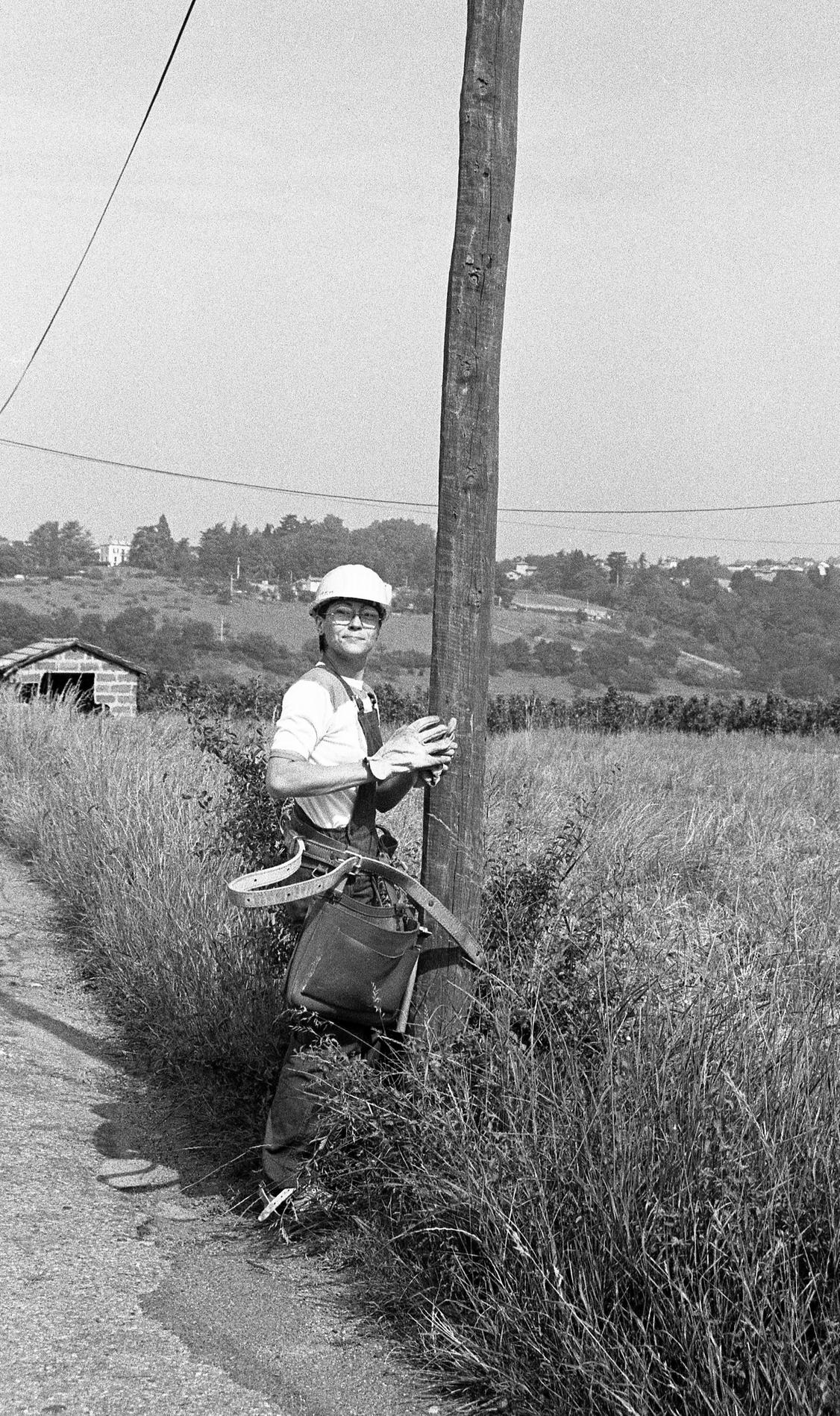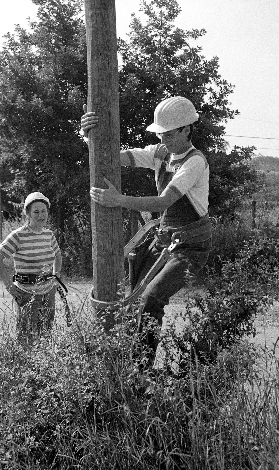 Ci-dessus : deux agents des lignes en intervention sur un poteau téléphonique en bois pour réparer le téléphone.