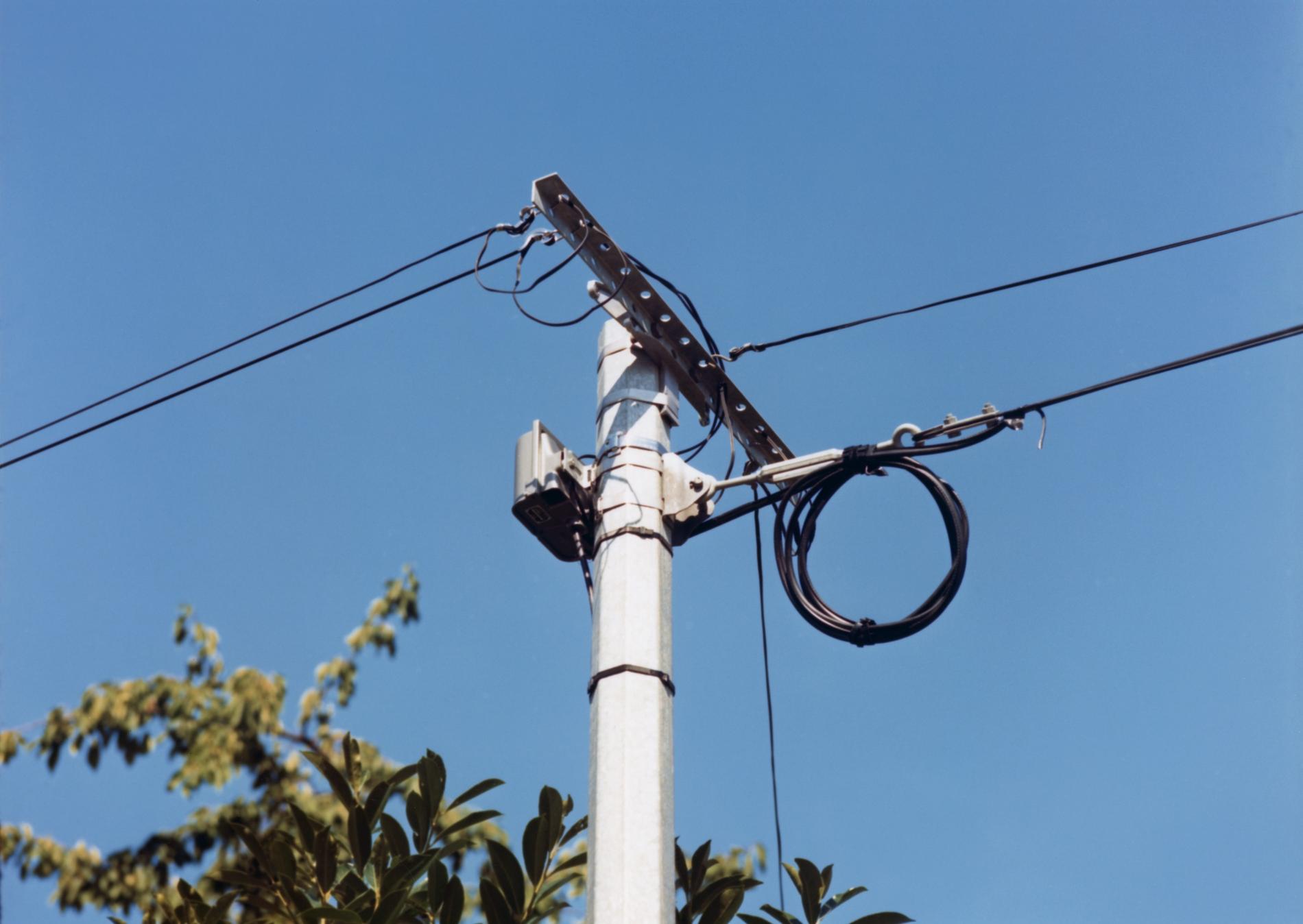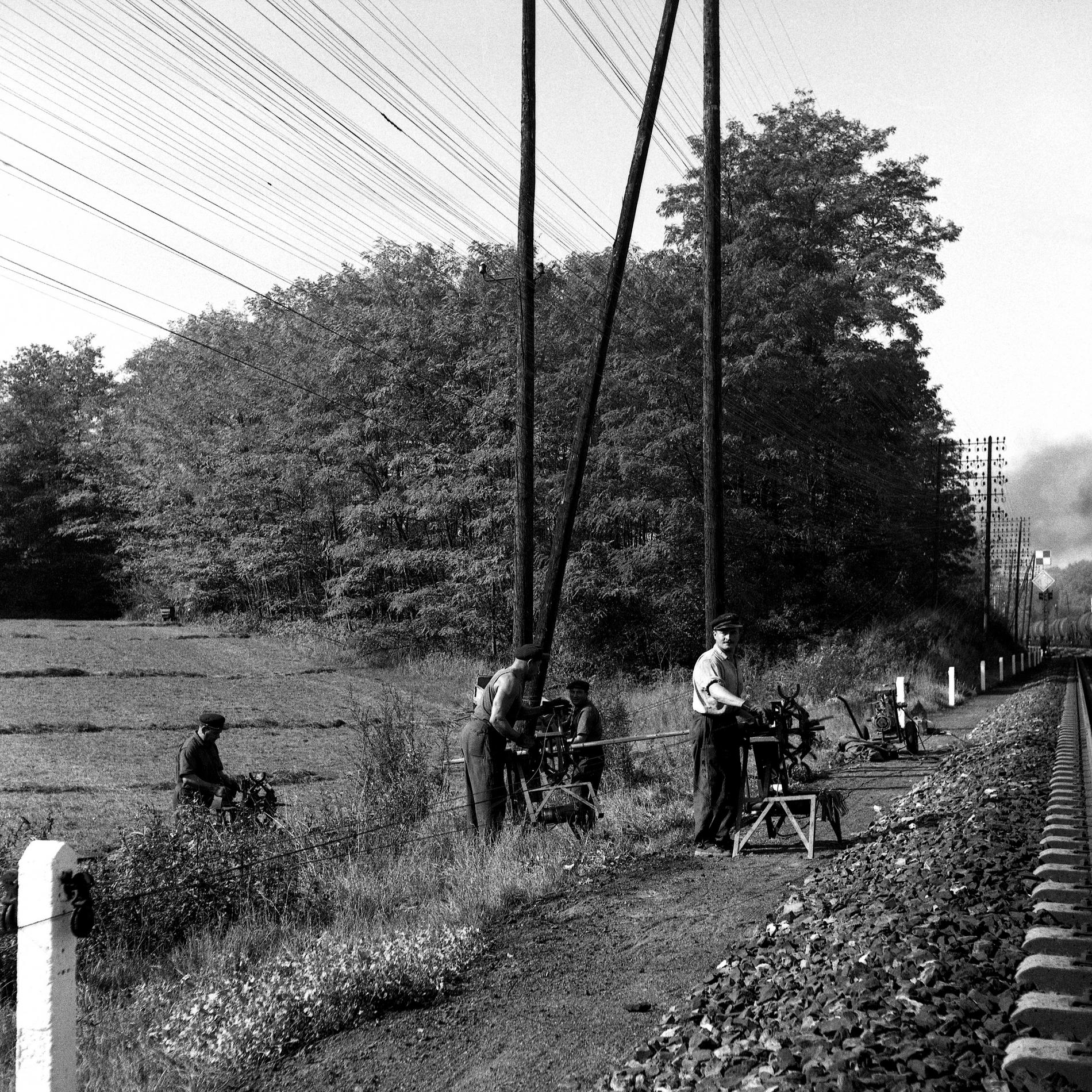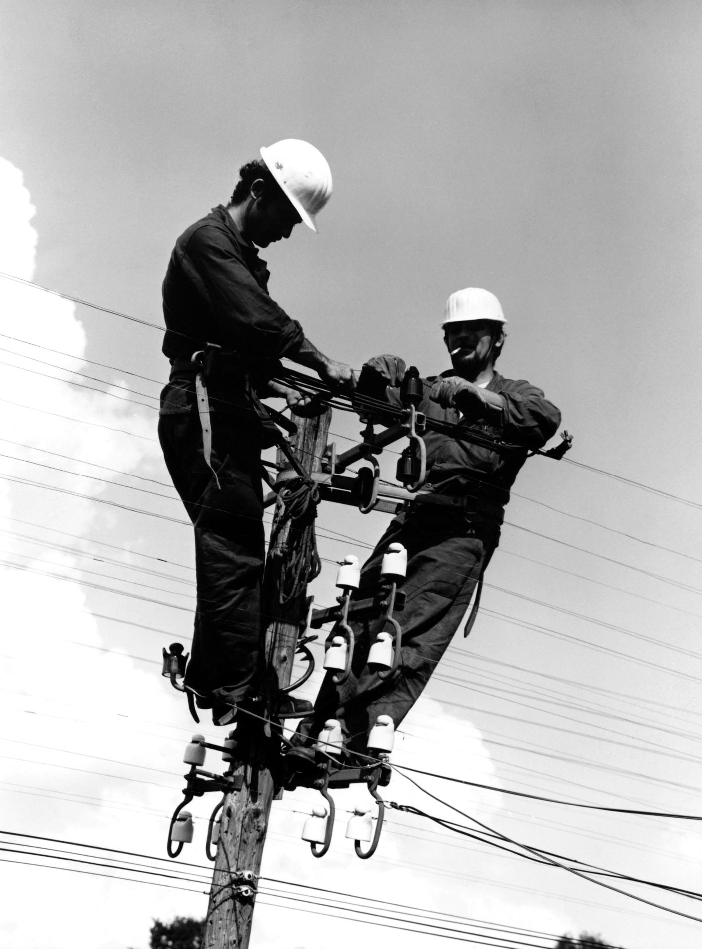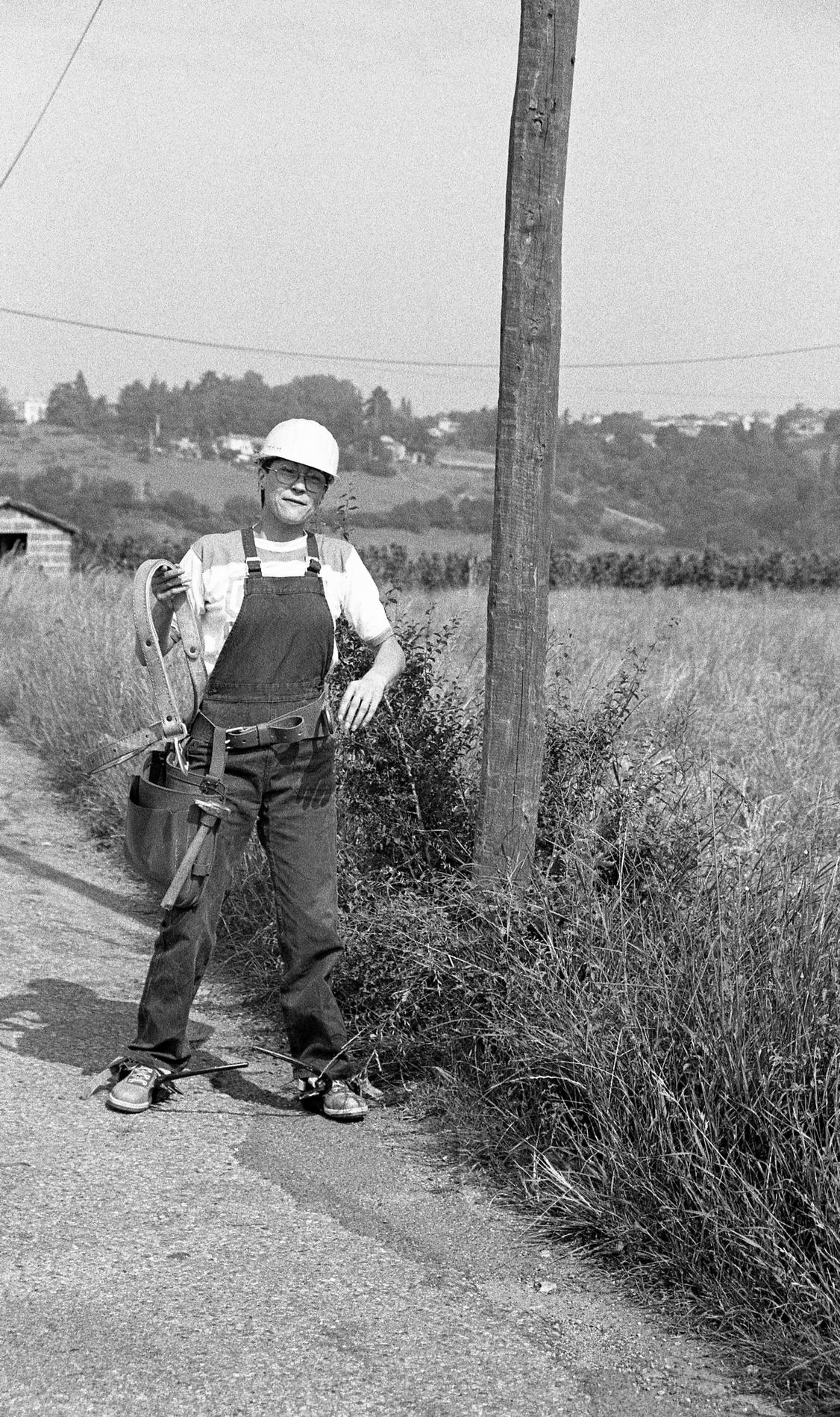 Ci-dessus : deux agents des lignes en intervention sur un poteau téléphonique en bois pour réparer le téléphone.