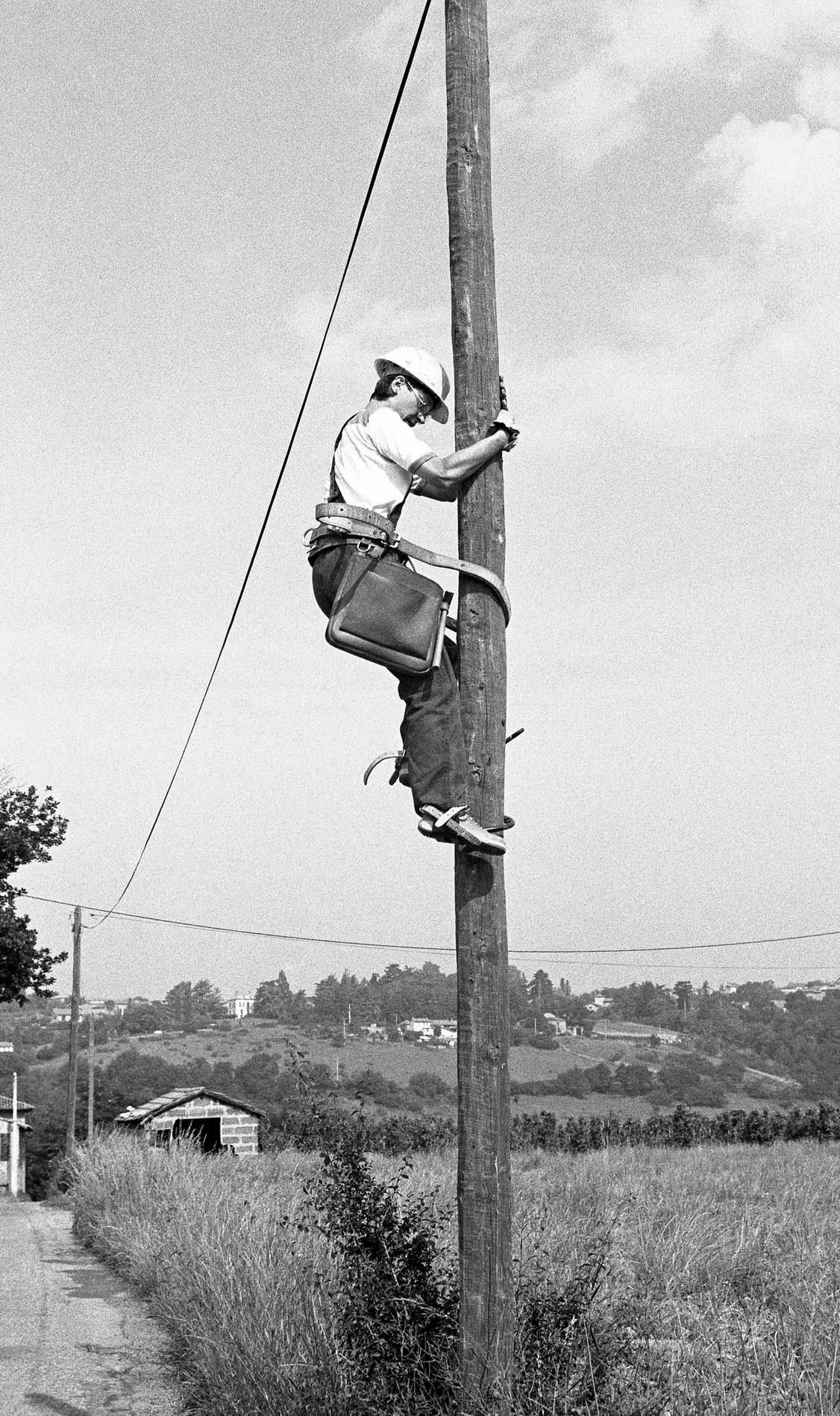 Ci-dessus : un agent des lignes en haut d'un poteau téléphonique en bois, pour une intervention au niveau des isolateurs de verre.