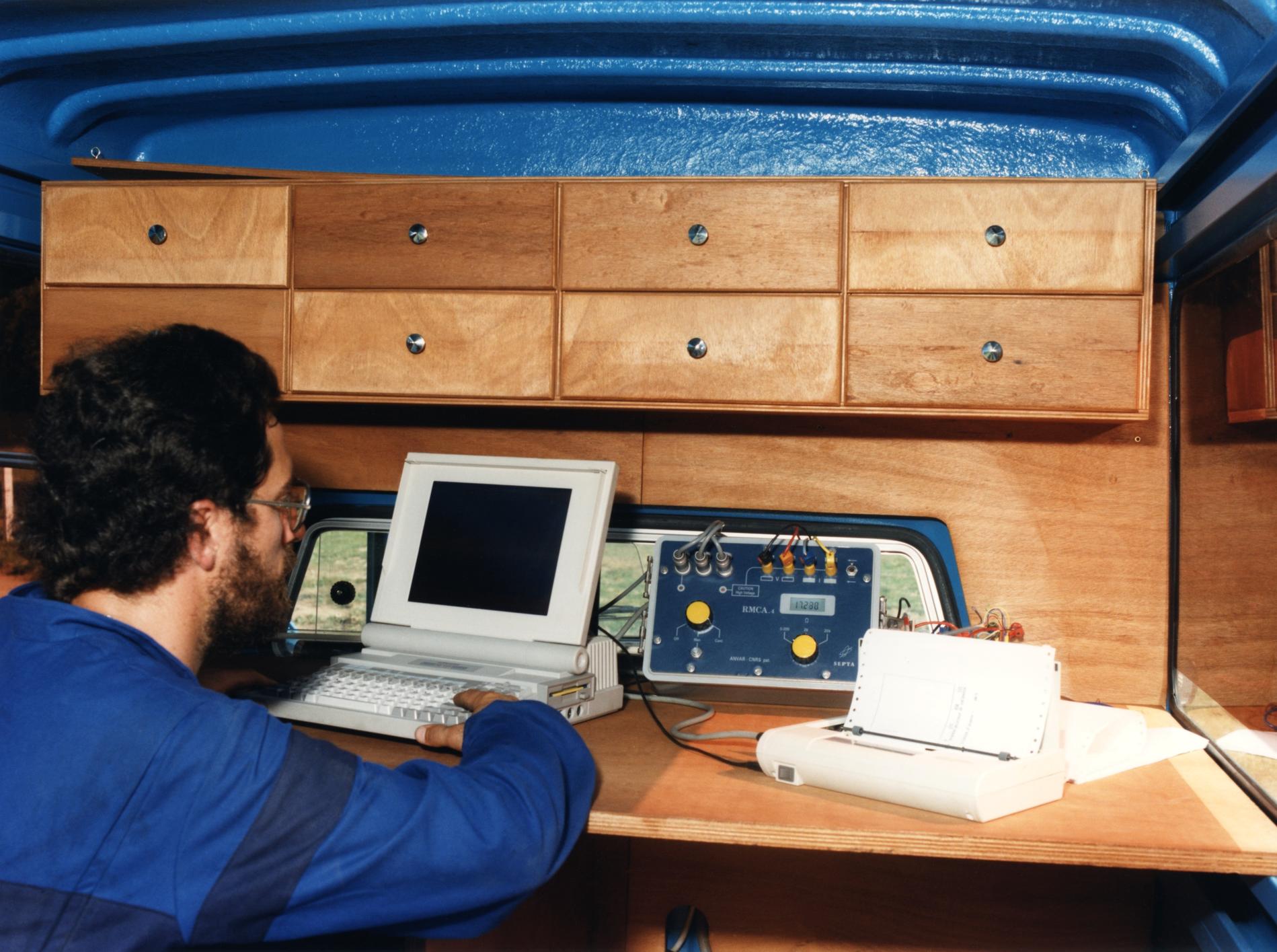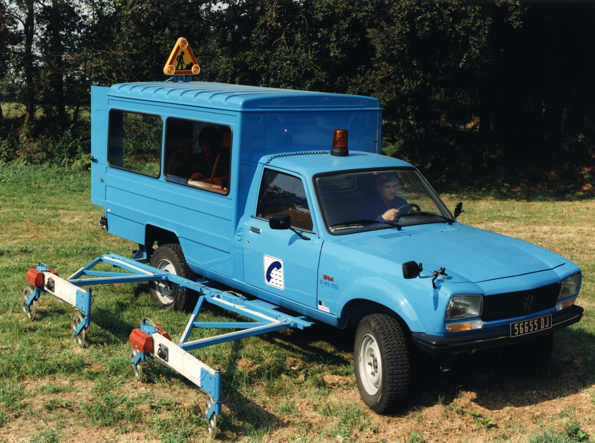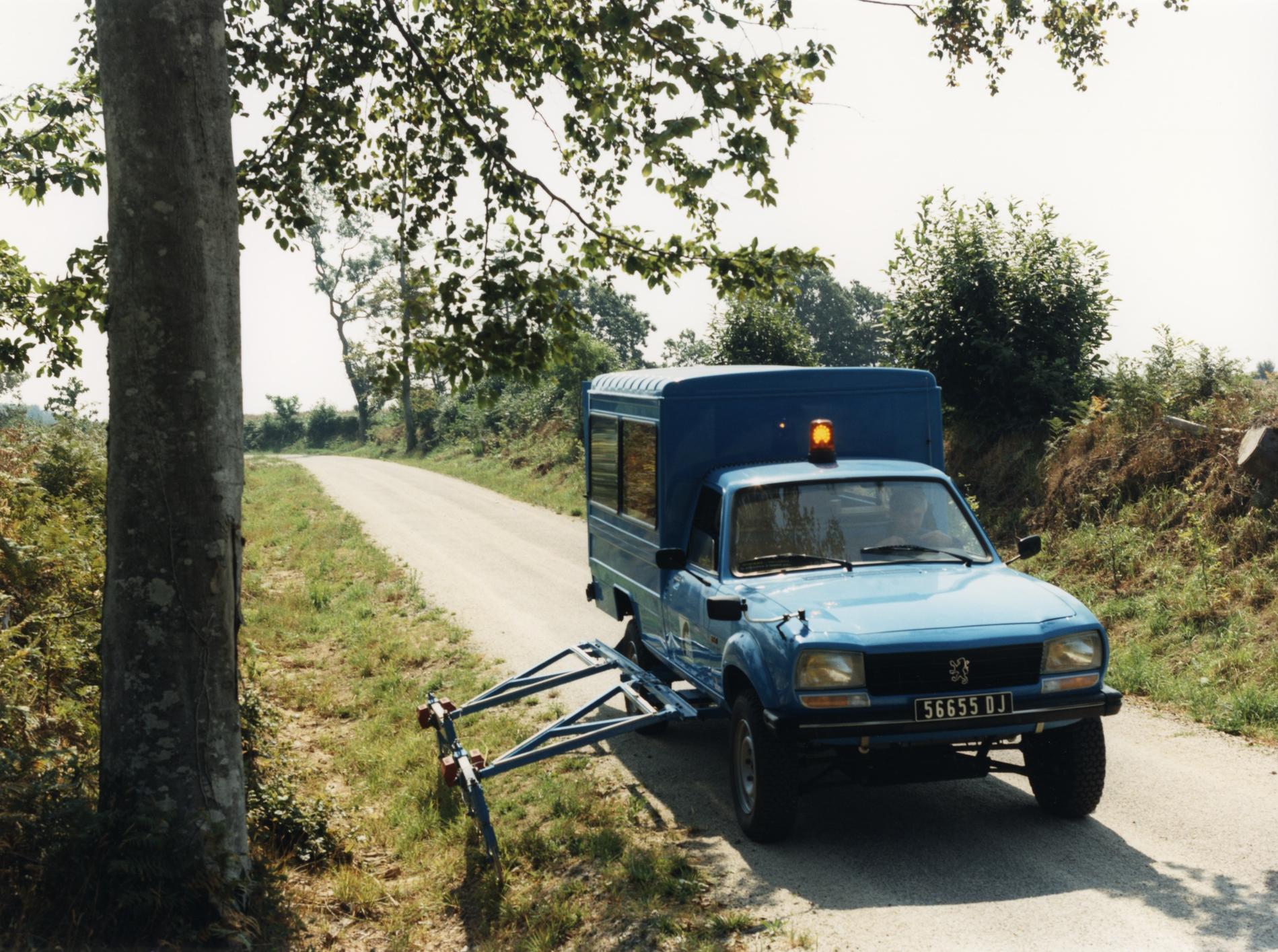 Ci-dessus : Véhicule-odomètre Peugeot utilisé par deux agents d'un Centre de Construction des Lignes d'Ille-et-Vilaine (Rennes 1 ou Rennes 2), entièrement équipé pour la mesure de tronçons en vue de définir les futures longueurs de câbles téléphoniques à poser.