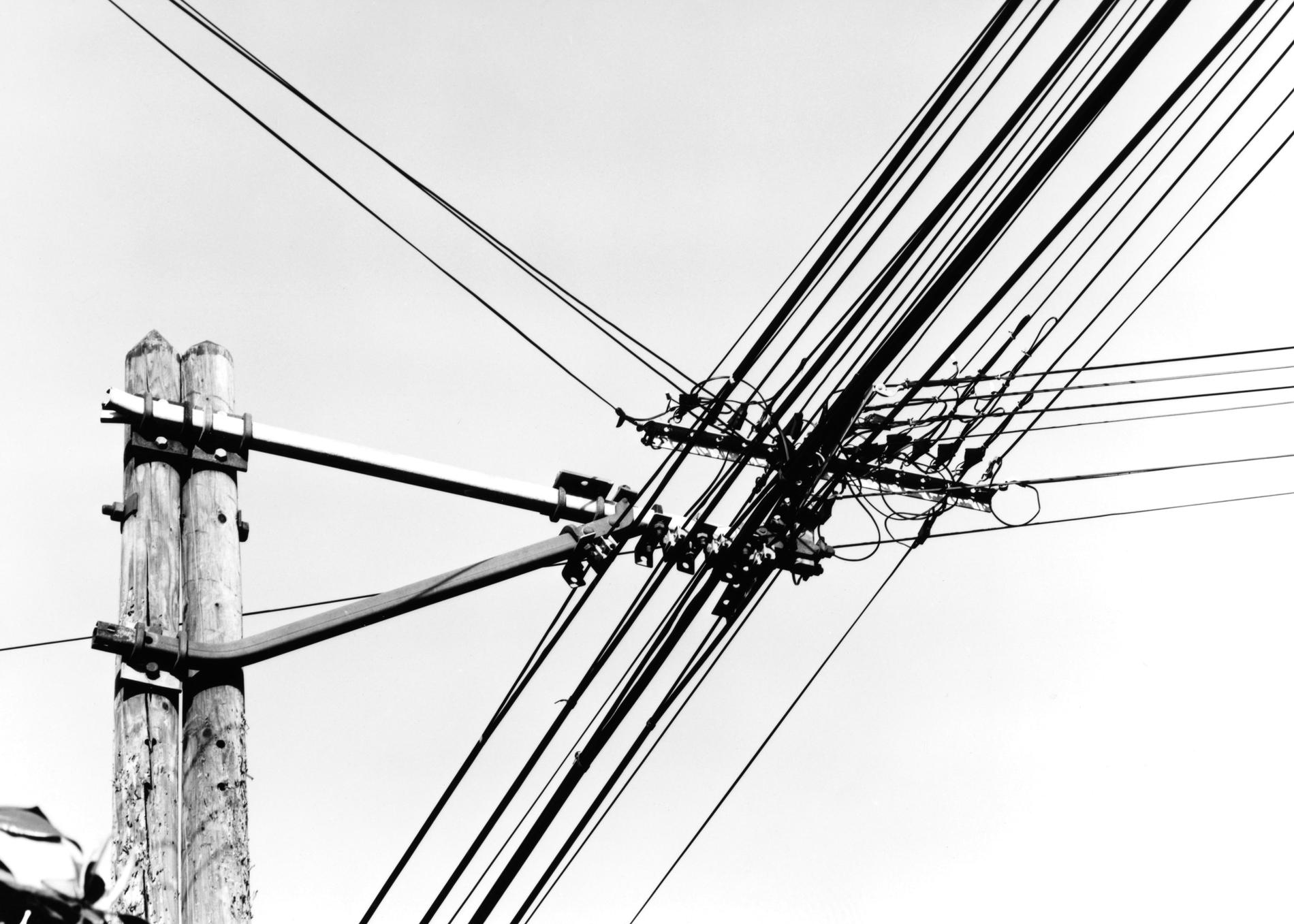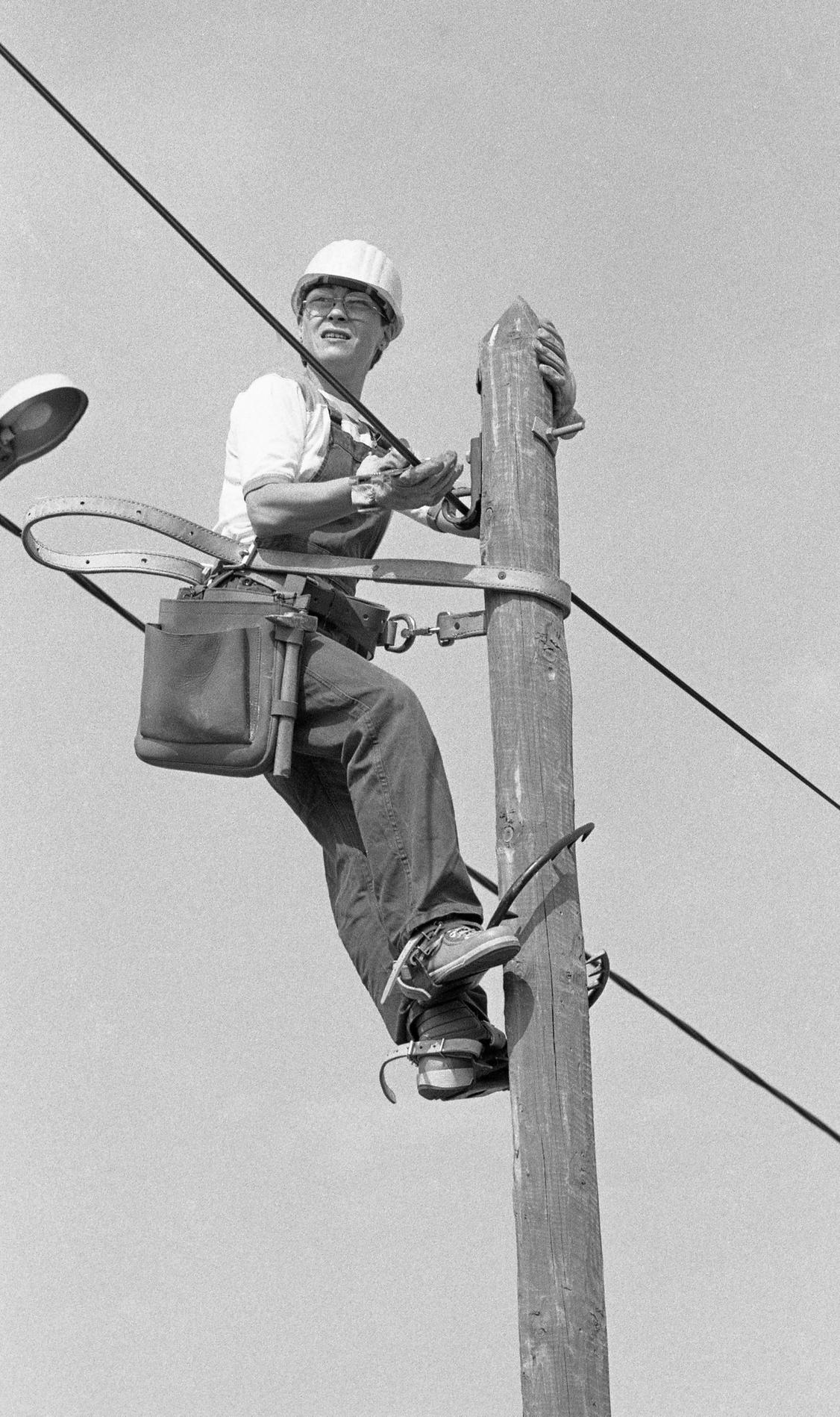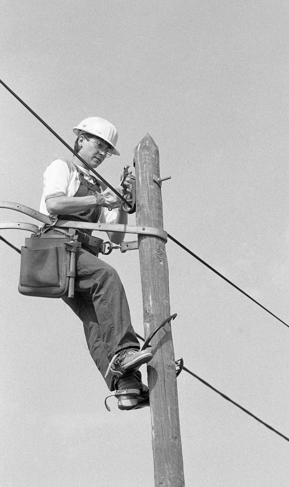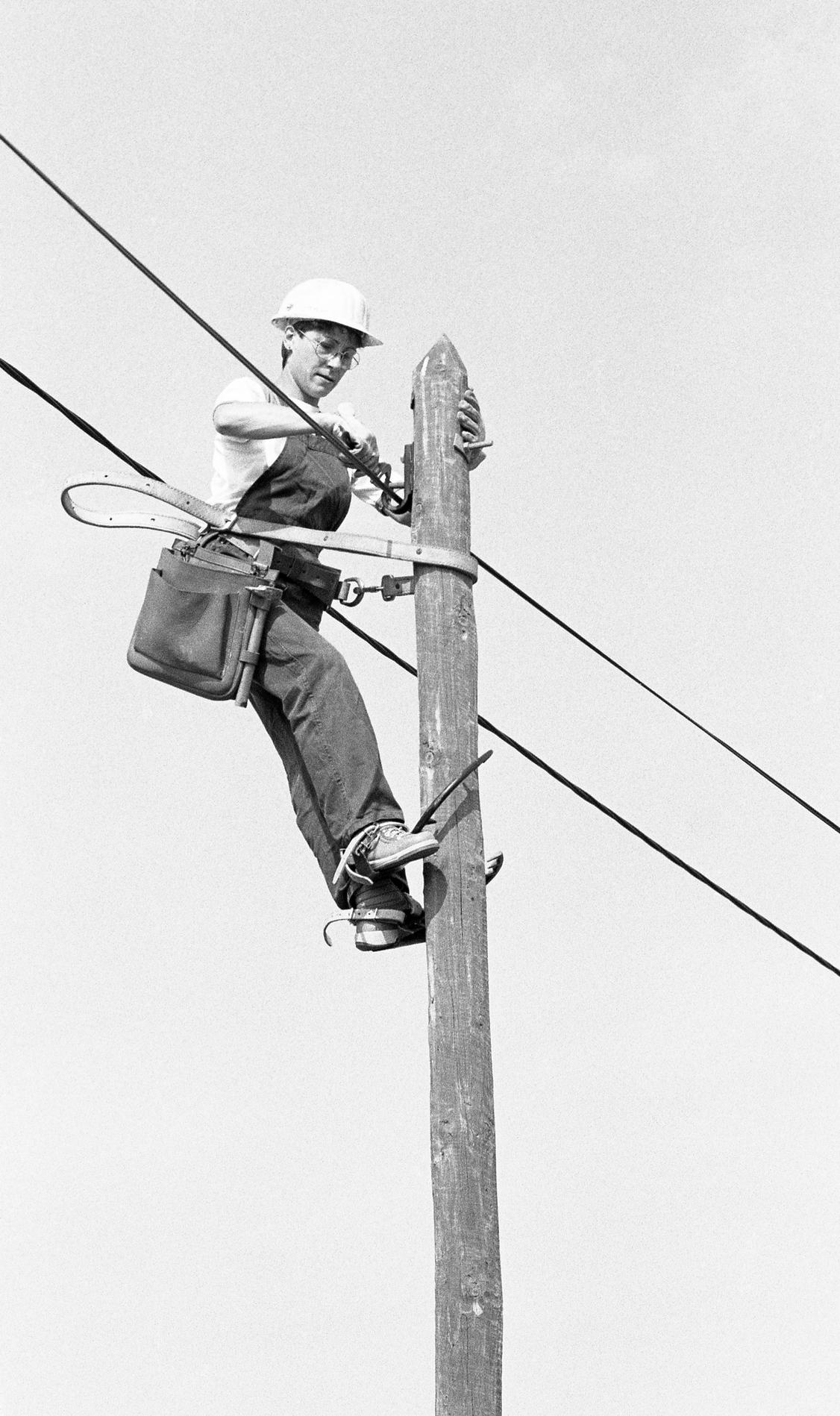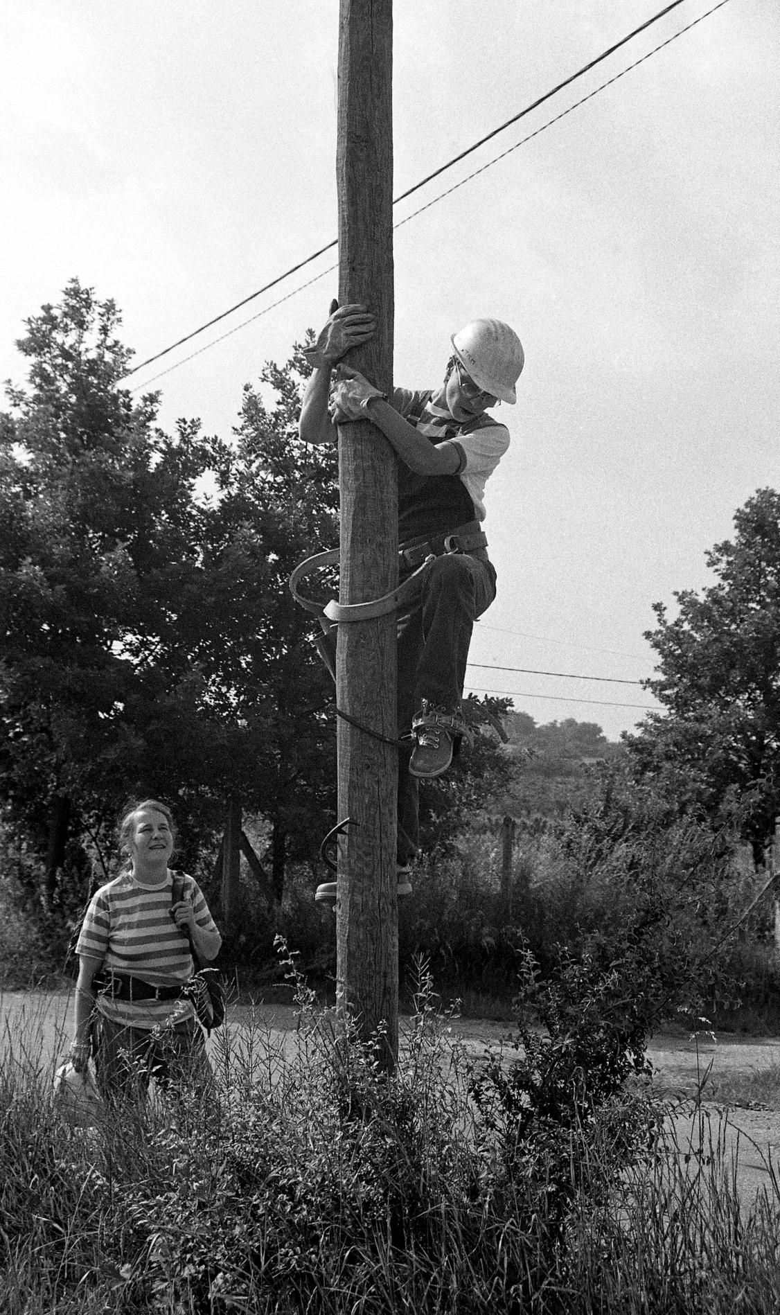 Ci-dessus : agent des lignes au sommet d'un poteau en bois, équipé de griffes d'acier et d'un harnais de cuir.
