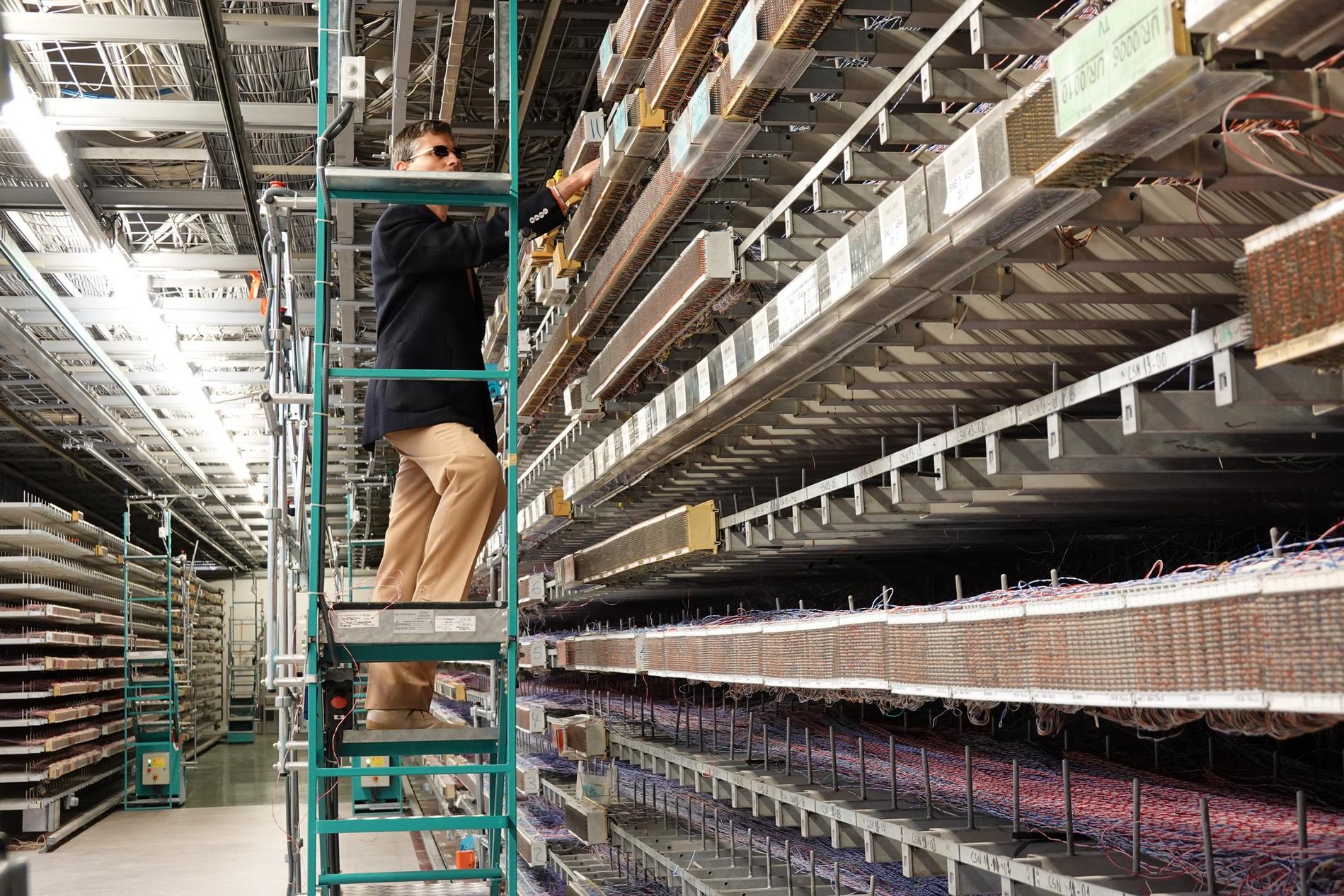 Ci-dessus : vue des Têtes Verticales du Répartiteur d'Orléans Grenier-à-Sel, où chaque abonné possède sa position d'arrivée (Transport) dans le Centre Téléphonique.