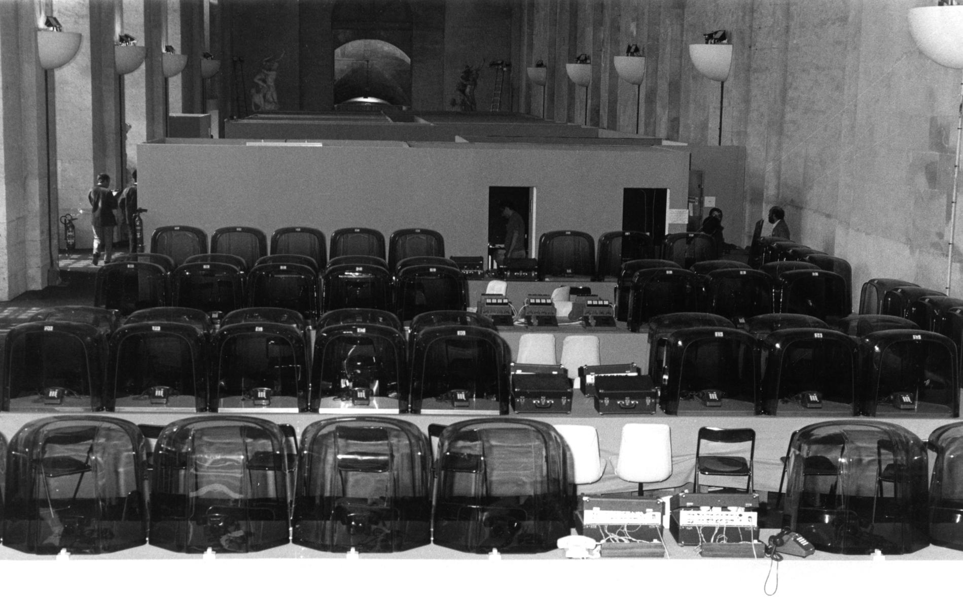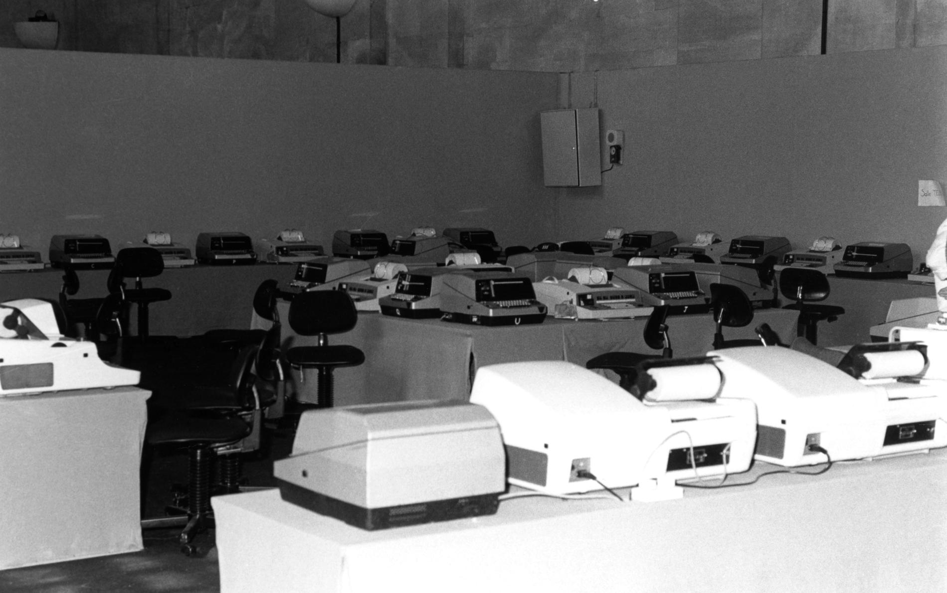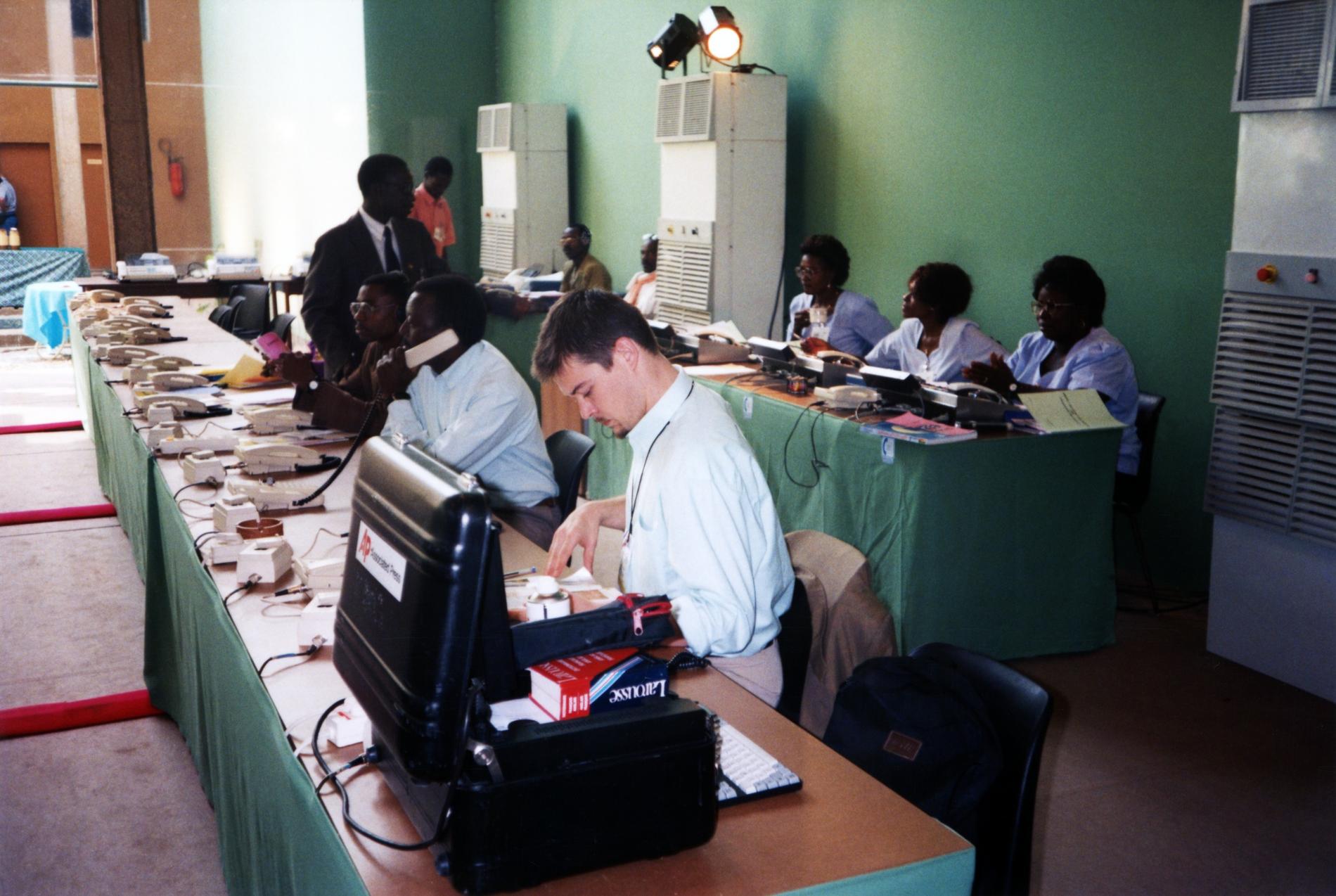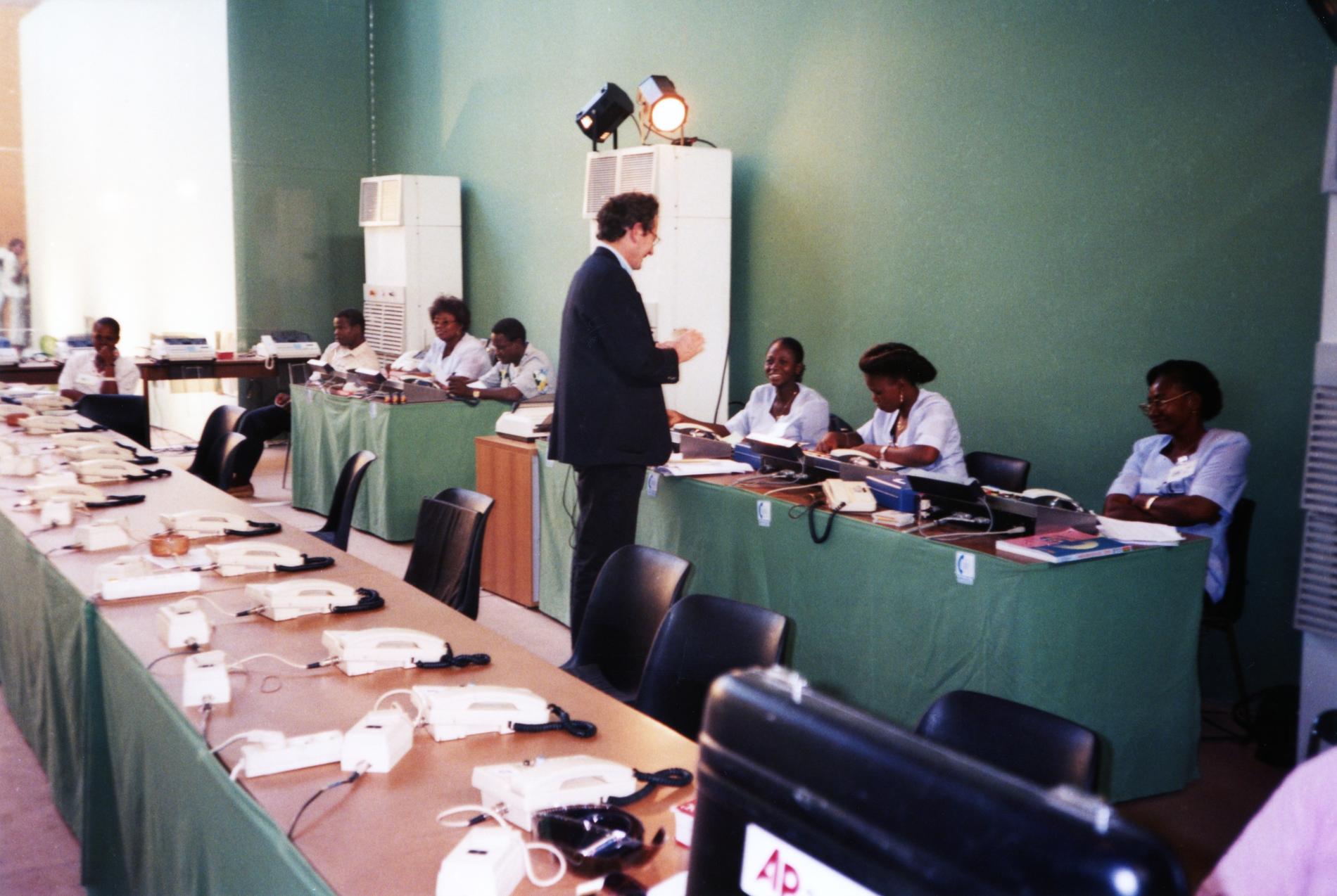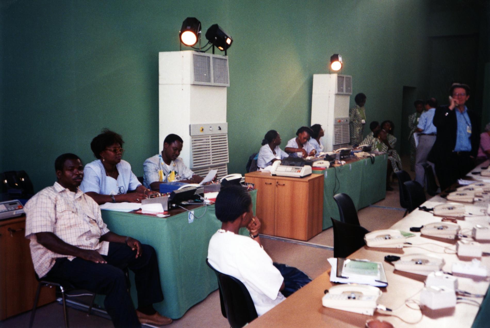Ci-dessus : la Salle de Presse montée en coopération entre l'ONATEL (Office National des Télécommunications du Burkina-Faso) et France-Télécom (service Bureau Temporaire) mettant à disposition des journalistes couvrant le Sommet France-Afrique les 5 et 6 décembre 1996 à Ouagadougou, les moyens de télécommunications nécessaires.