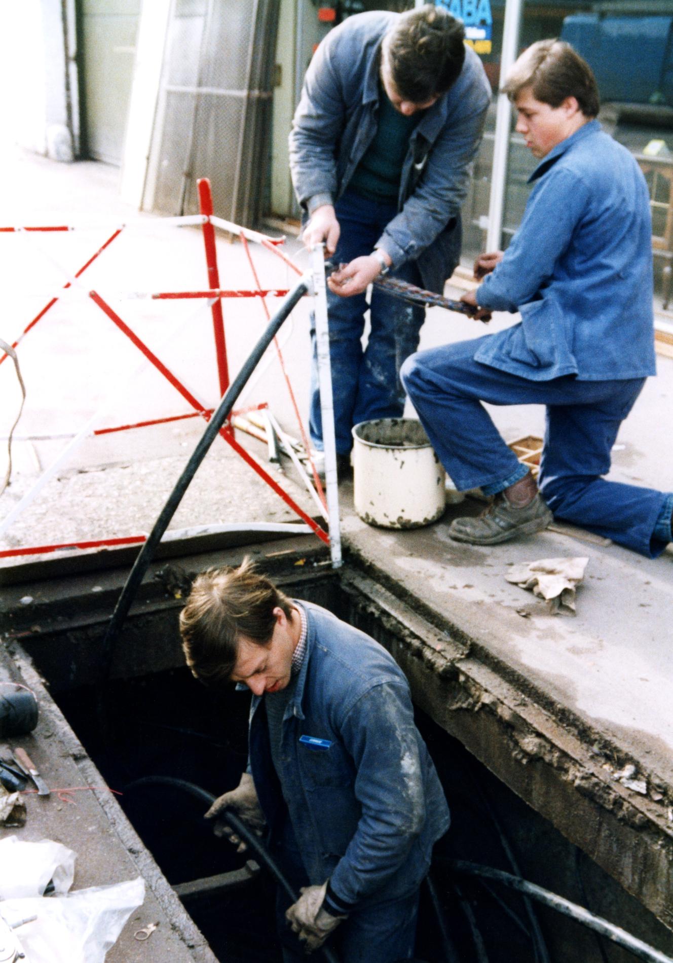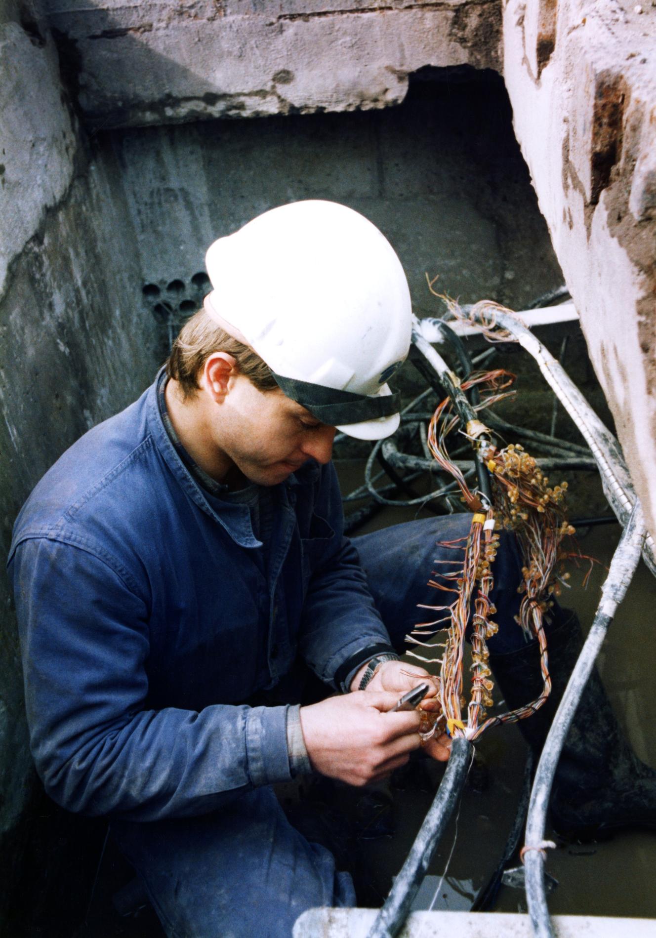 Ci-dessus : deux agents des lignes en train de procéder à l'épissure de deux extrémités de câbles urbains, logés dans ce que l'on nomme une chambre souterraine.