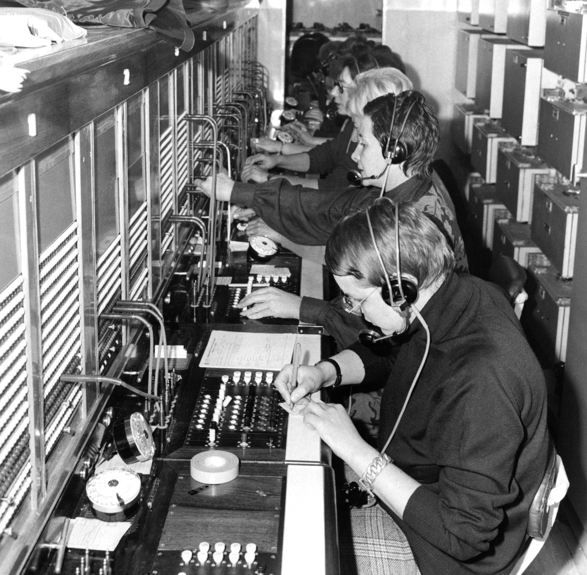 Ci-dessus : à droite : aménagement d'un multiple téléphonique (dans une pièce exiguë) avec opératrices PTT chargées de recevoir et d'établir les communications avec les zones manuelles ou semi-automatiques, notamment les communications internationales (encore largement manuelles en 1970).