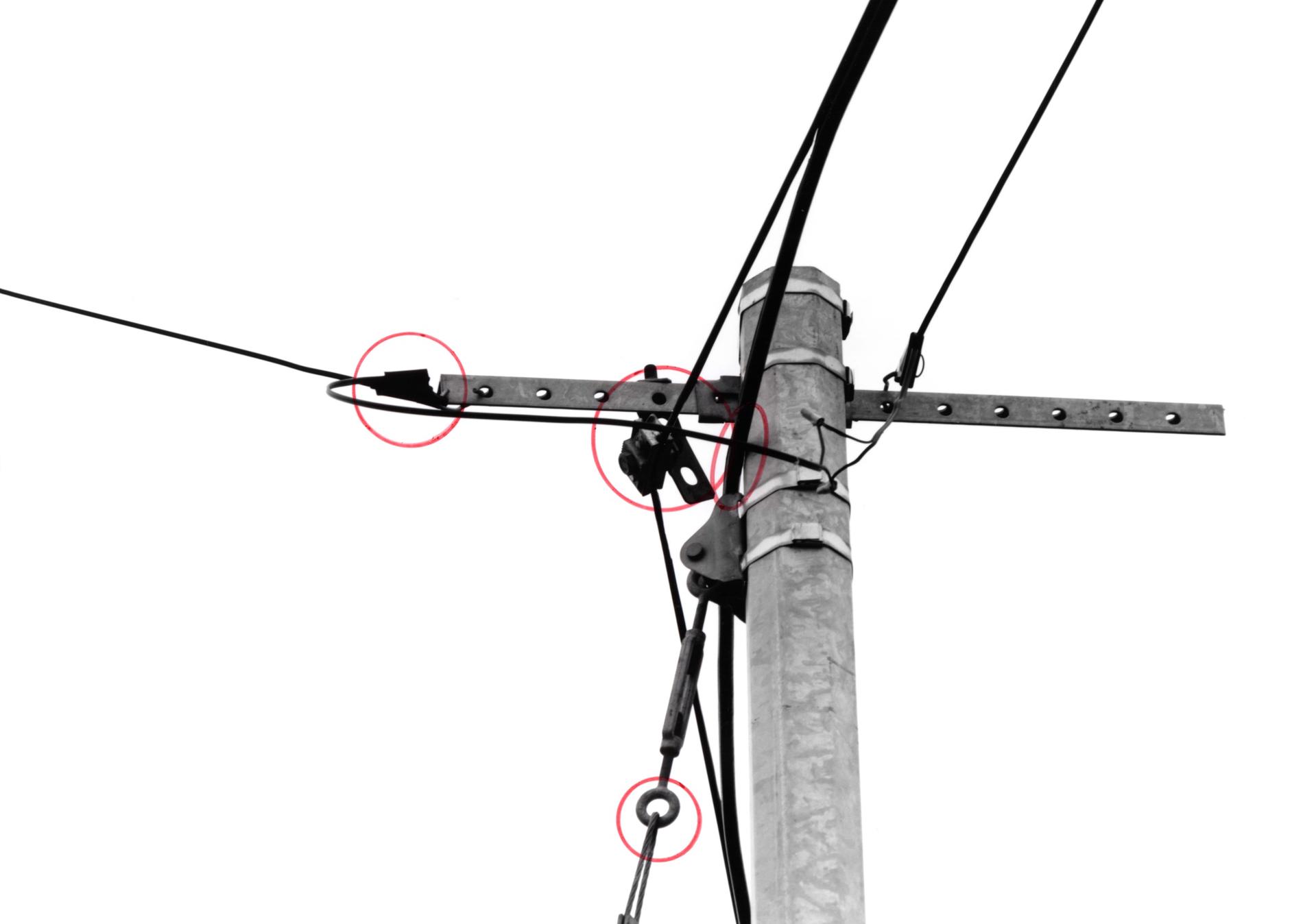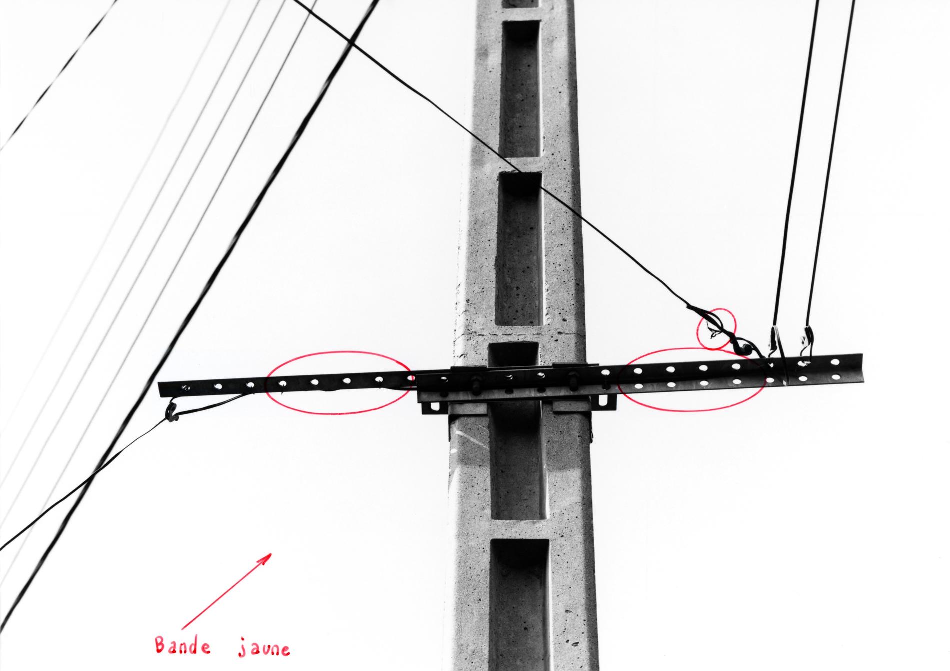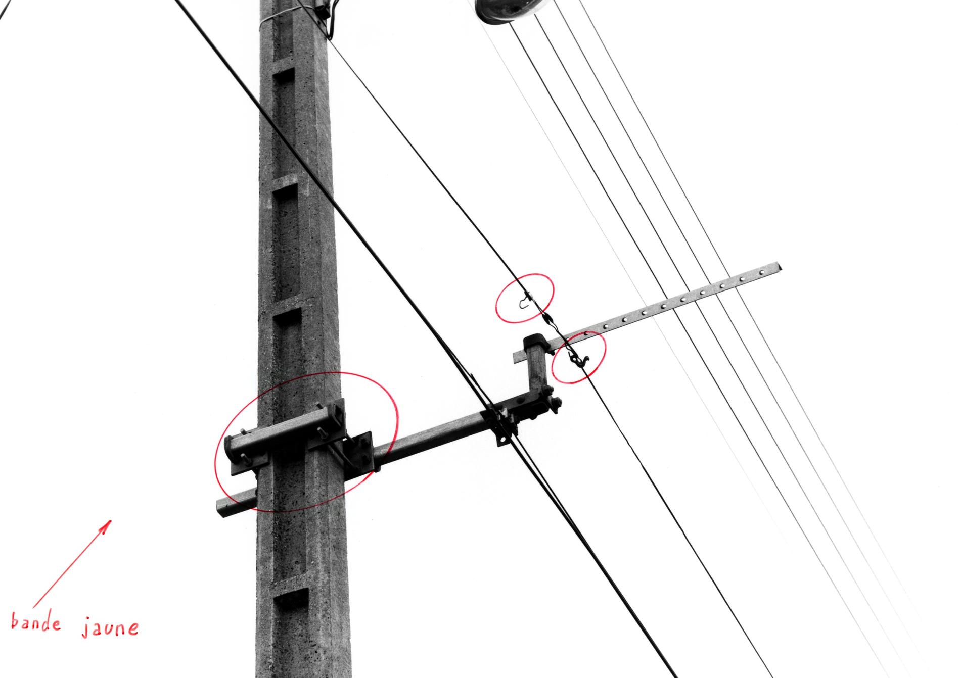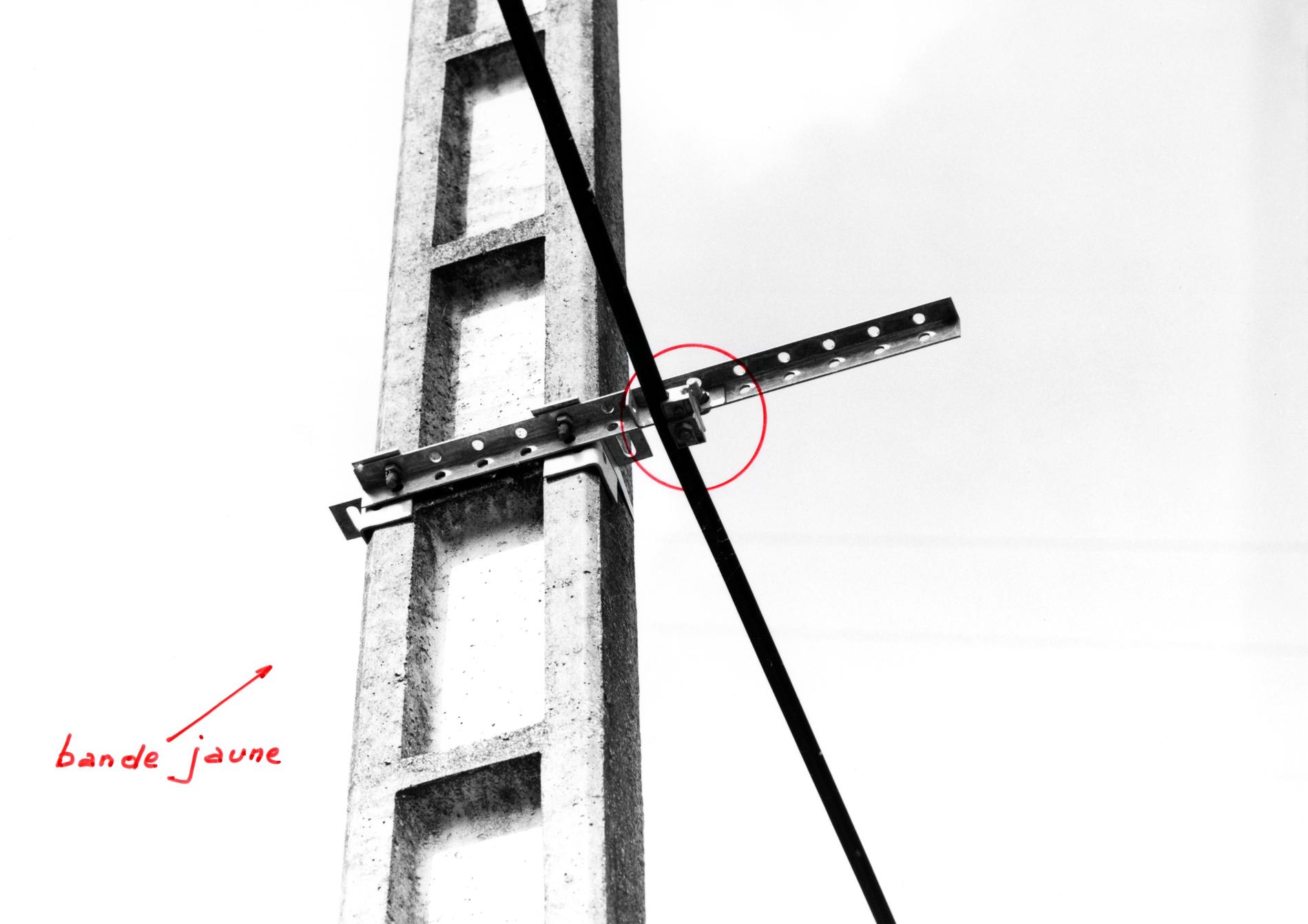 Ci-dessus : quelques exemples parmi une multitude de possibilités de fixation, étaiement, haubanage en partage sur les poteaux EDF en béton.