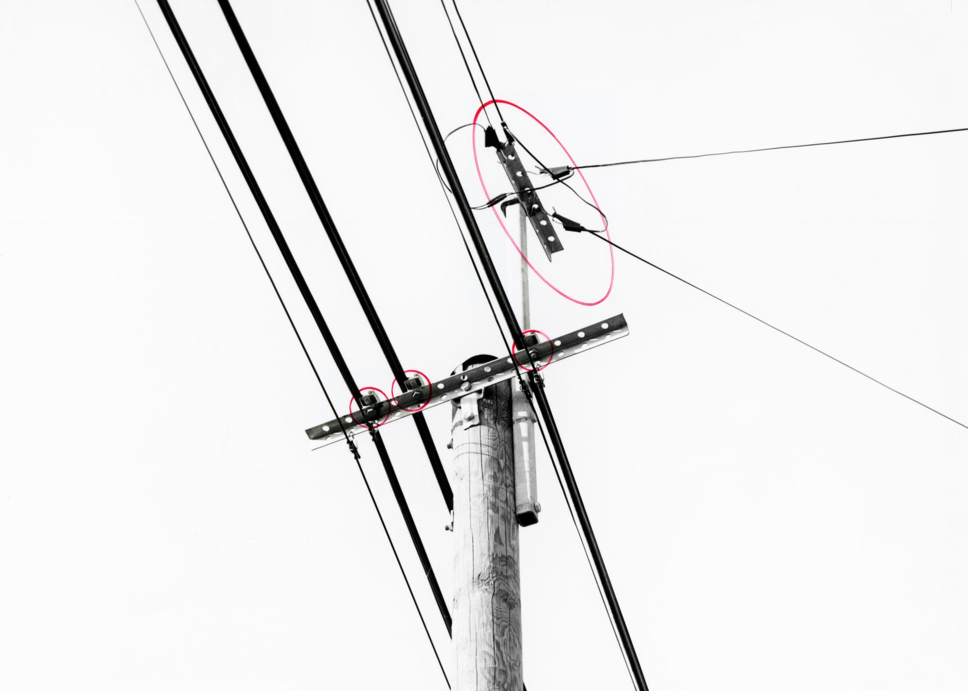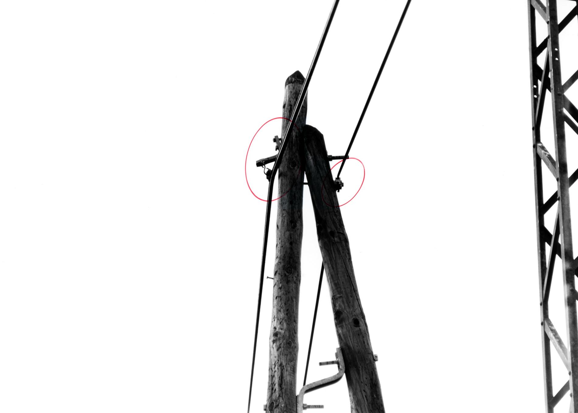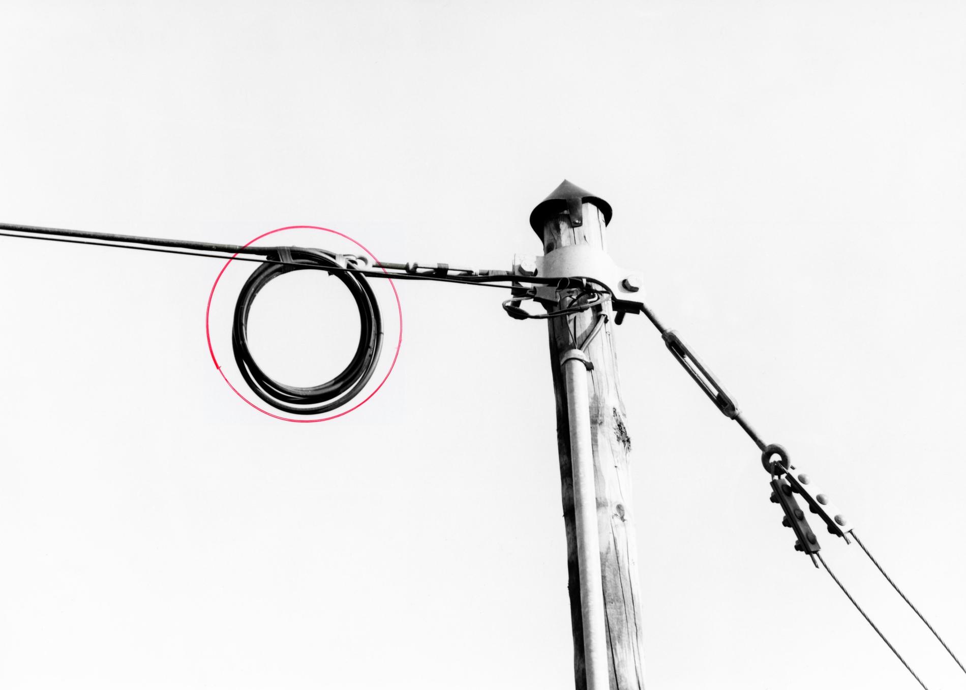Ci-dessus : agent des lignes du CCL de Mâcon, équipé d'un camion-nacelle en intervention sur un poteau téléphonique en bois haubané, au niveau d'un Point de Concentration (PC).
