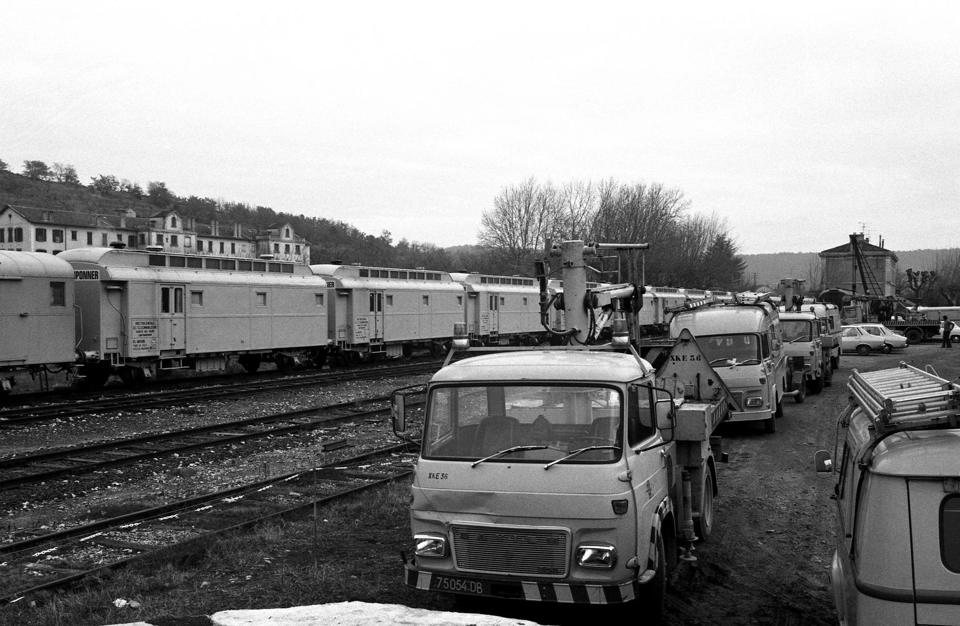 Ci-dessus : le Train-Parc de seconde génération (ex train-postal) et son équipe d'Agents des Lignes, en cours d'intervention à Valence (26), pour reposer des poteaux et des lignes téléphoniques suite à une probable tempête.