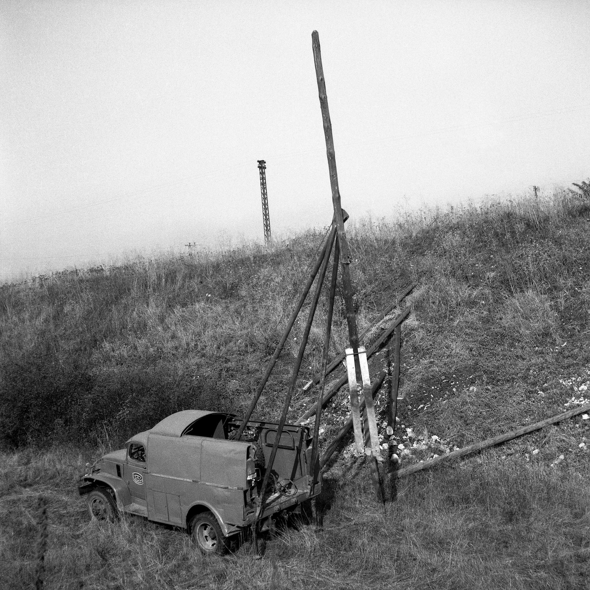 Ci-dessus : camion-treuil des PTT, équipé d'une chèvre articulée, utilisé pour poser un nouveau poteau ou pour en changer un autre.