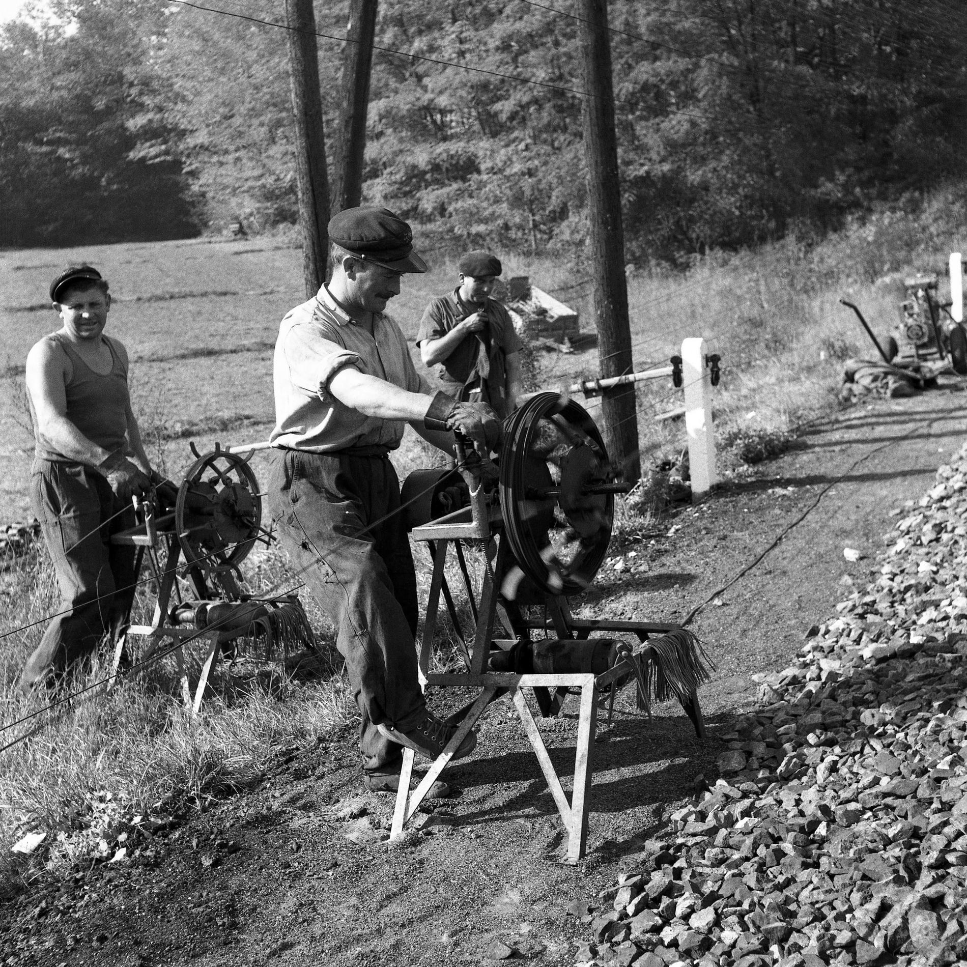 Ci-dessus : pose en 1949, dans les environs de Grenoble, du câble coaxial téléphonique interurbain entre Grenoble et Lyon.