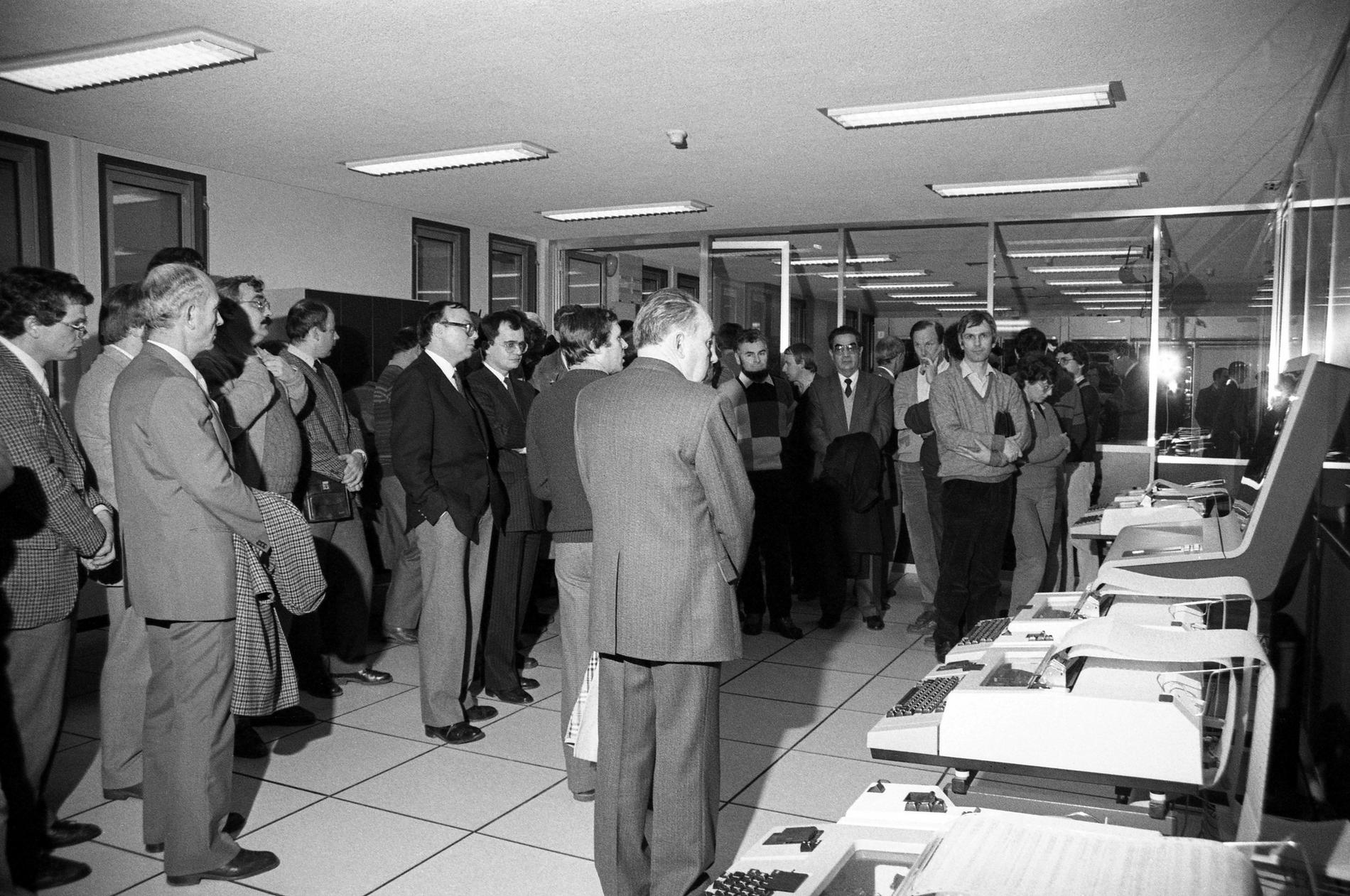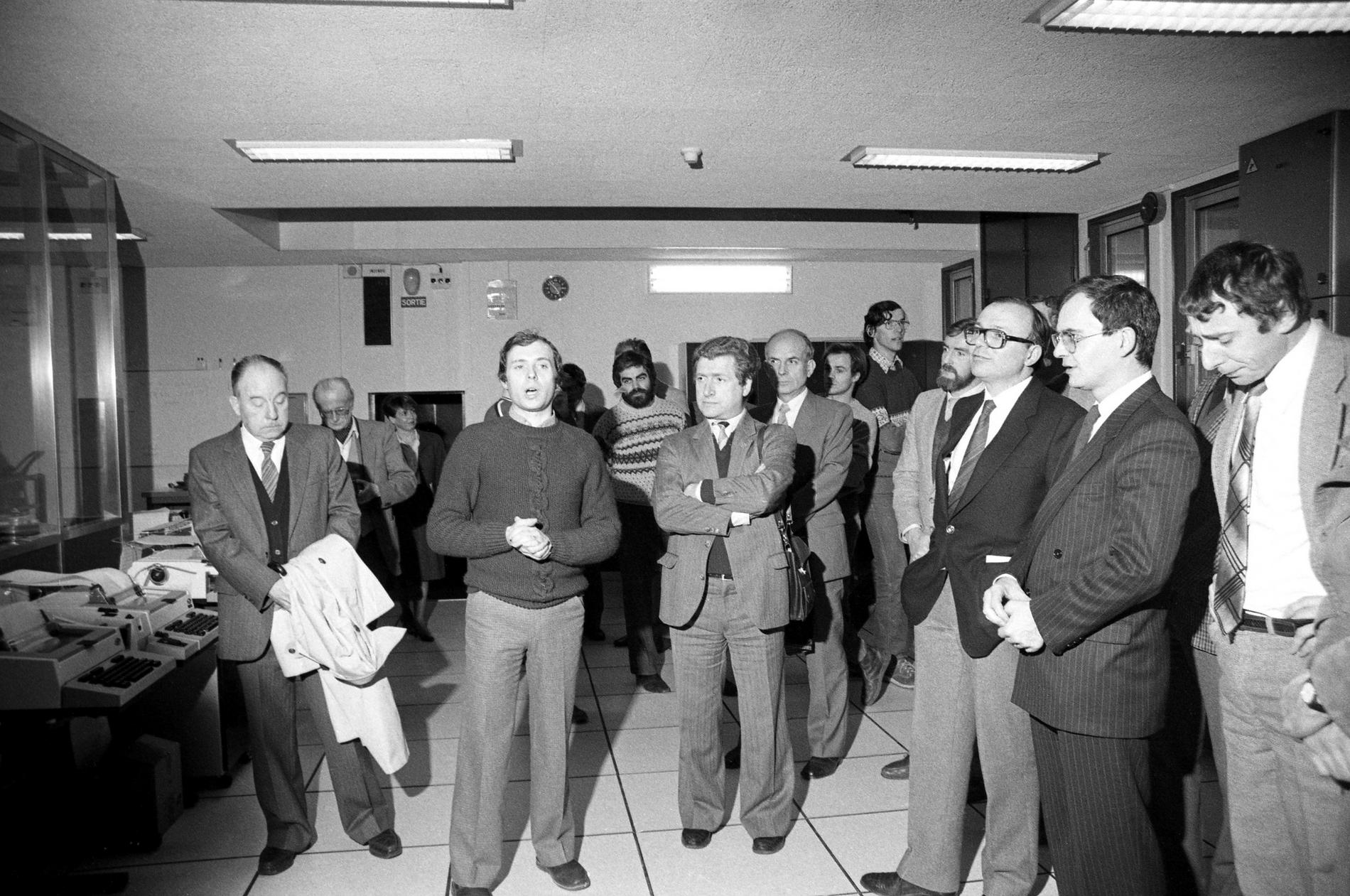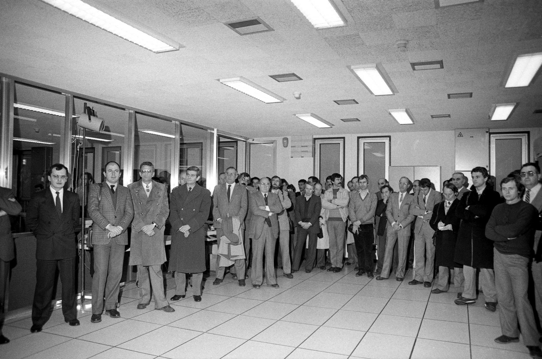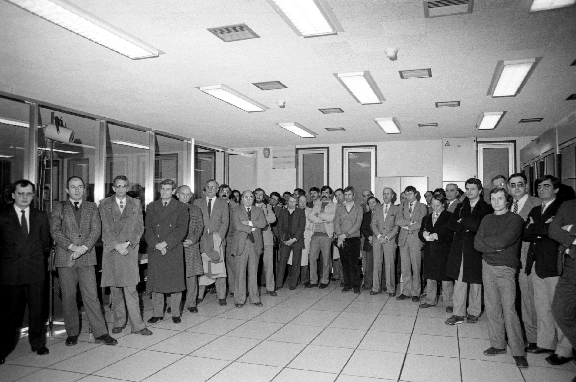 Ci-dessus : équipe présente sur le Centre Téléphonique d'Aulnay-sous-Bois, ayant assuré la mise hors service du dernier MT25 de France - AULNAY A3 (BB03), devant les Calculateurs.