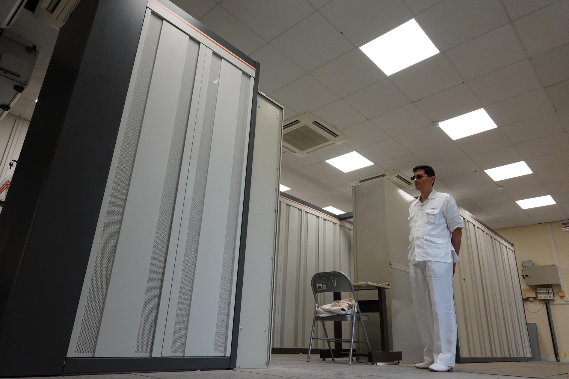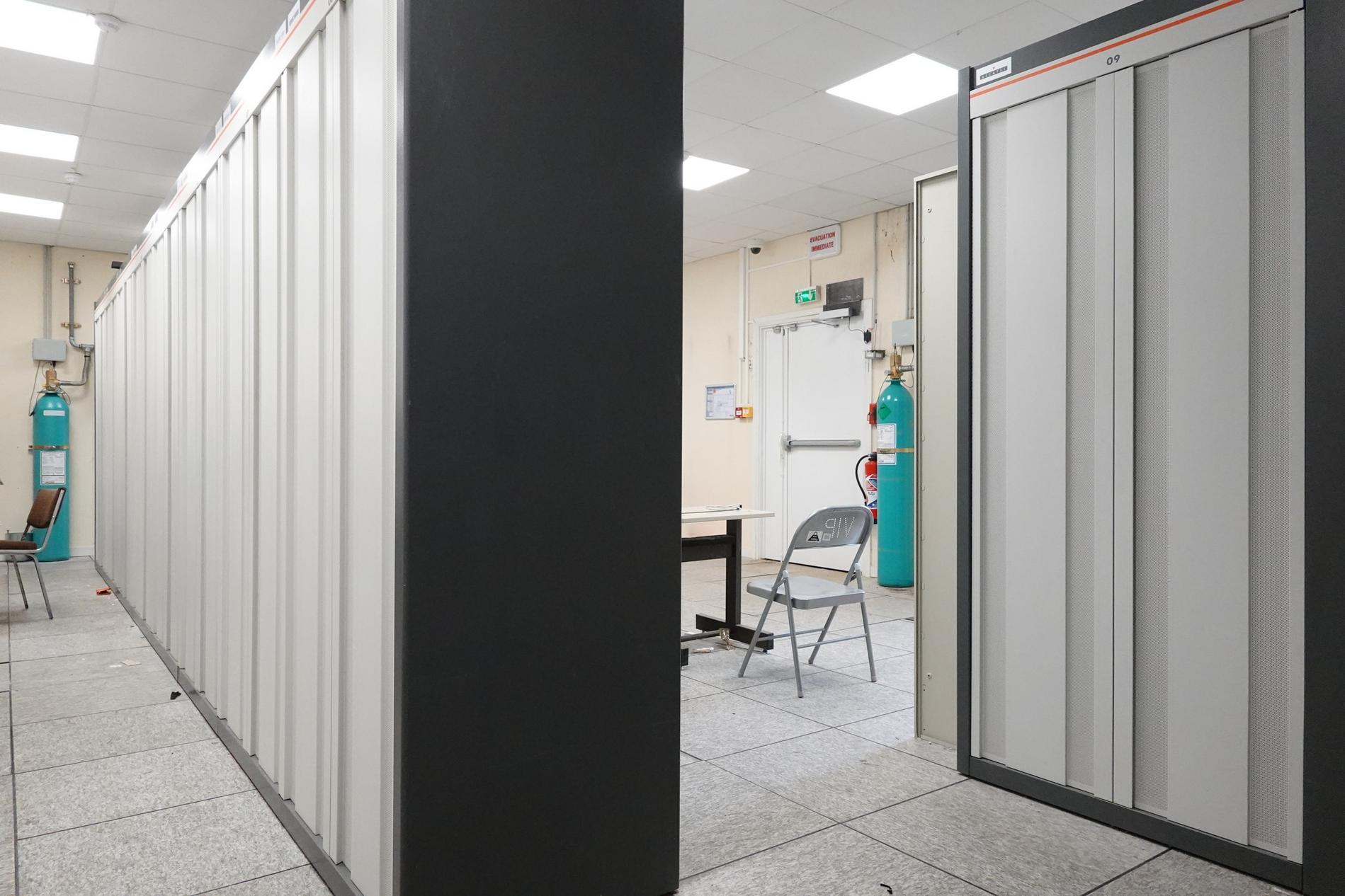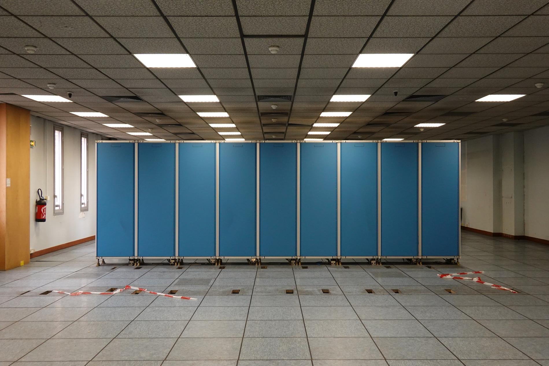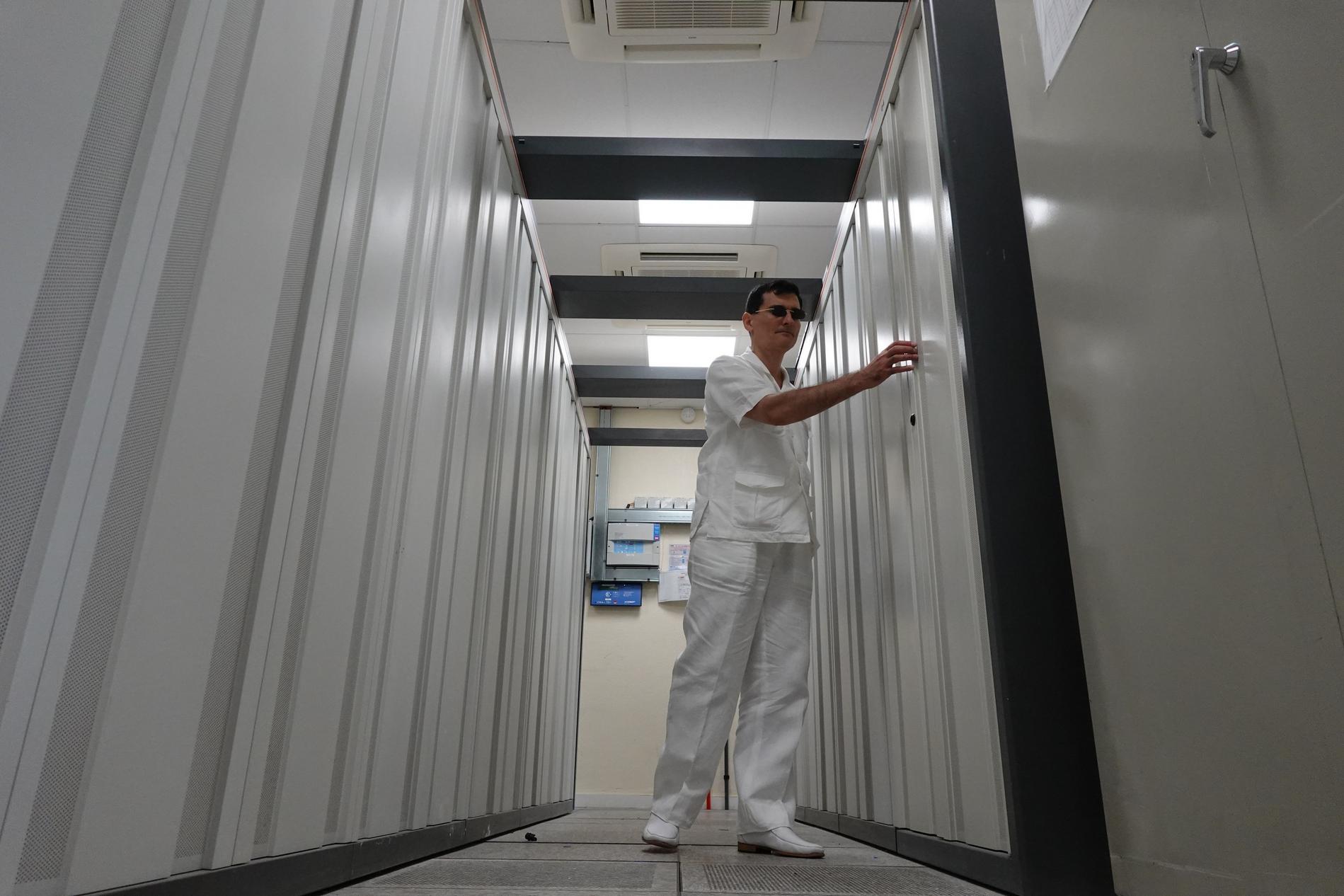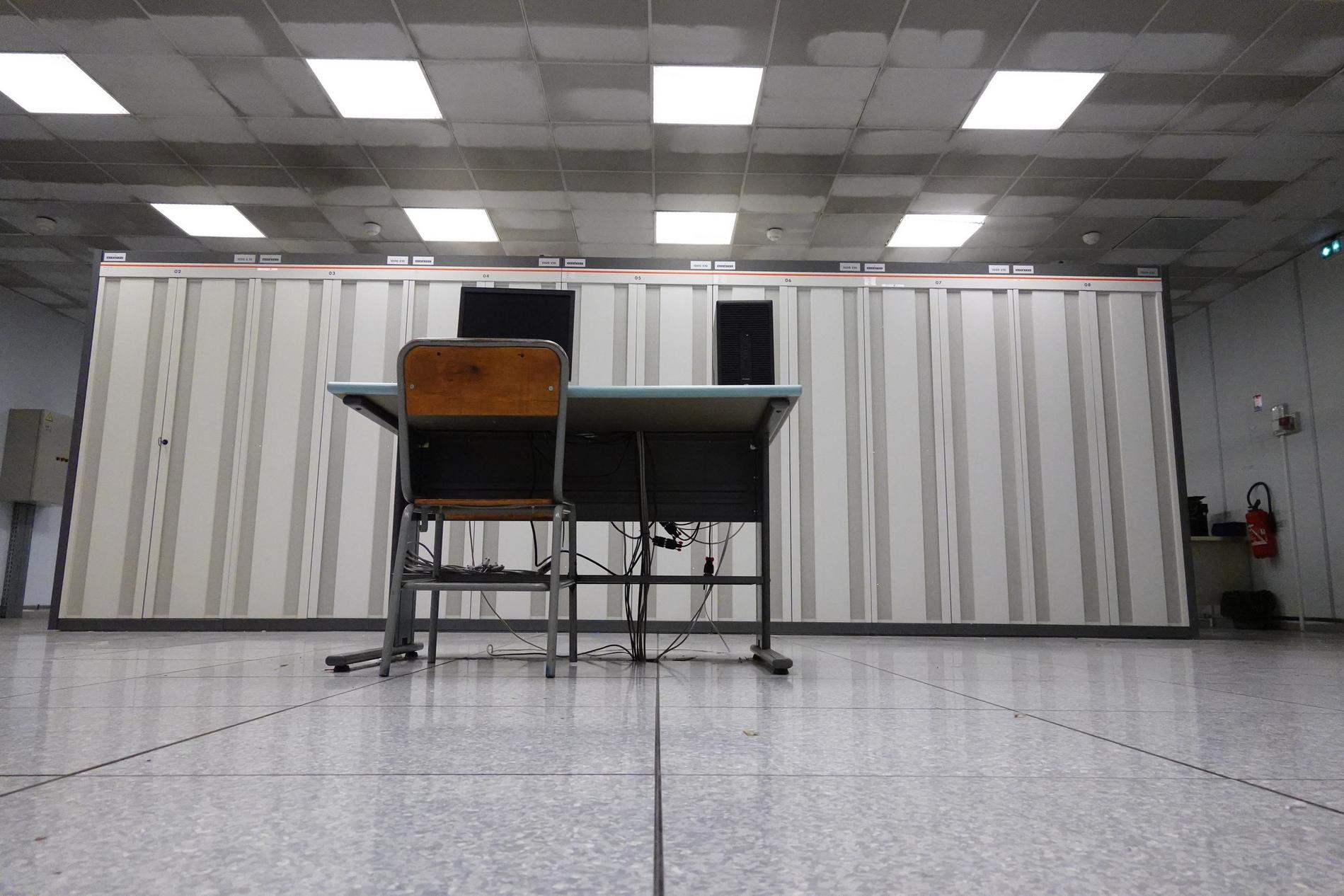 Ci-dessus : vue comparative AXE10 - nouveau mobilier blanc BYB501 / ancien mobilier bleu BYB202 / humain de taille moyenne.