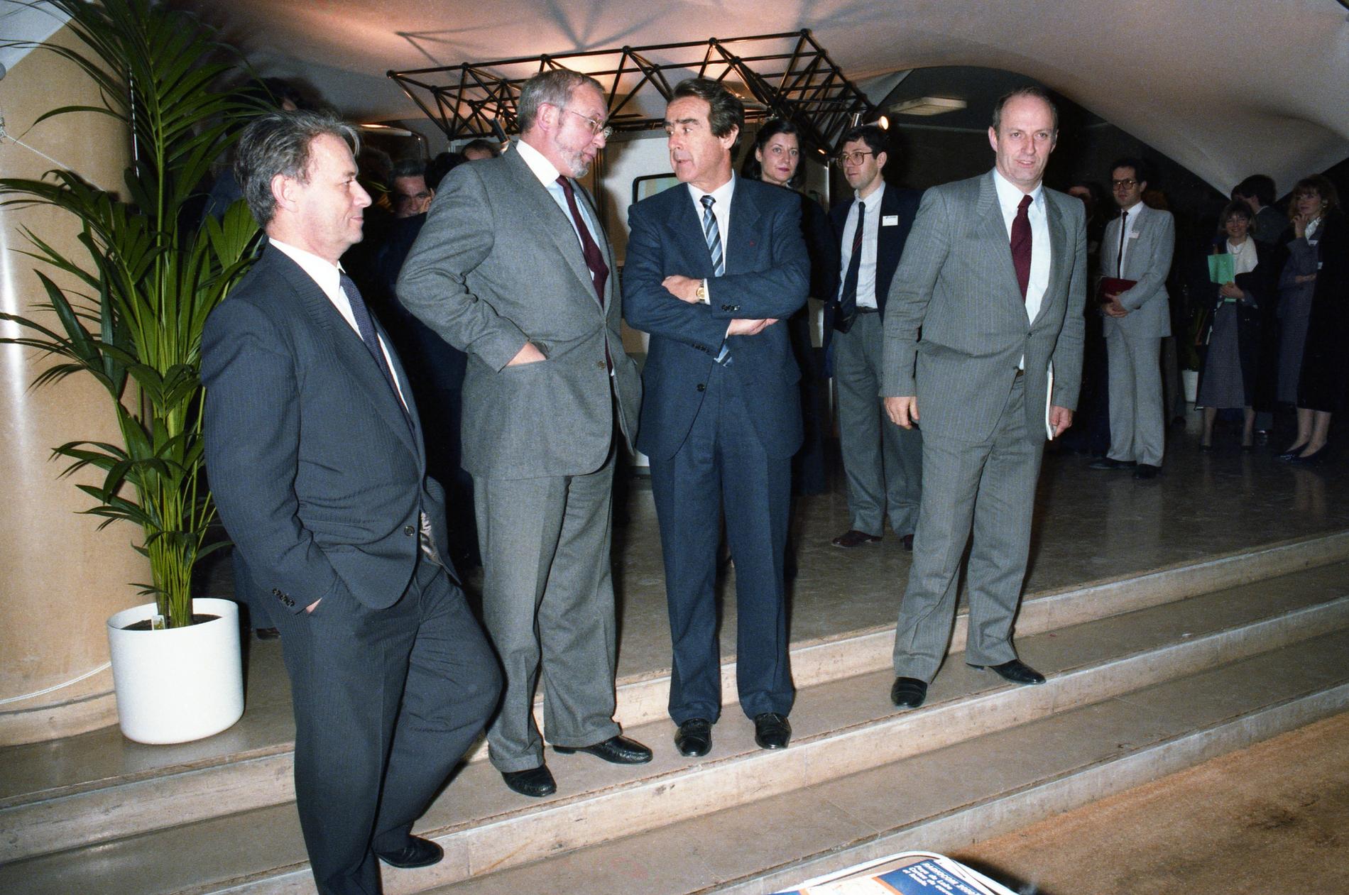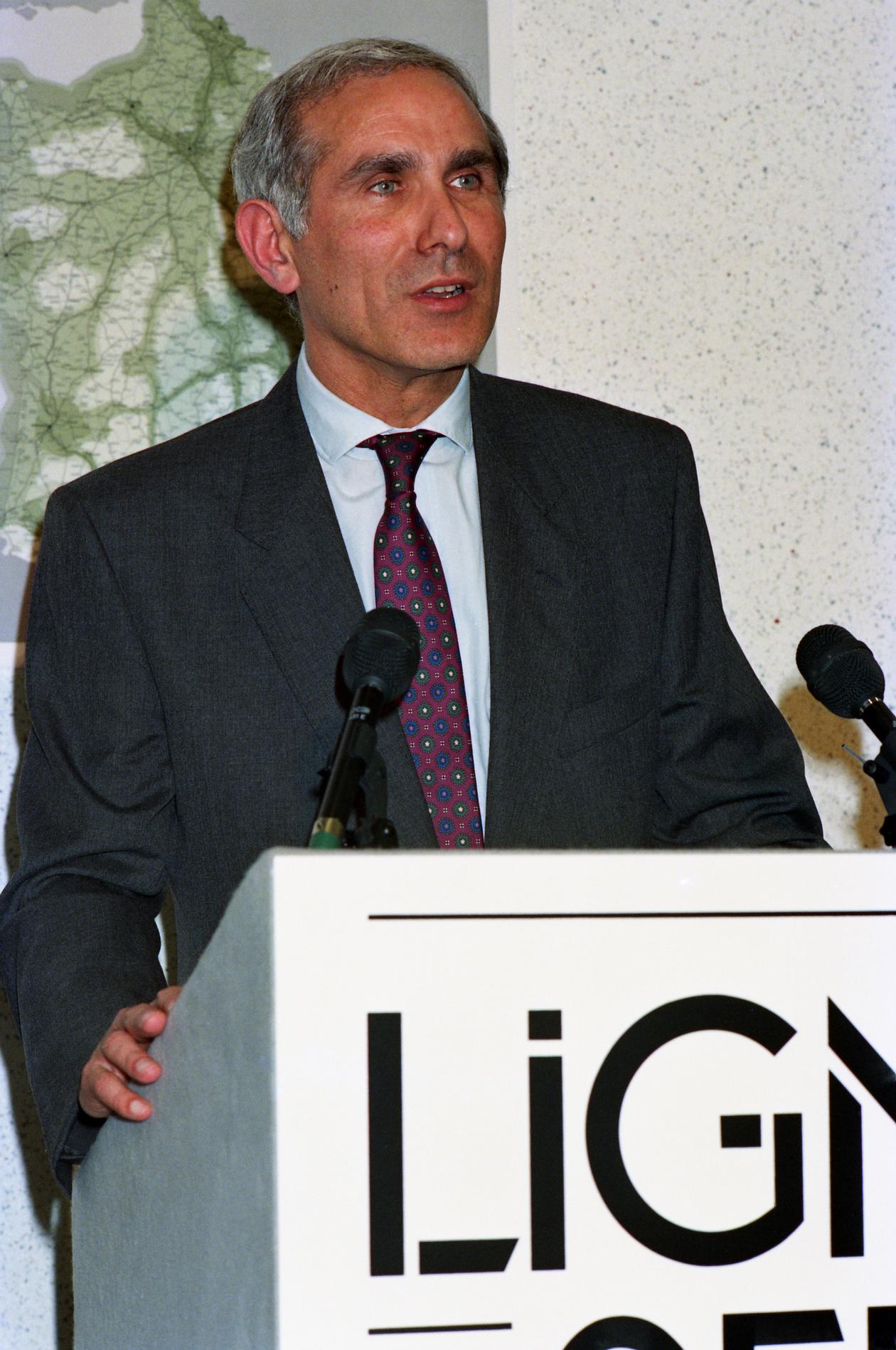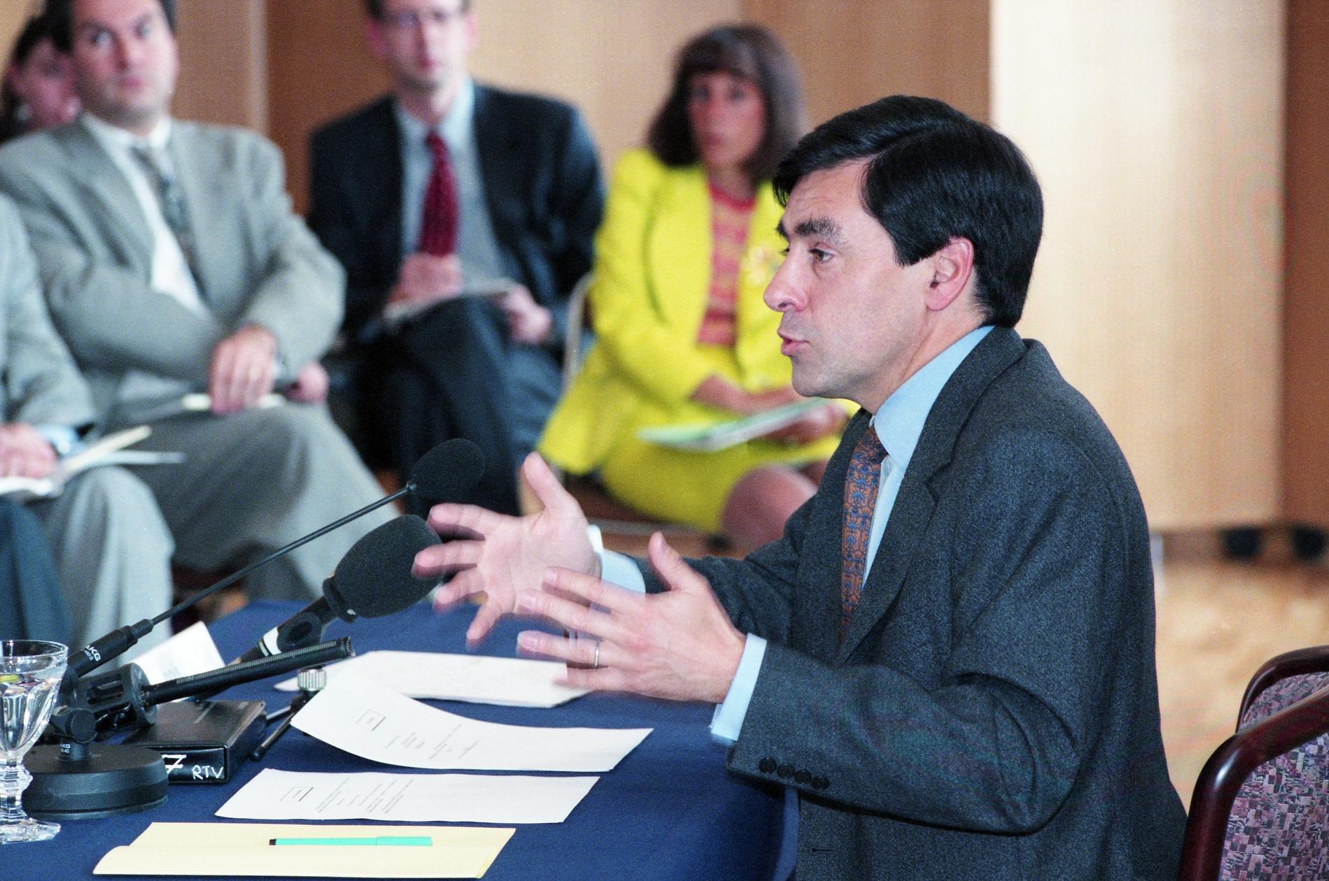 Ci-dessus : M. le Ministre délégué à la Poste, aux Télécommunications et à l'Espace - François Fillon, inaugure l'ouverture commerciale du réseau GSM/DCS F3 de Bouygues Télécom, lors d'une conférence de presse qui se tient au Ministère des PTE.