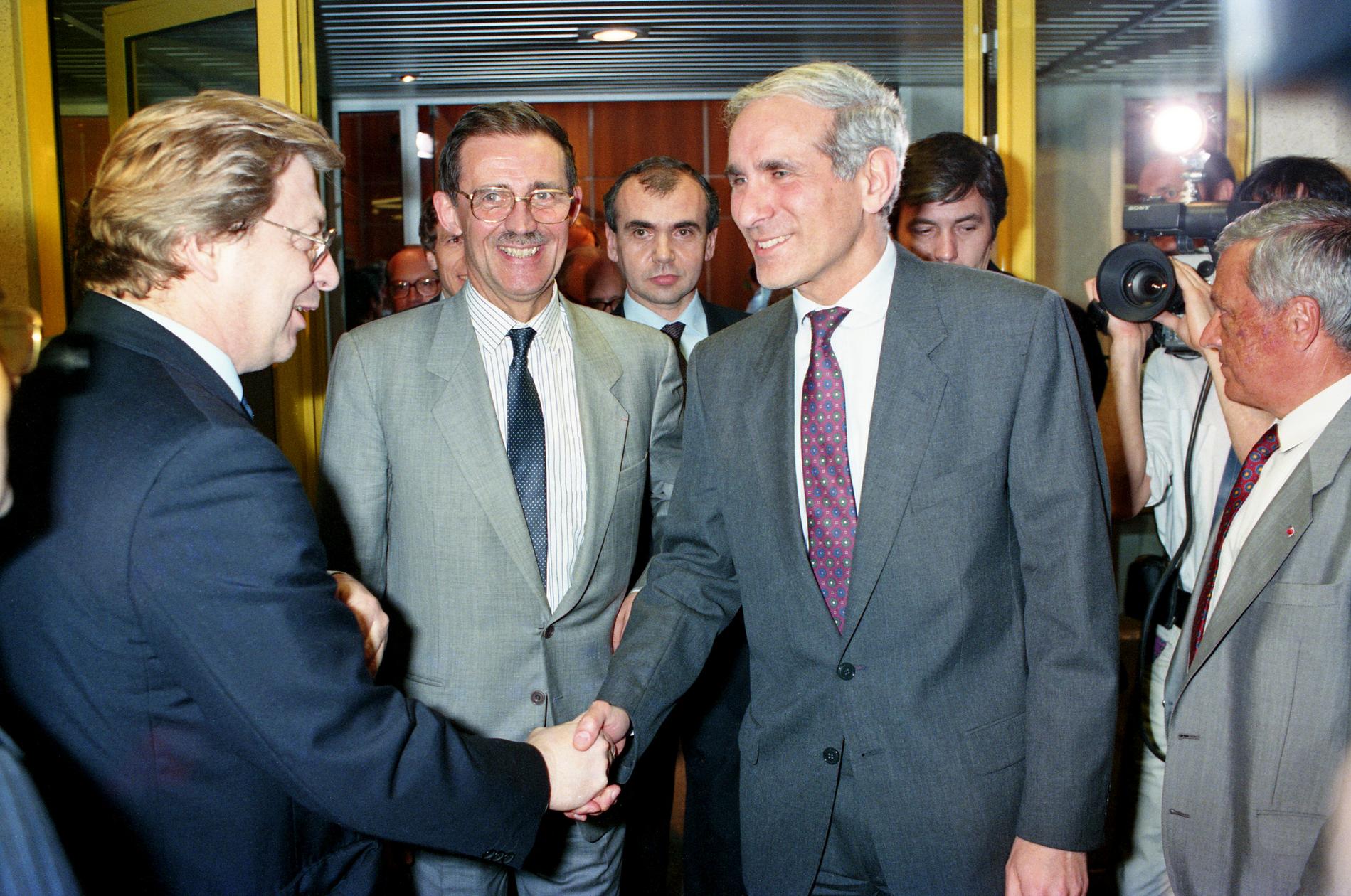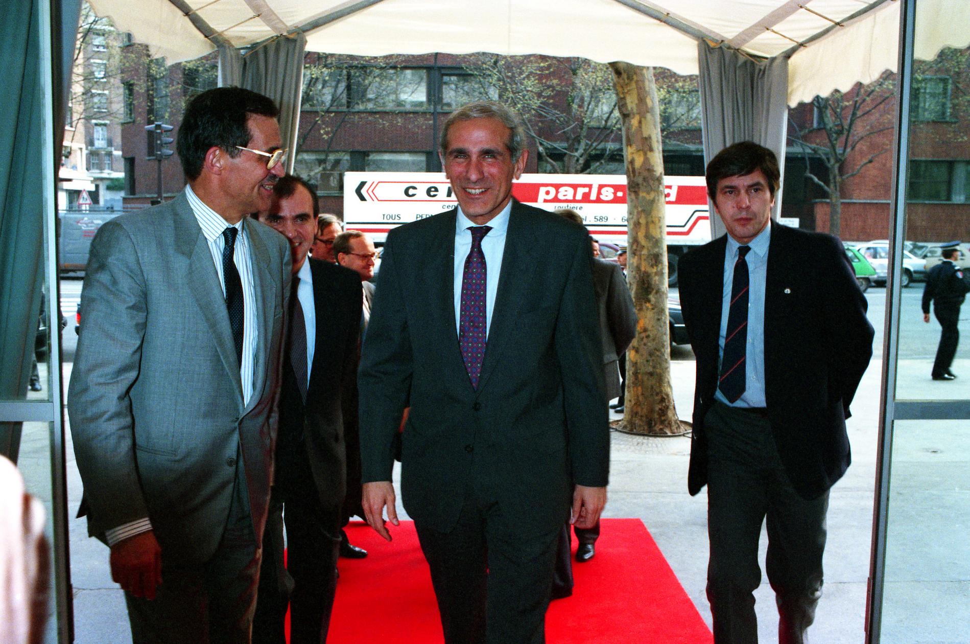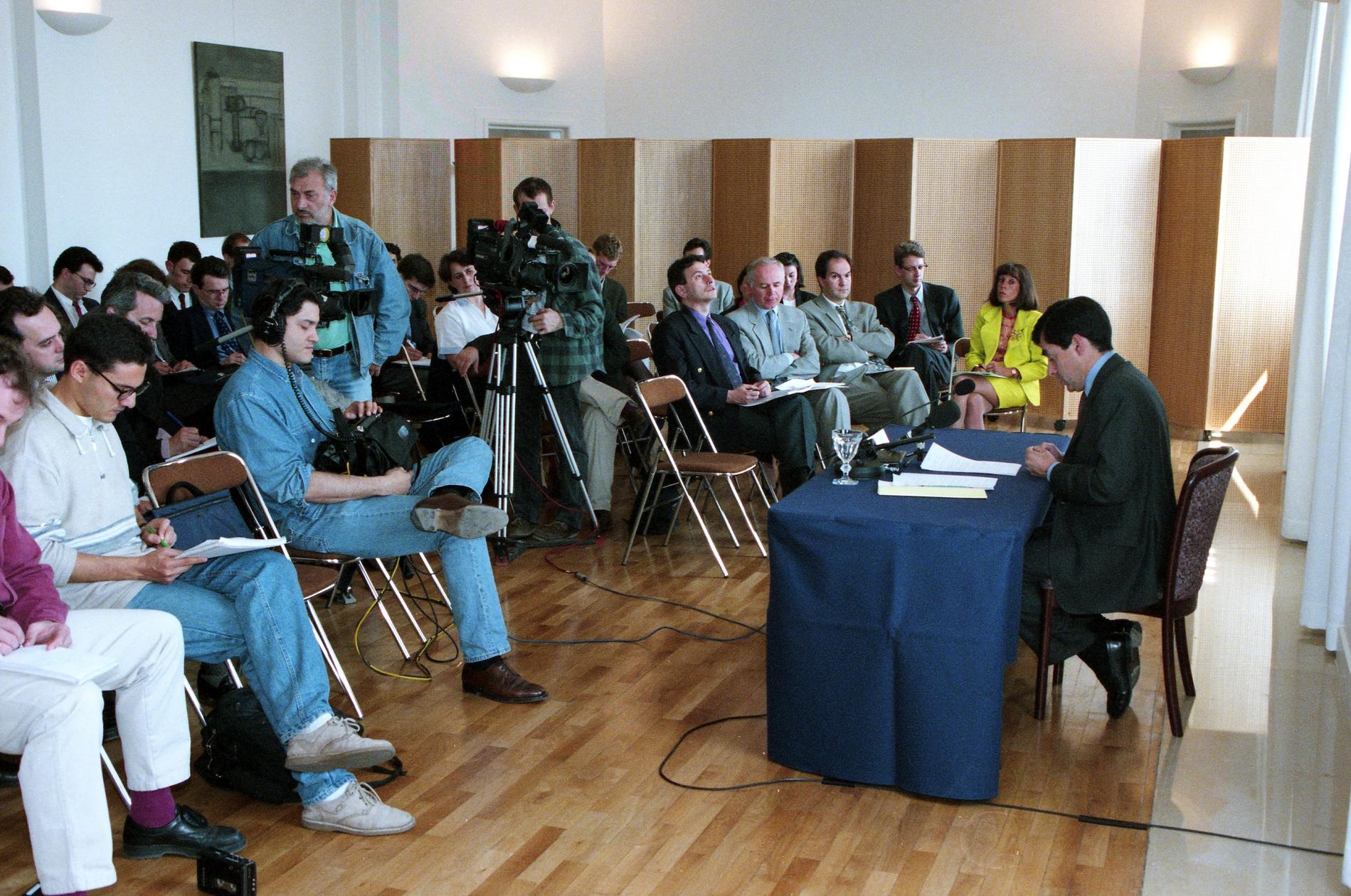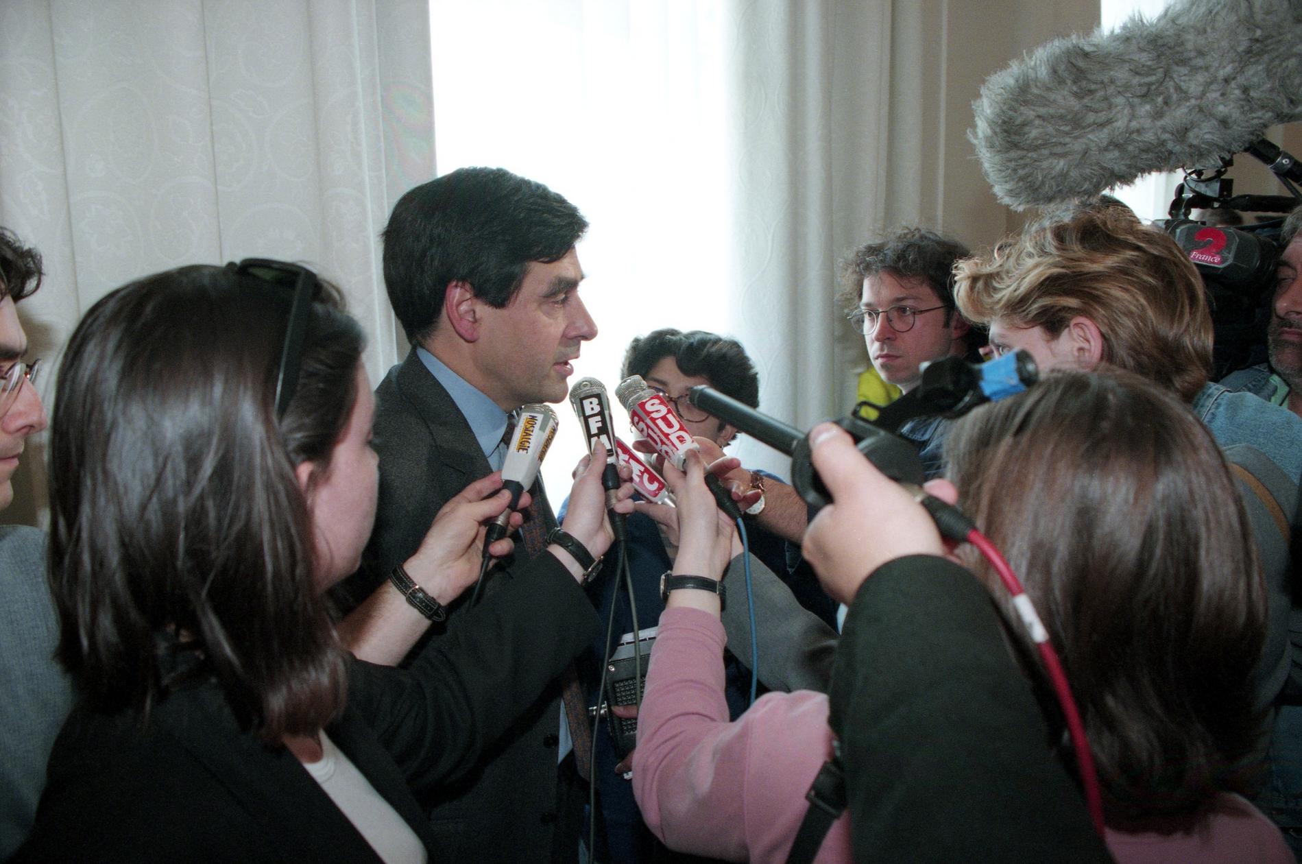 Ci-dessus : M. le Ministre délégué à la Poste, aux Télécommunications et à l'Espace - François Fillon, inaugure l'ouverture commerciale du réseau GSM/DCS F3 de Bouygues Télécom, lors d'une conférence de presse qui se tient au Ministère des PTE.
