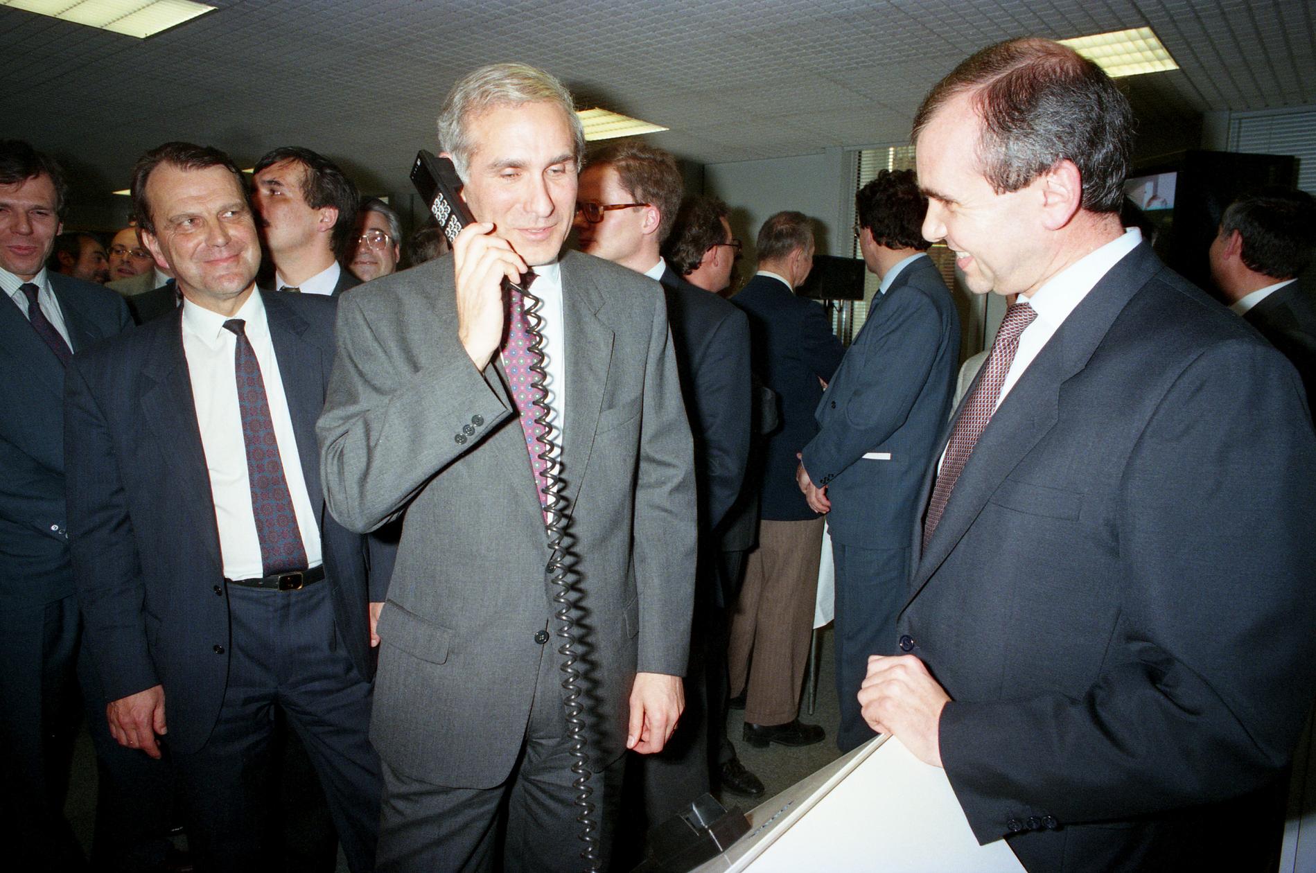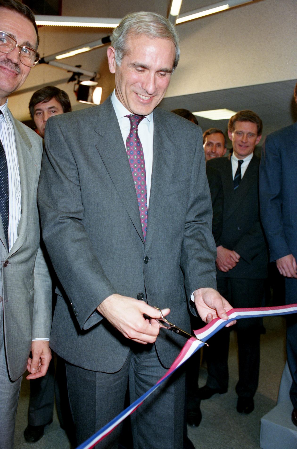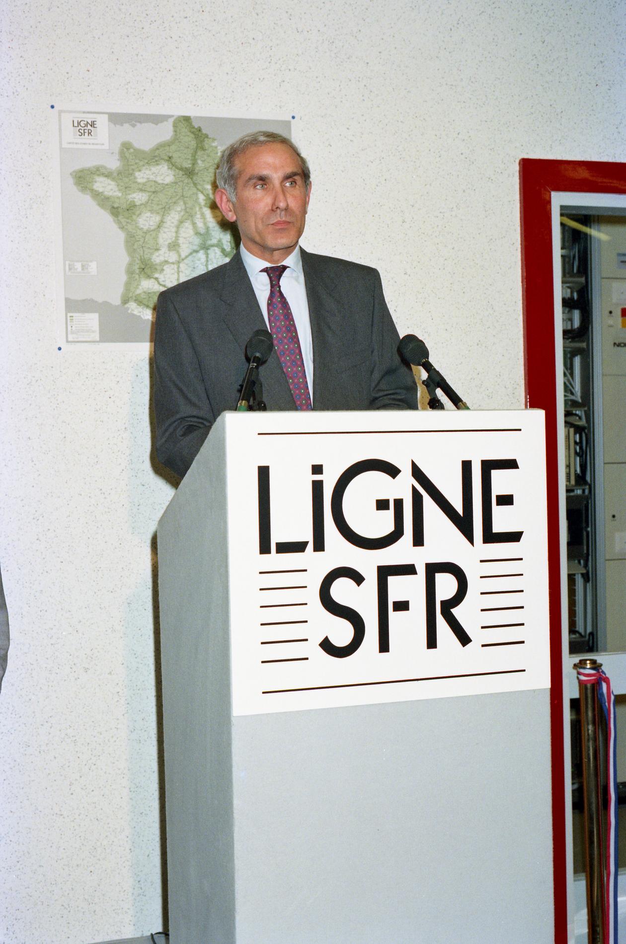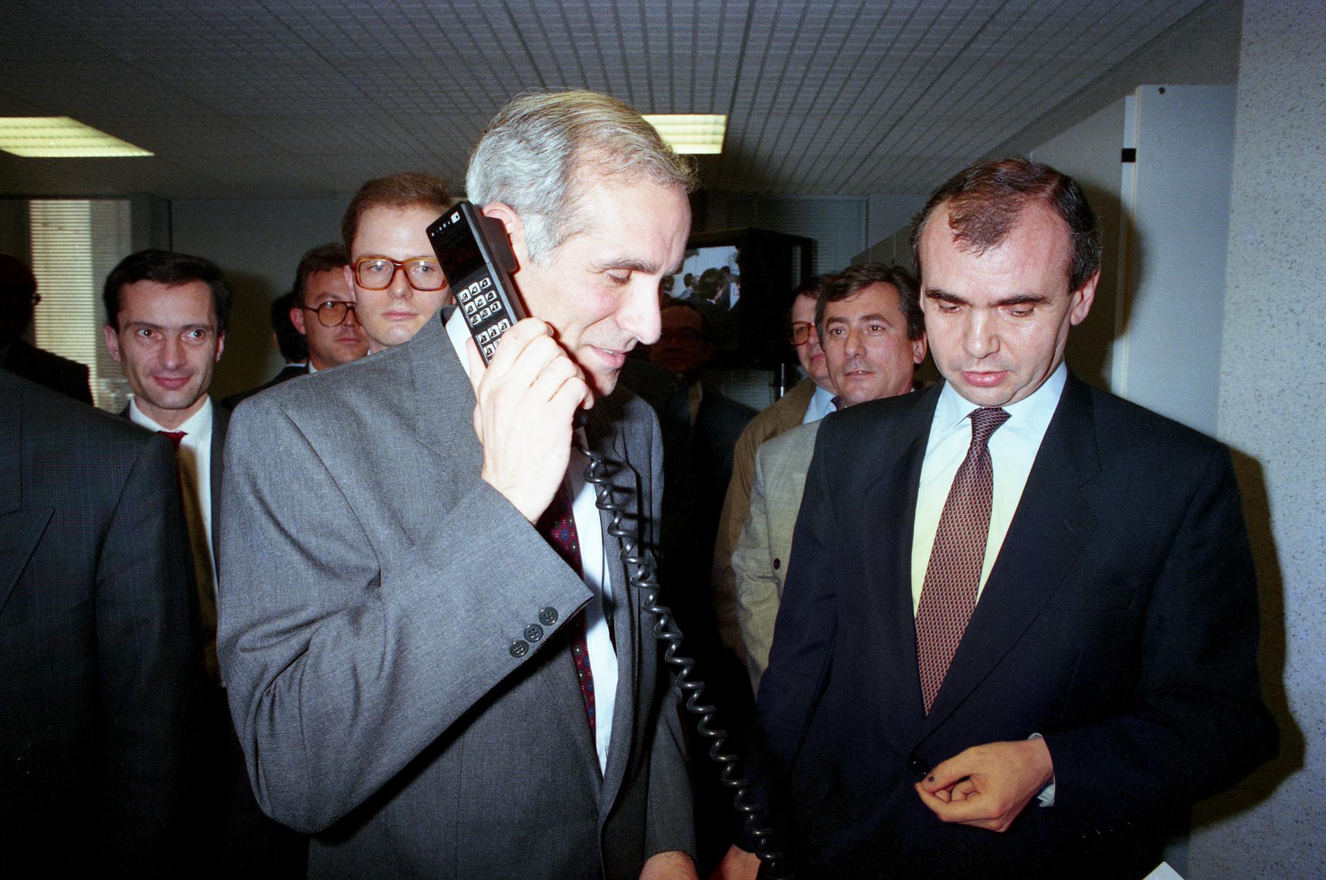 Ci-dessus : M. le Ministre des Postes, Télécommunications et Espace - Paul Quilès inaugure La Ligne SFR, radiotéléphone qui vient concurrencer France-Télécom.