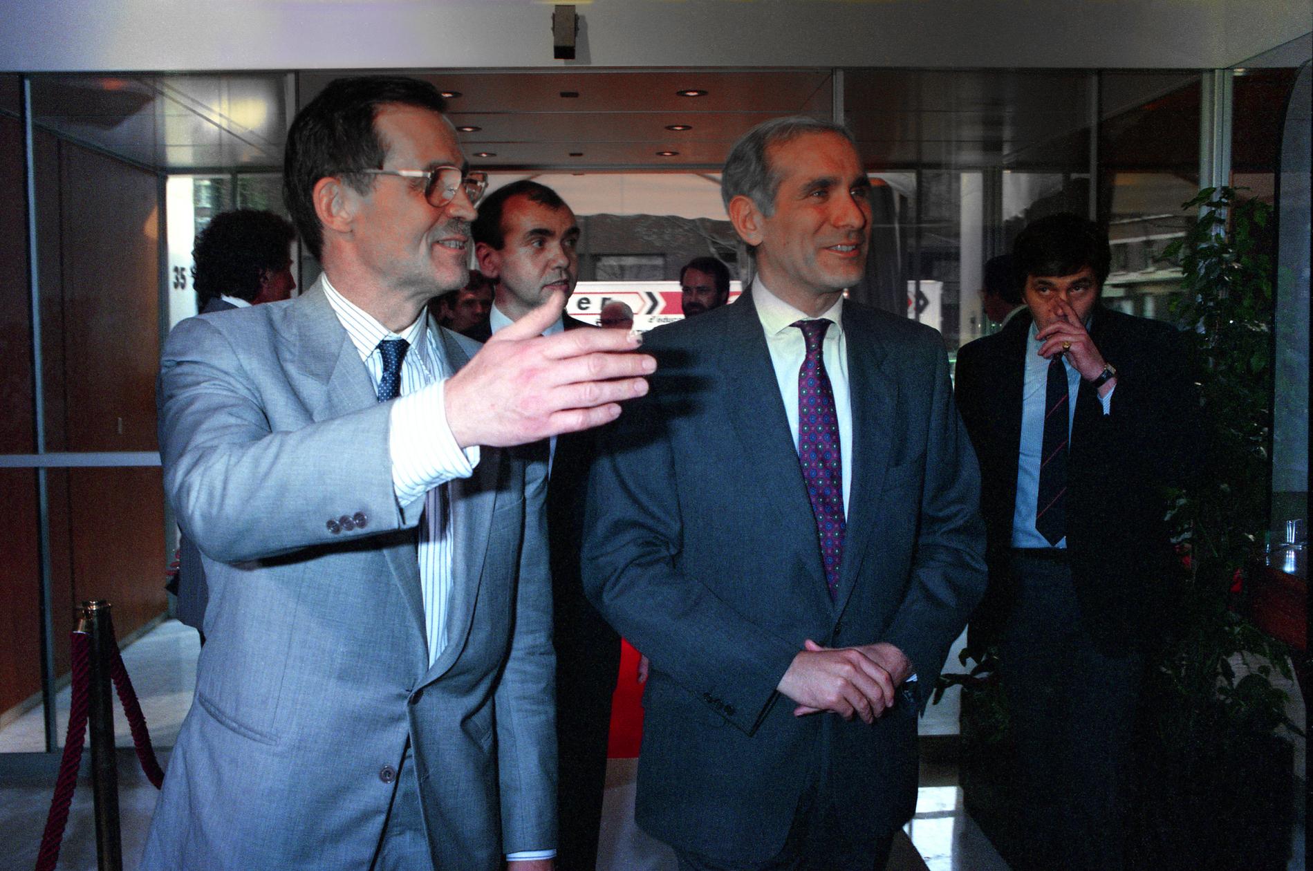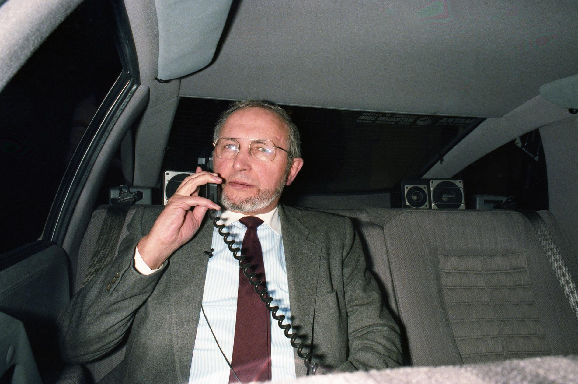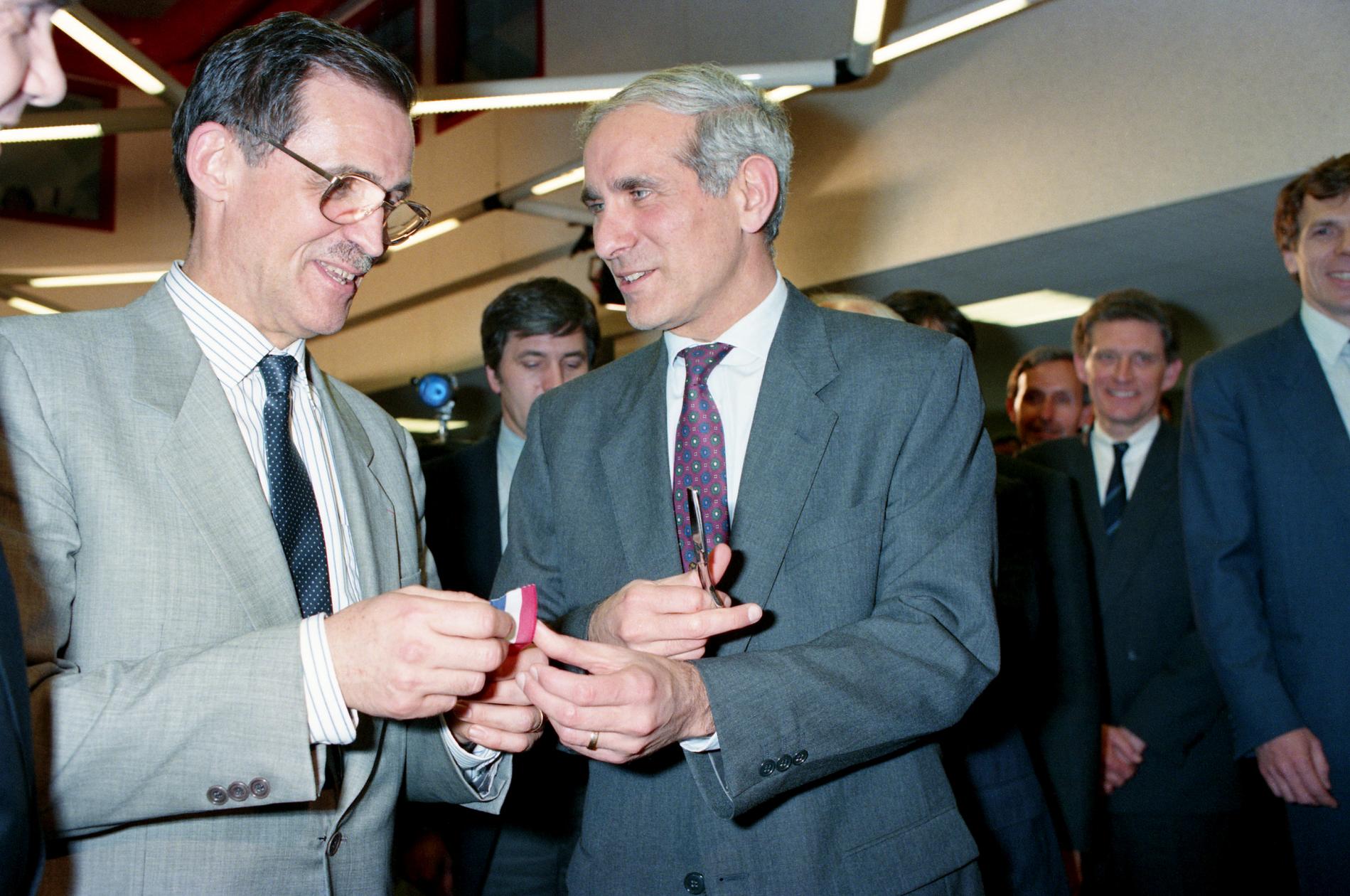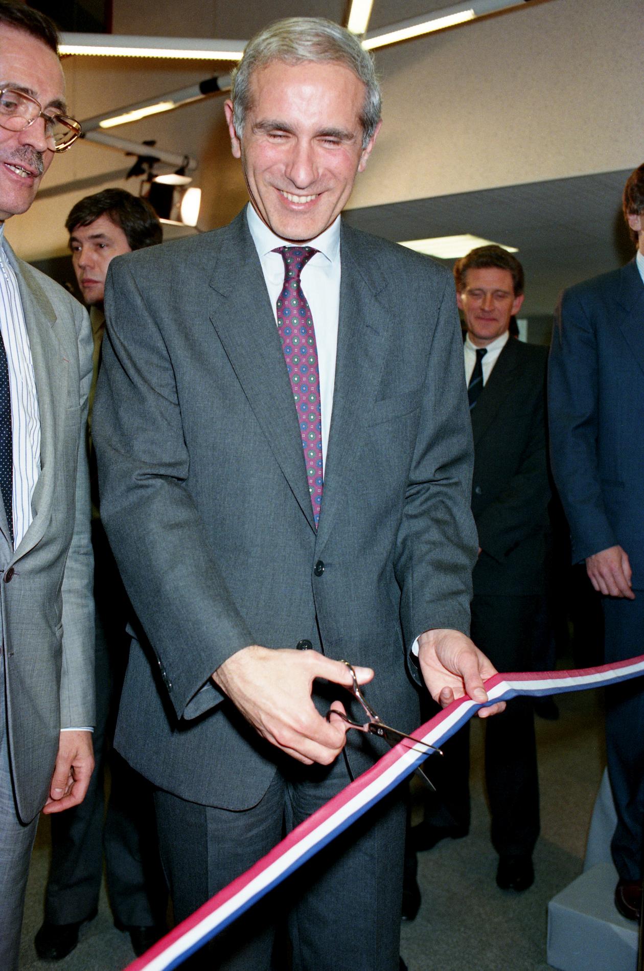 Ci-dessus : M. le Ministre des Postes, Télécommunications et Espace - Paul Quilès inaugure La Ligne SFR, radiotéléphone qui vient concurrencer France-Télécom.